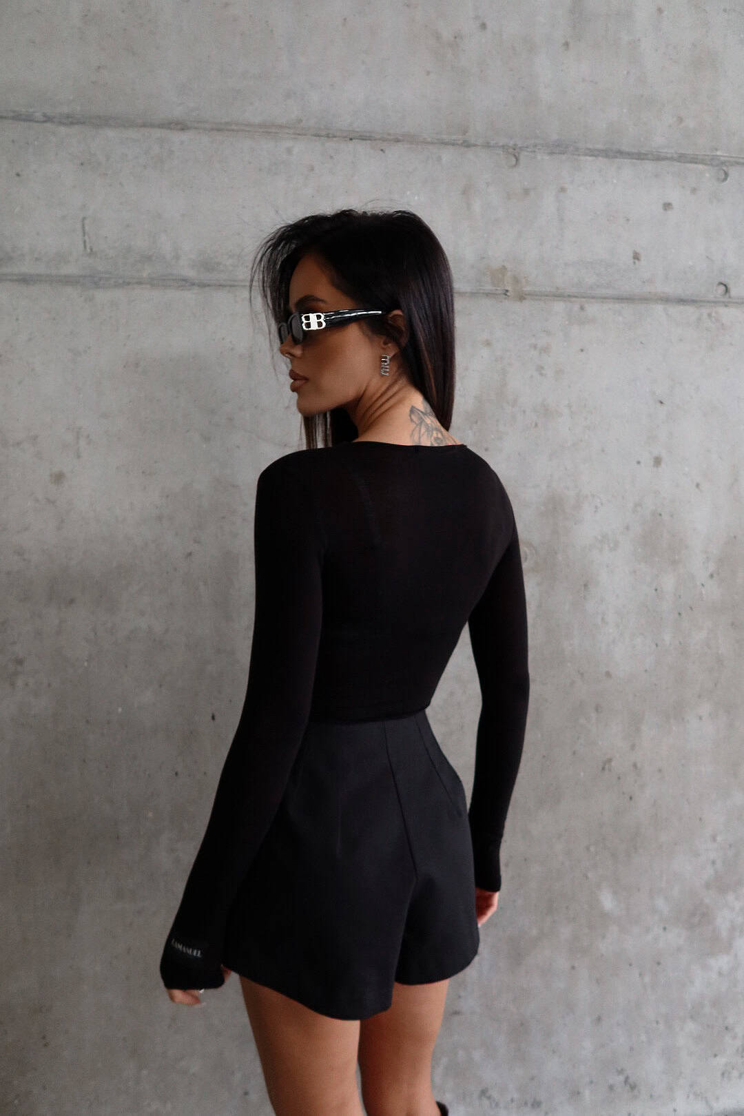 Eleganckie szorty o lekko podwyższonym stanie i minimalistycznym fasonie. Przód z subtelnymi zakładkami, które delikatnie modelują sylwetkę i dodają konstrukcji. Gładki tył bez kieszeni zapewnia czysty, dopracowany wygląd. Model zapinany na kryty suwak z boku, co podkreśla estetykę wykończenia. Idealne zarówno do kompletu z marynarką, jak i osobno – w stylizacjach casualowych lub bardziej eleganckich.Skład: 50% wiskoza 50% bawełna