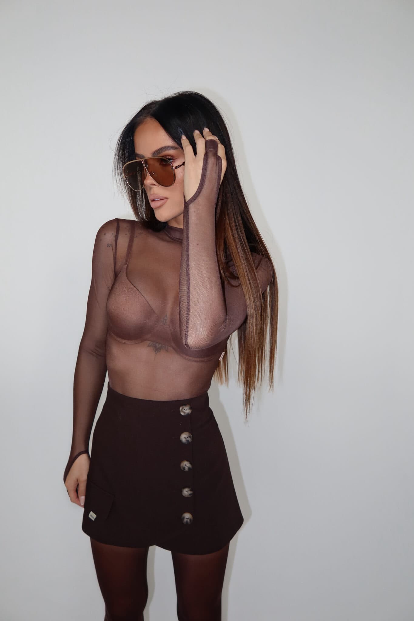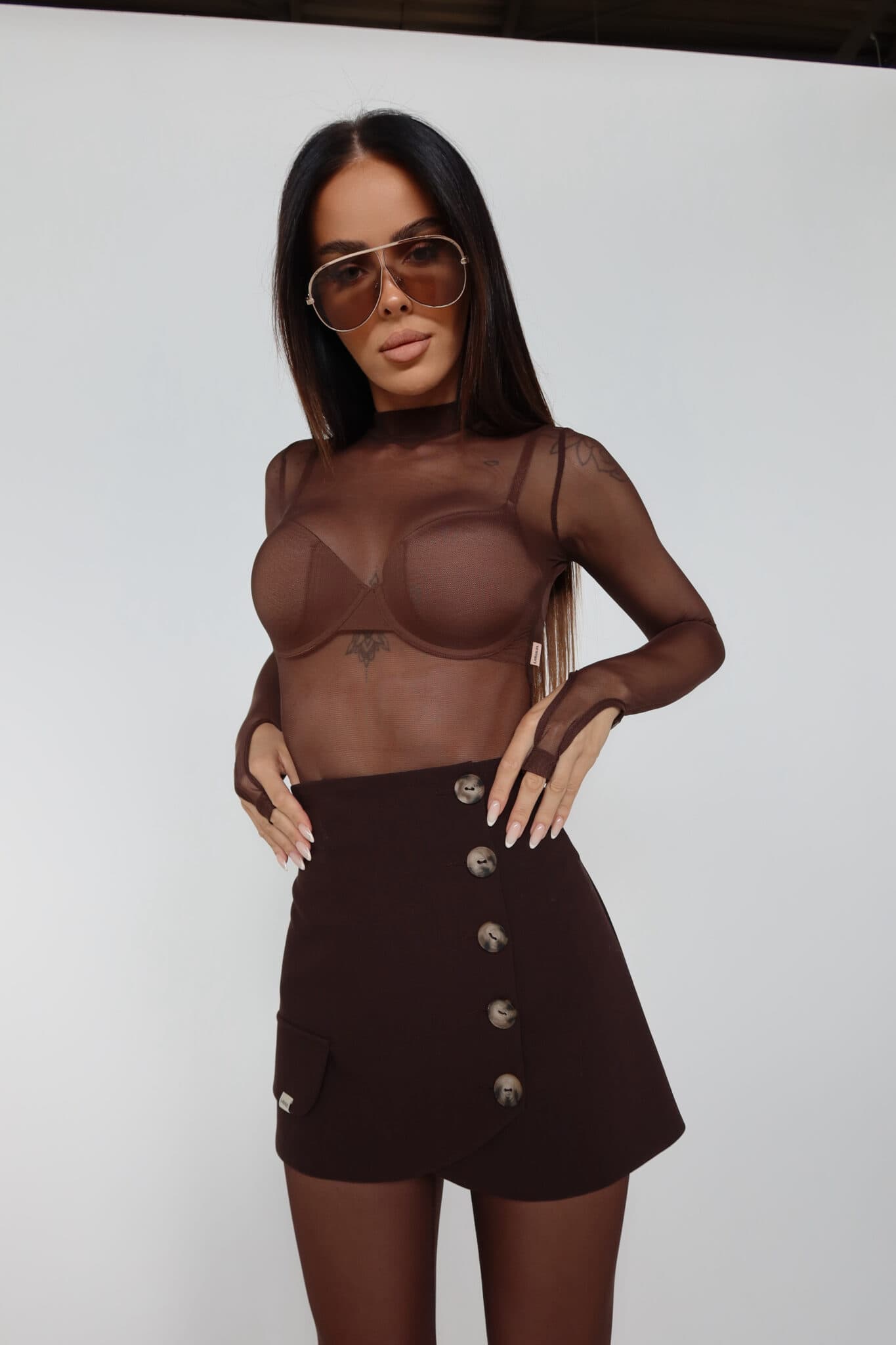 Mini spódnica z wysokim stanem i efektownym zapięciem na duże, ozdobne guziki wzdłuż asymetrycznej zakładki. Lekko zaokrąglony dół podkreśla nogi, a dopracowana konstrukcja pięknie układa się na biodrach. Z boku kieszonka z klapką i subtelną metką brandingową. Model idealny do stylizacji z kozakami, rajstopami lub koszulową górą – kobieca, ale z nutą miejskiego pazura. Sprawdzi się zarówno na co dzień, jak i w bardziej eleganckich setach.Skład: 80% poliester 15% rayon 5% spandex