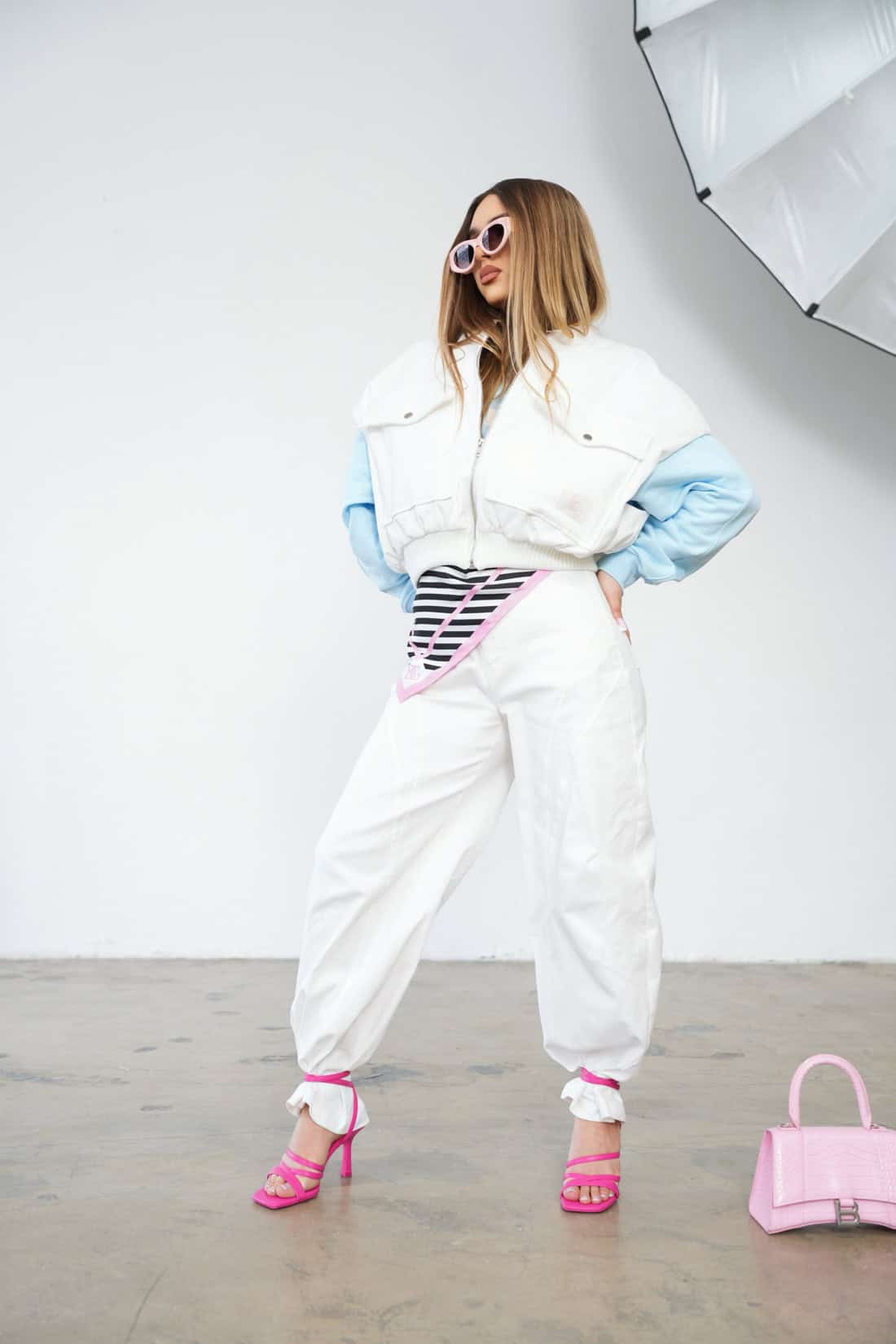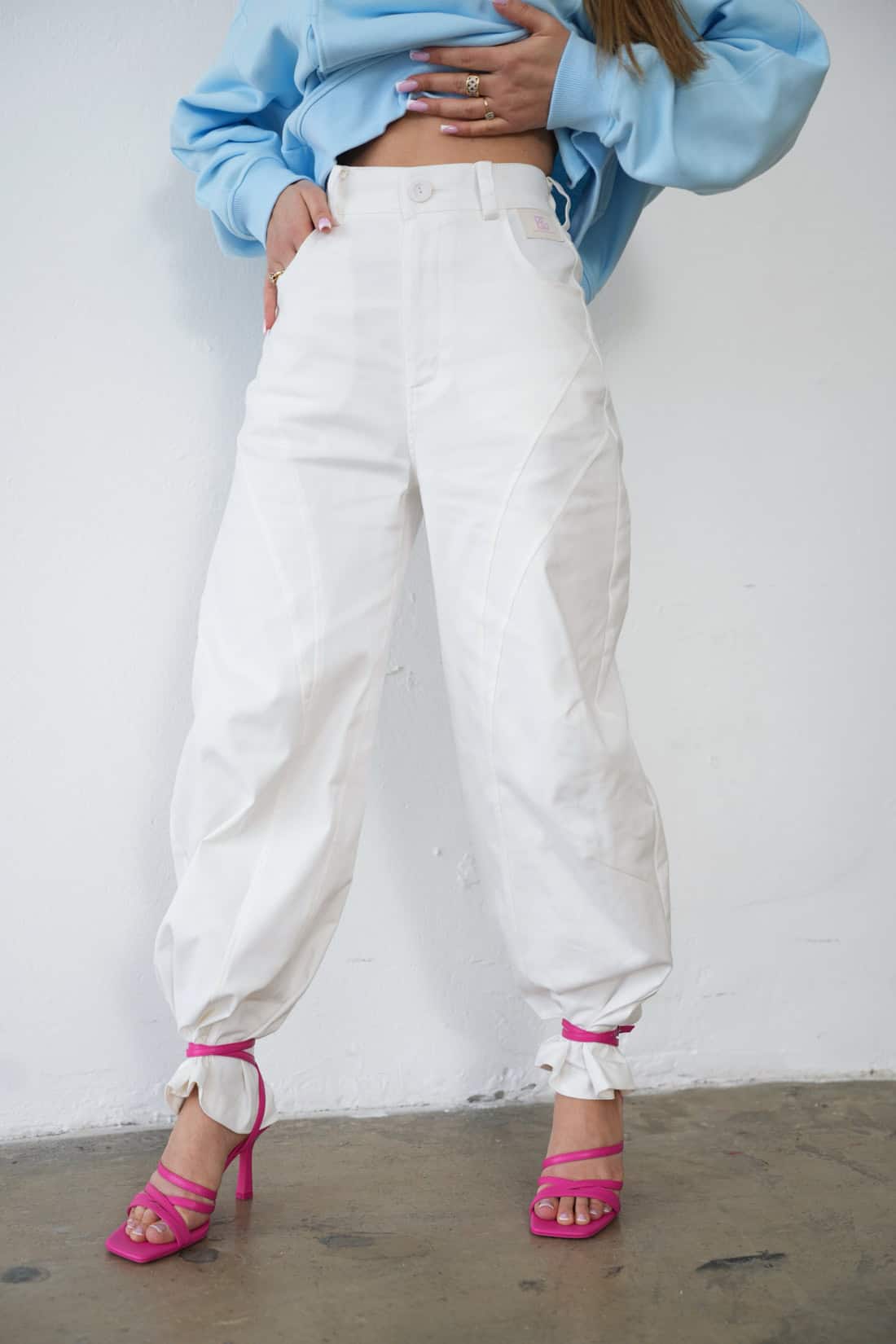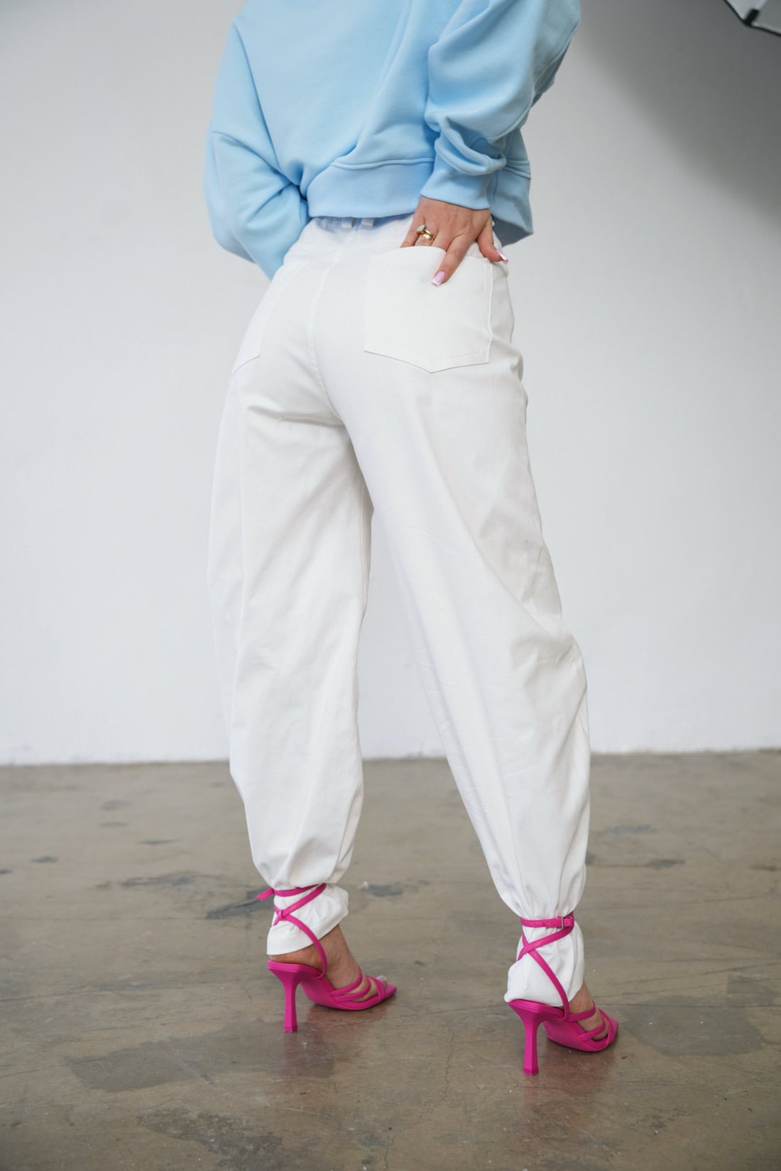 Opis produktu: Spodnie BG GINNY z bawełnianego jeansu. Spodnie o balonowym kroju z ozdobnymi przeszyciami na przodzie. Spodnie zapinane na suwak oraz guzik. Dodatkowo z tyłu w pasku gumka umożliwiająca regulację i lepsze dopasowanie rozmiaru. Dodatkowo szlufki. W lewej kieszeni pod paskiem naszywka z logo marki BG Brandenburg Couture.