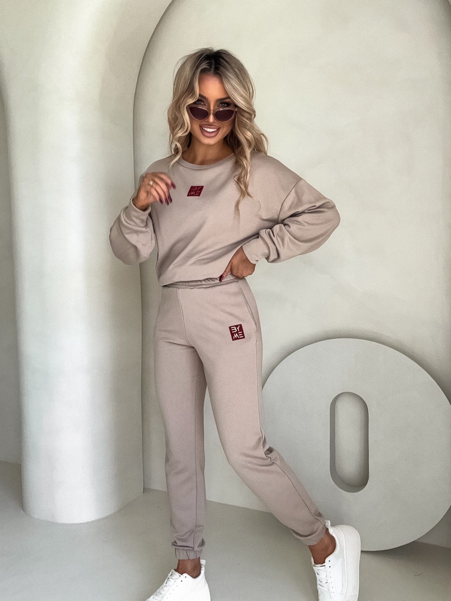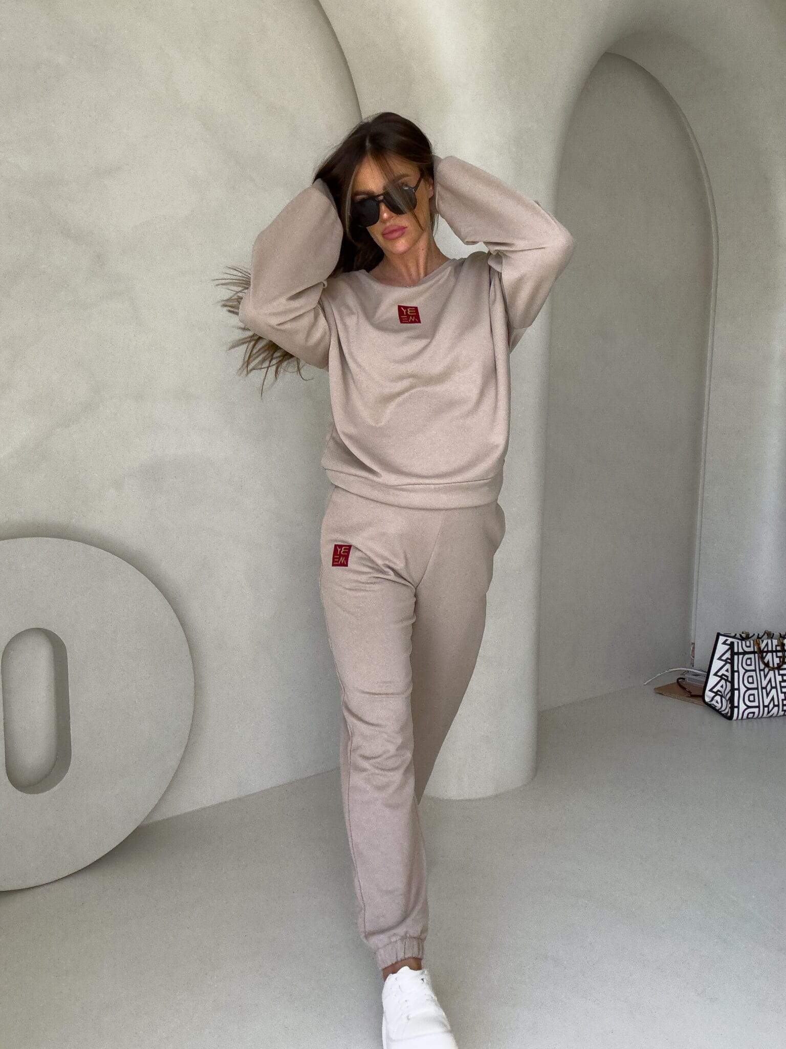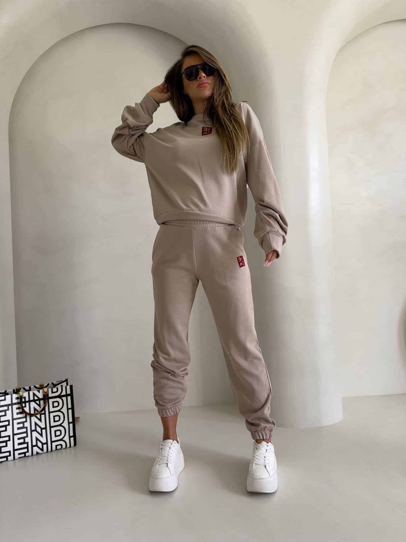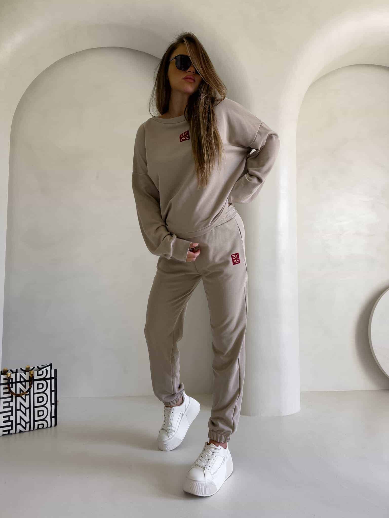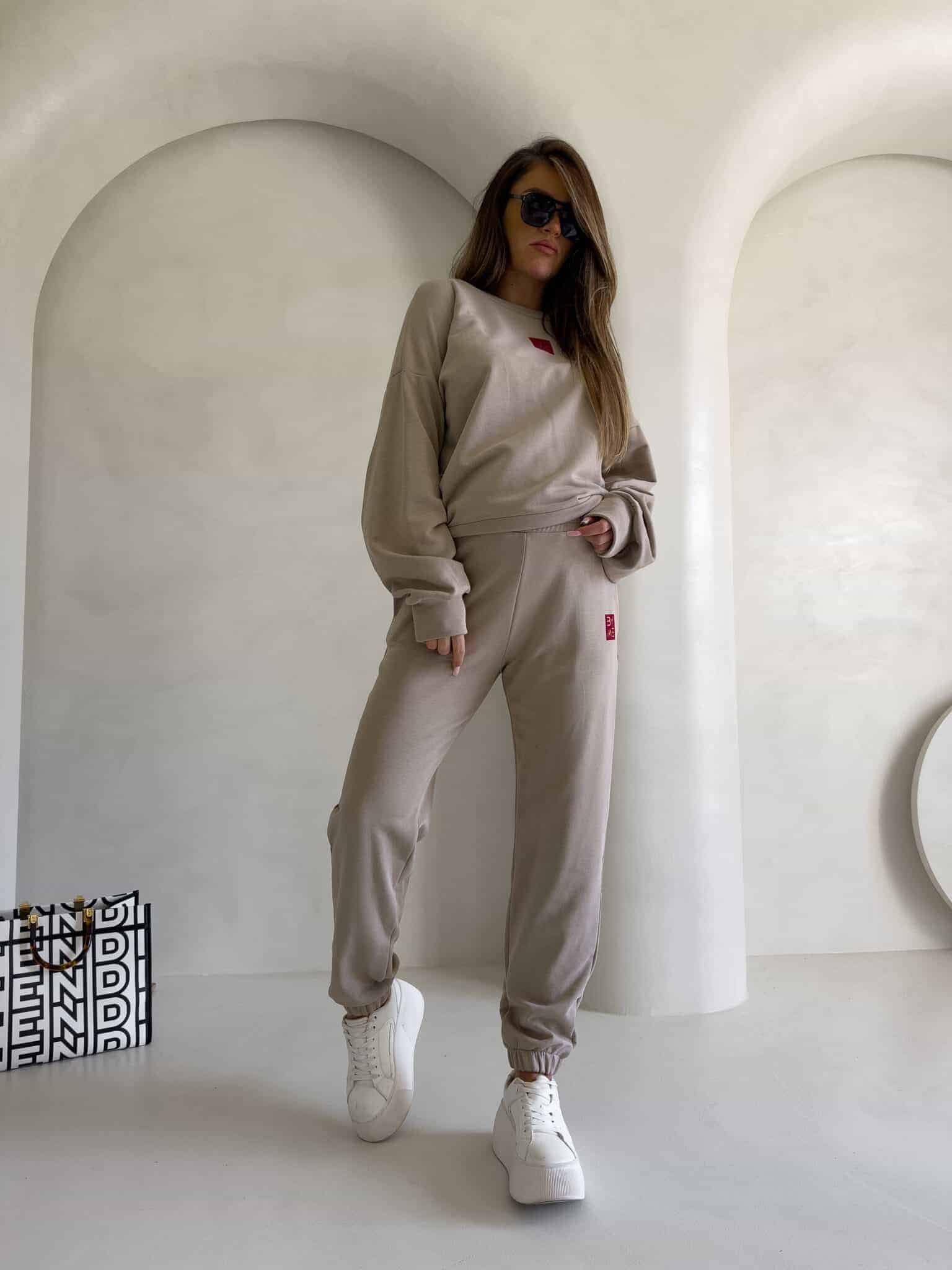 Spodnie dresowe – dopasowane, z elastycznym pasem w talii i ściągaczami na dole nogawek. Ich krój podkreśla sylwetkę, zachowując jednocześnie pełną swobodę ruchów.