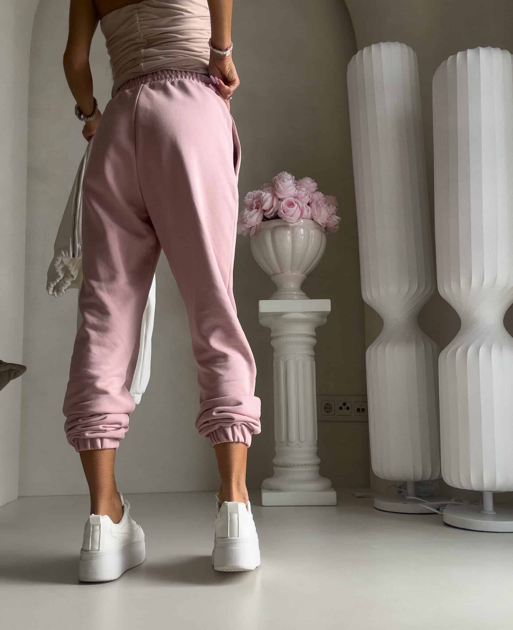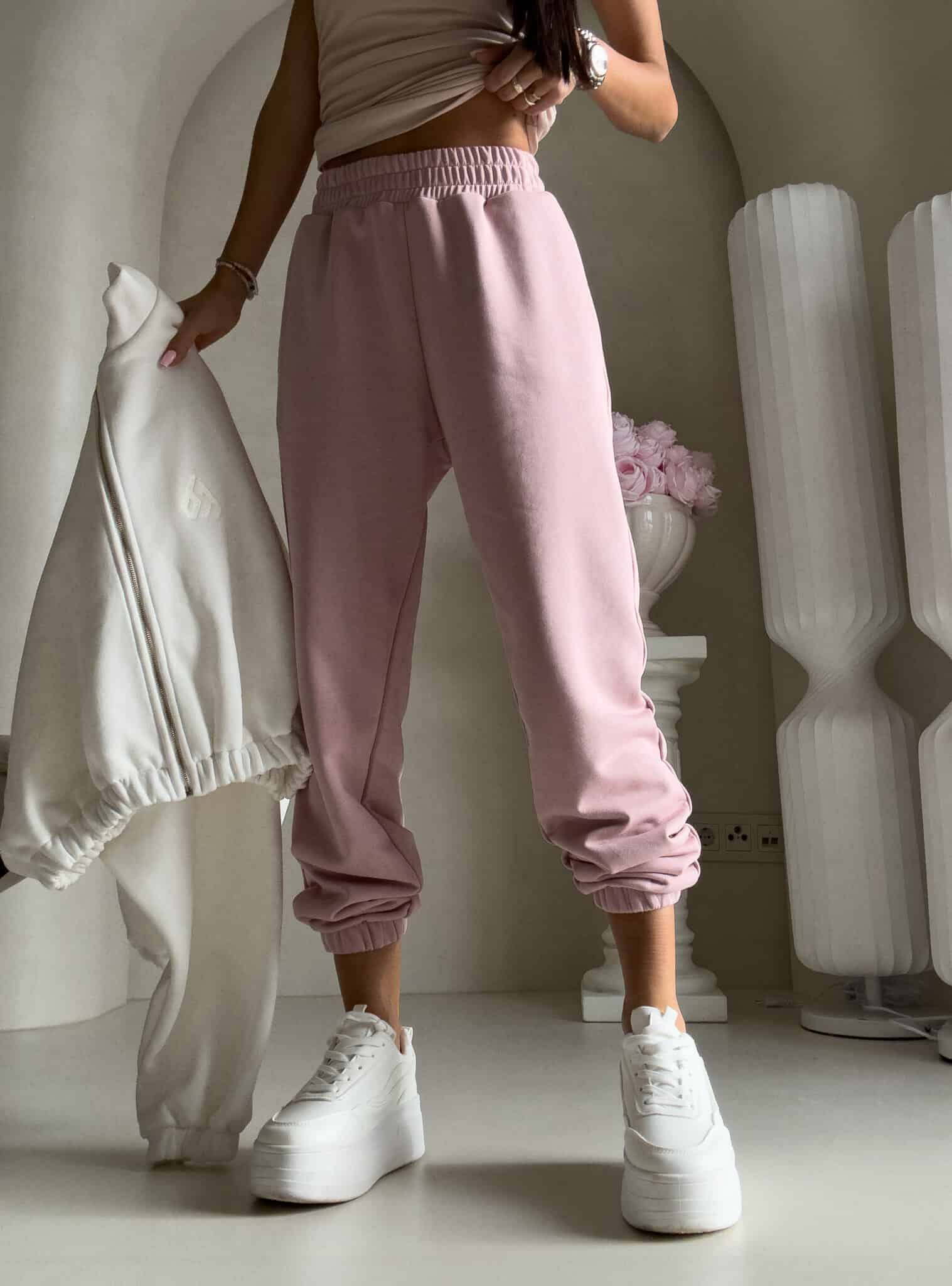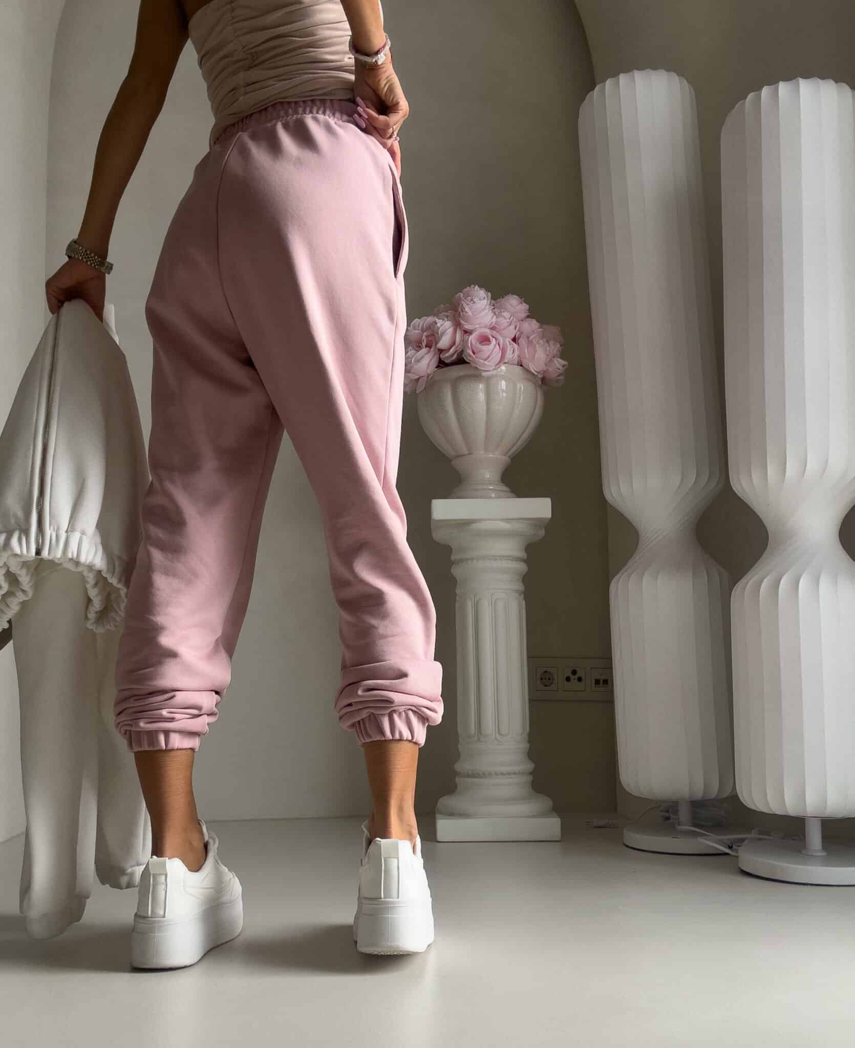 Spodnie dresowe – dopasowane, z elastycznym pasem w talii i ściągaczami na dole nogawek. Ich krój podkreśla sylwetkę, zachowując jednocześnie pełną swobodę ruchów.