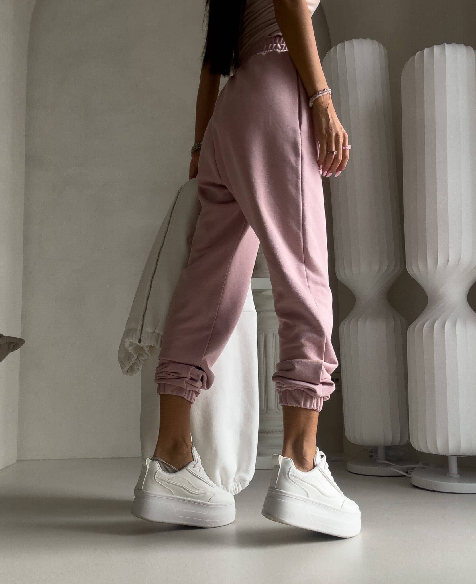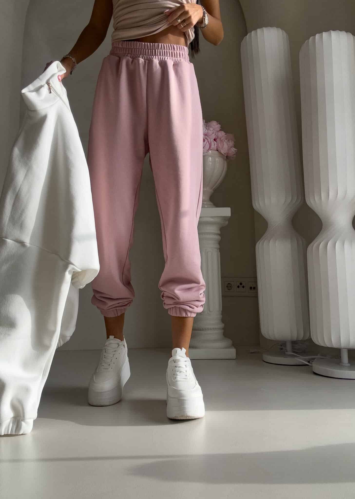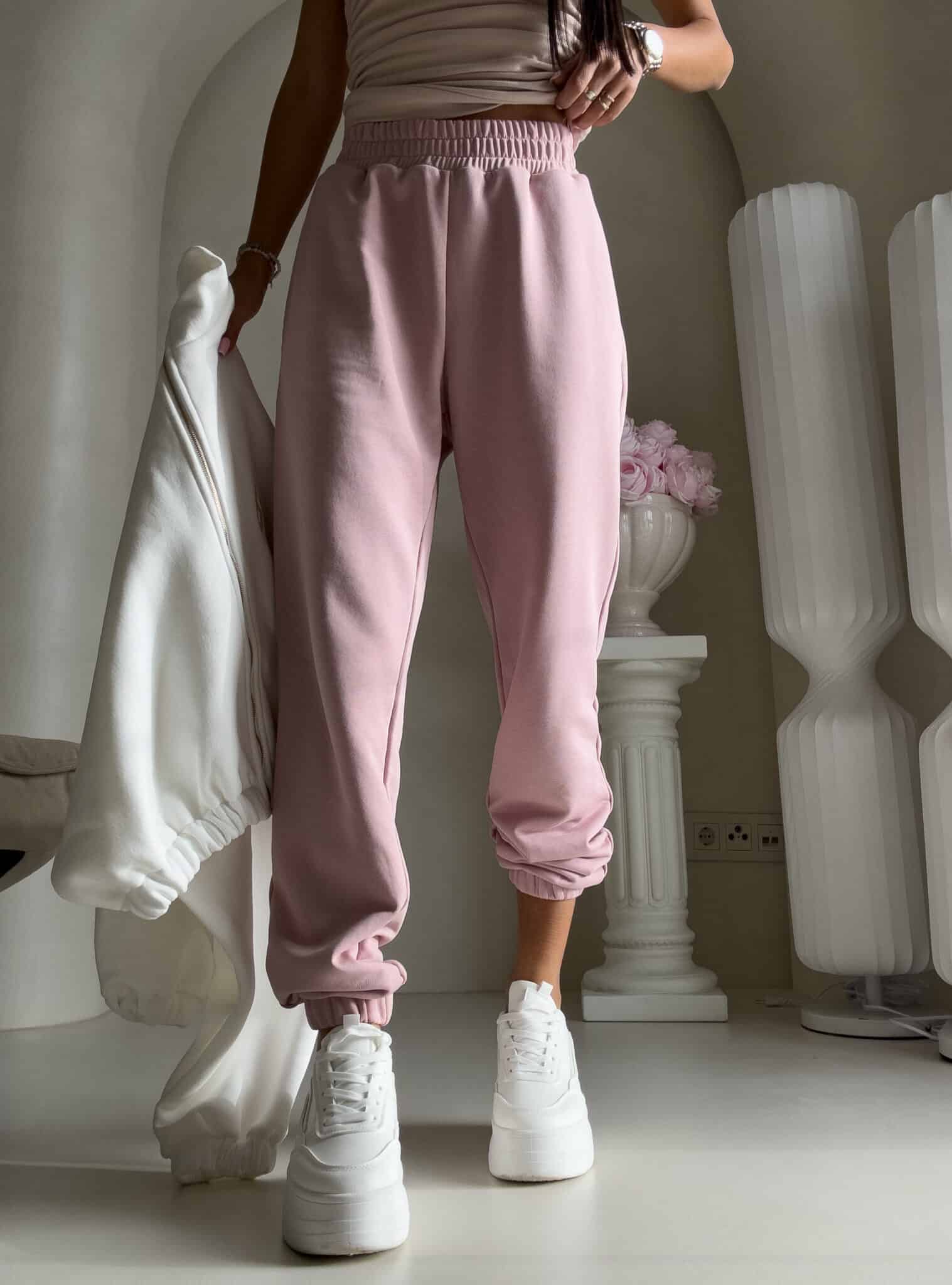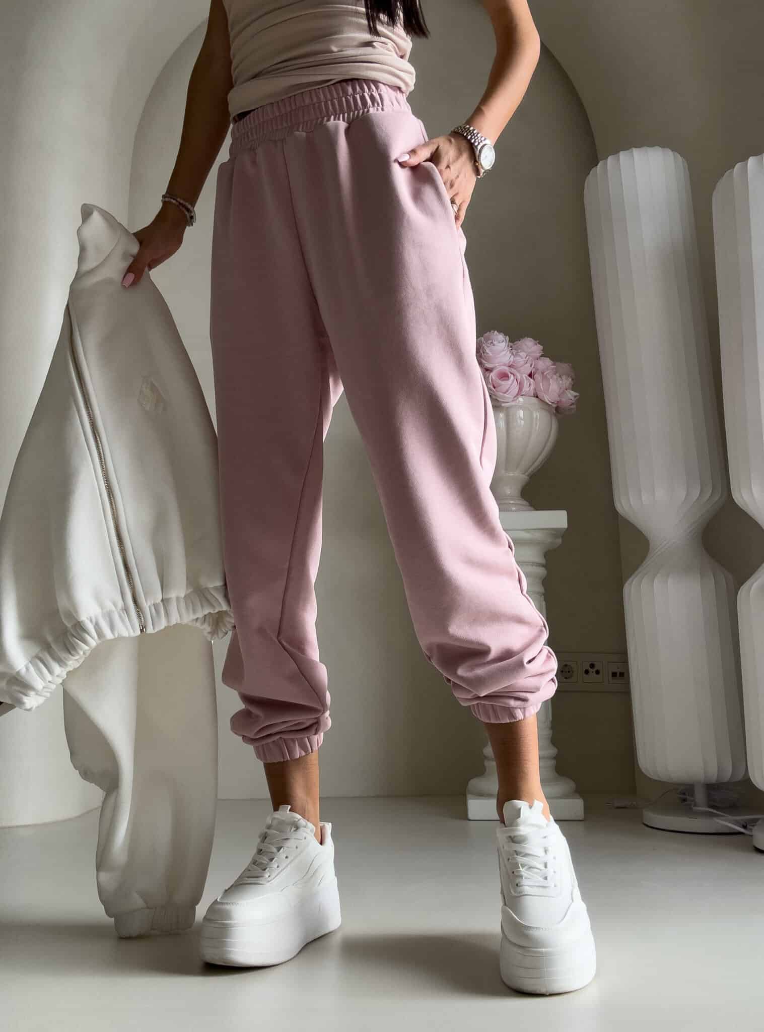 Spodnie dresowe – dopasowane, z elastycznym pasem w talii i ściągaczami na dole nogawek. Ich krój podkreśla sylwetkę, zachowując jednocześnie pełną swobodę ruchów.