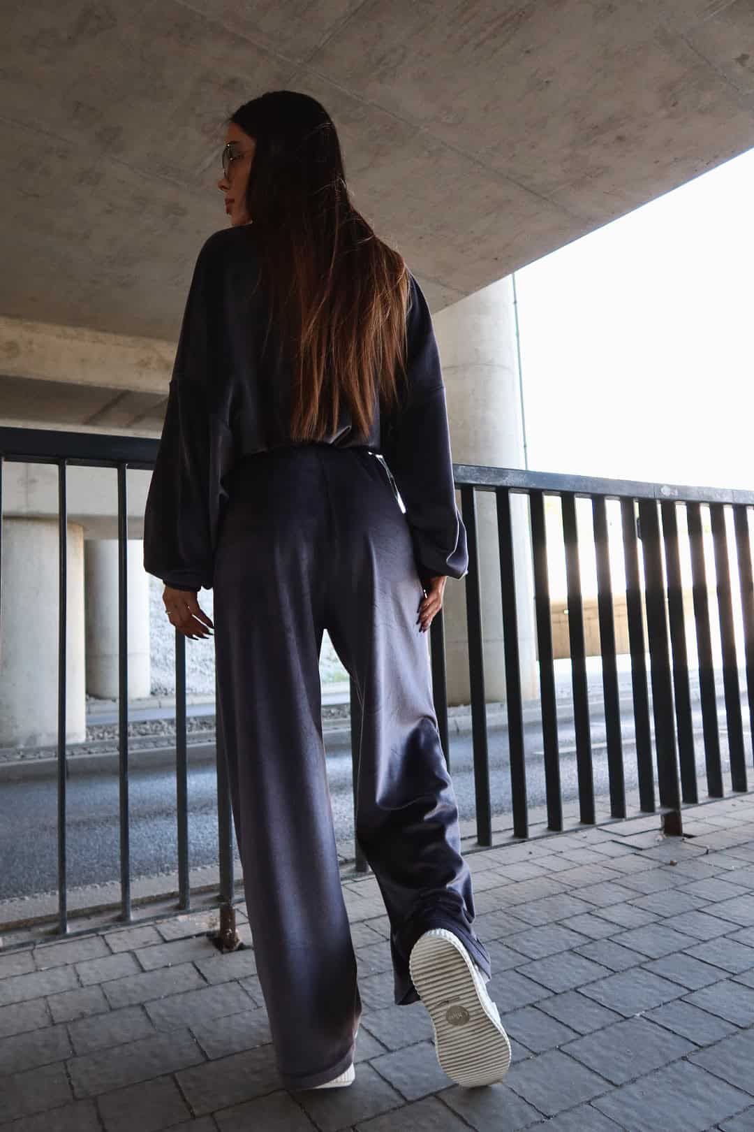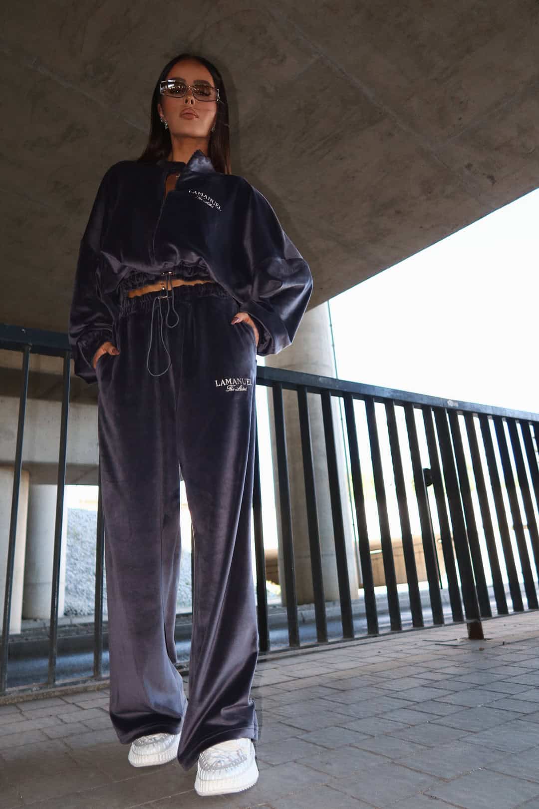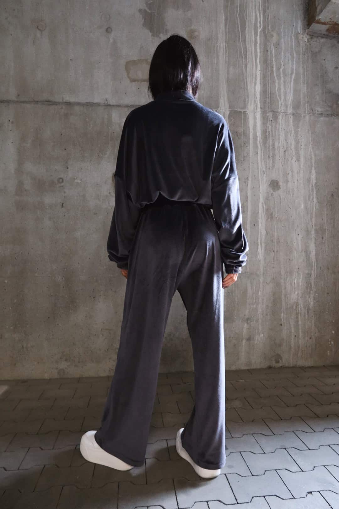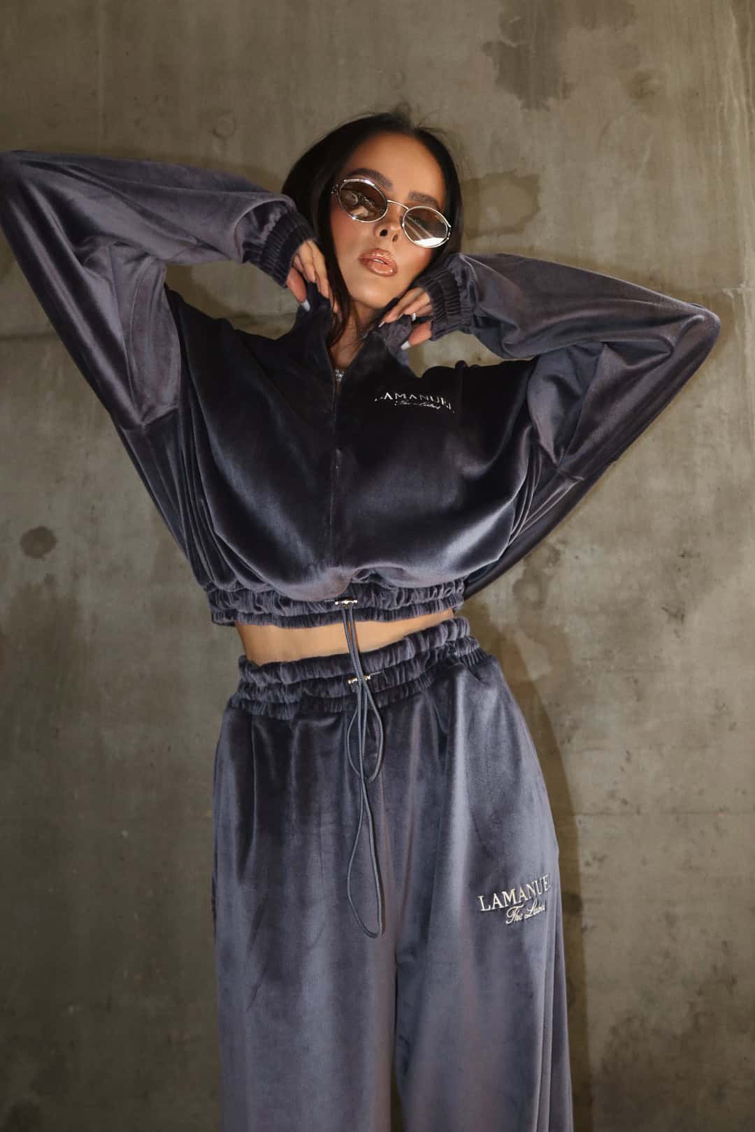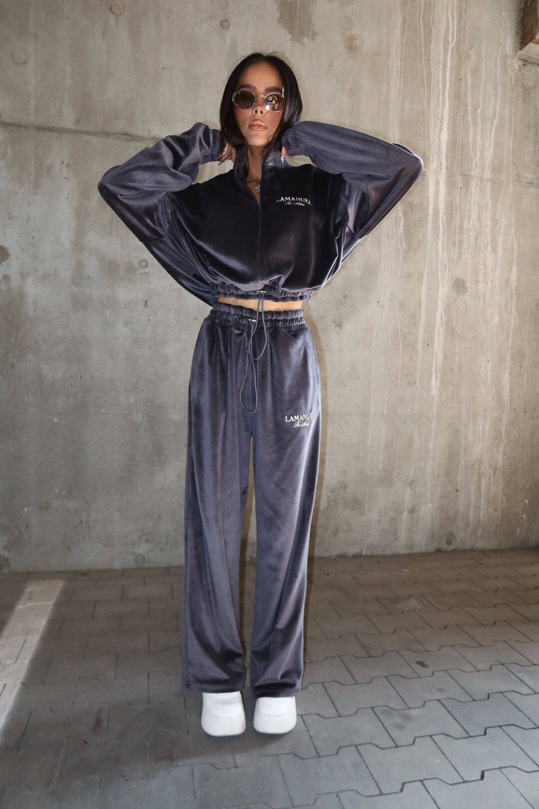 Luźne spodnie z wysokim stanem, wykonane z miękkiego weluru. Elastyczna talia z troczkiem gwarantuje wygodę i dopasowanie niezależnie od typu figury. Model one size, który świetnie leży na różnych sylwetkach — od smukłych po bardziej krągłe. Tworzą idealny zestaw z pasującą bluzą.Skład: 95% poliester 5% elastan