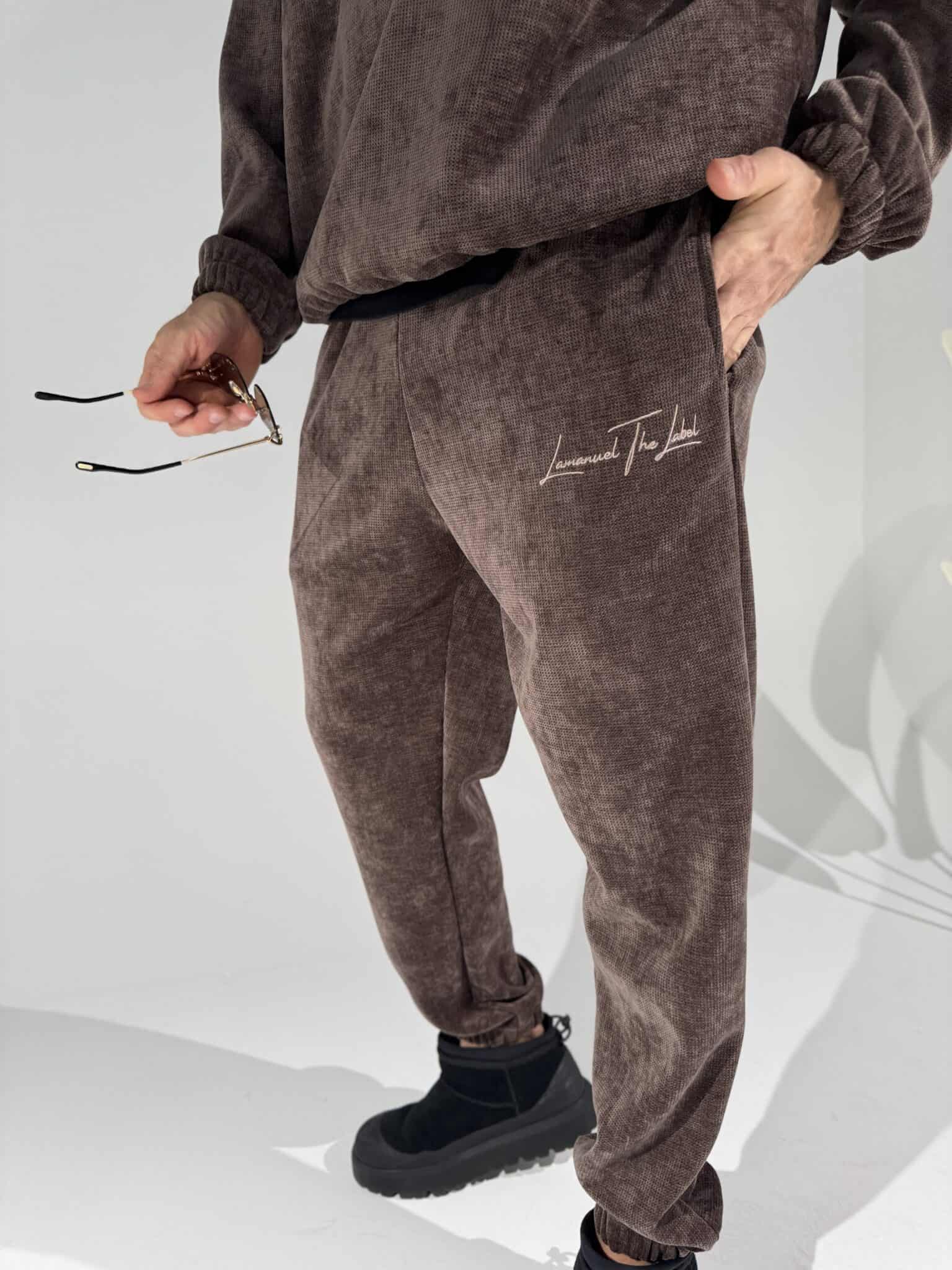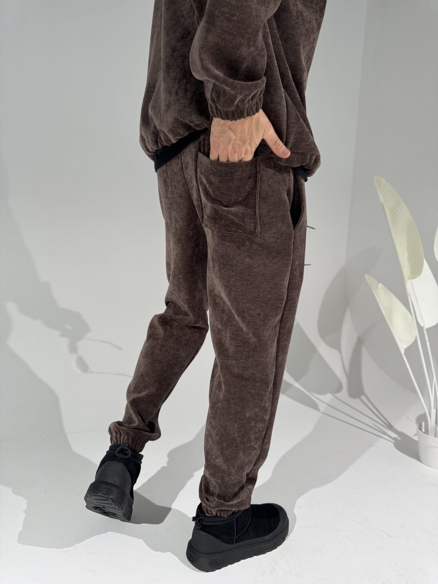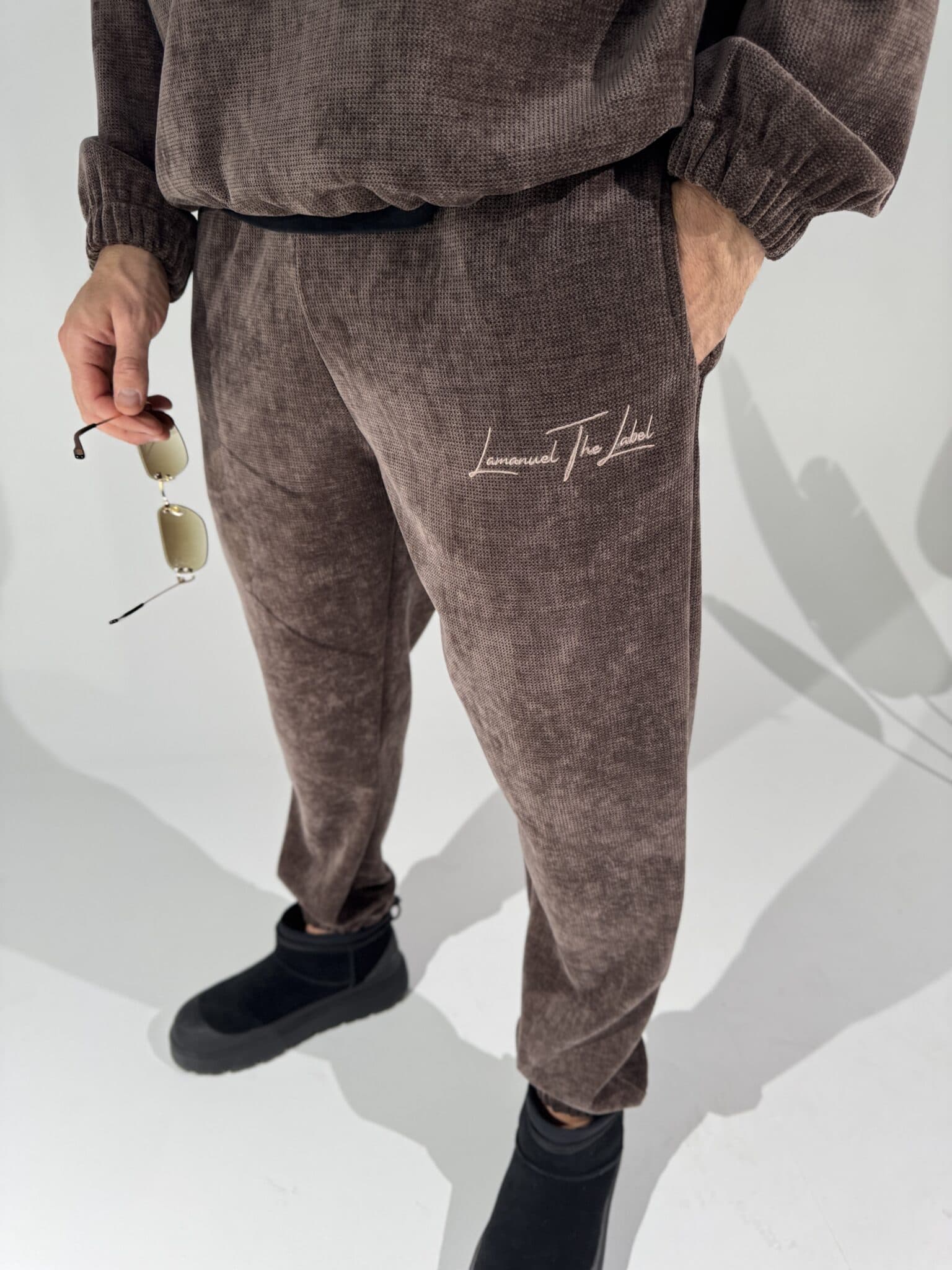 Grubszy, puszysty welur, który sprawia, że nie masz ochoty ich zdejmować. Nogawki ze ściągaczami, wygodna talia z regulacją, luźny fason. To spodnie, które pasują do wszystkiego: do domowego chilloutu, na weekendowy wyjazd, do spacerów po zaśnieżonym deptaku. Wyglądają swobodnie, ale nie byle jak. Po prostu mają klimat.Skład: 95% poliester 5% elastan