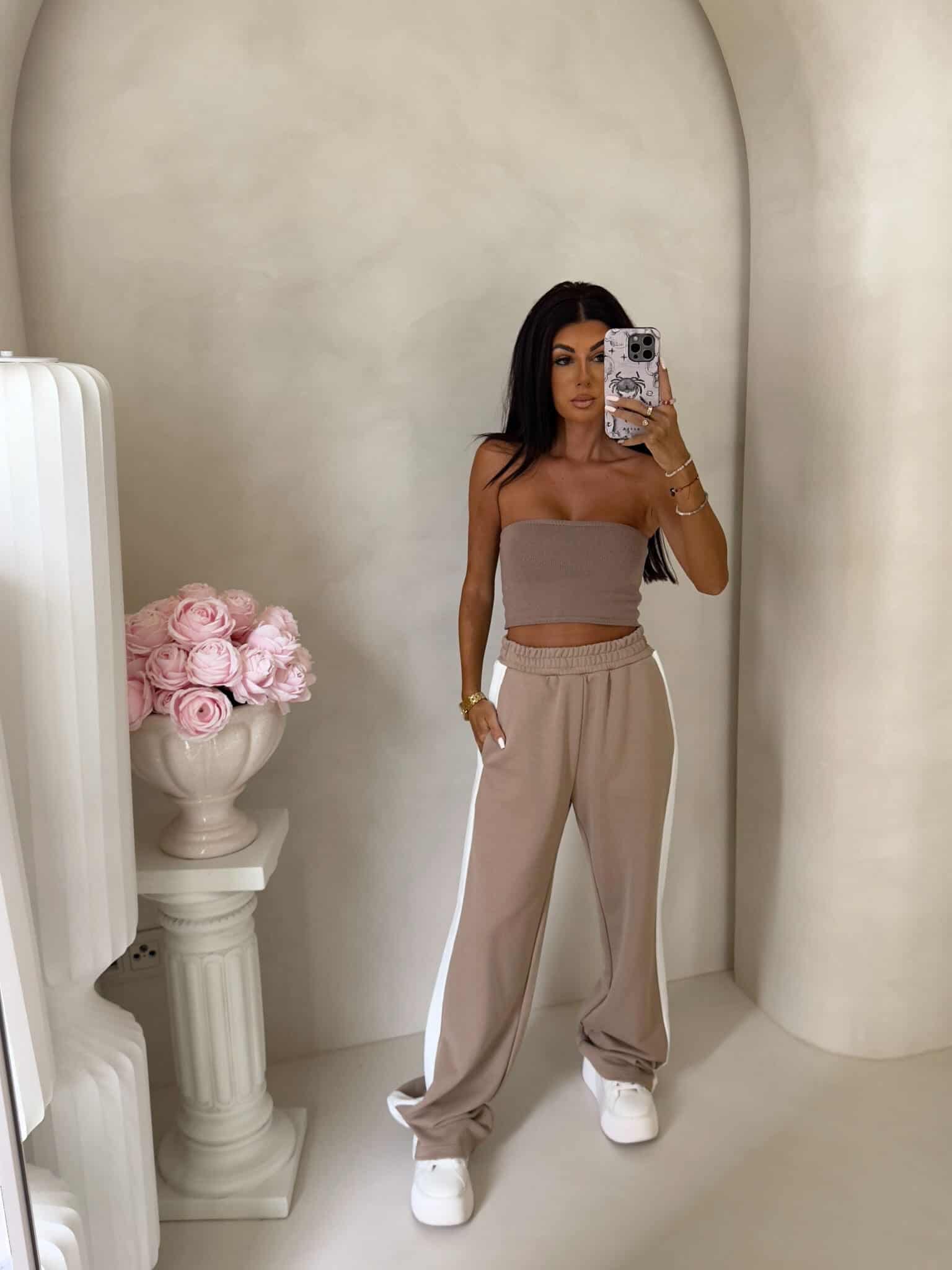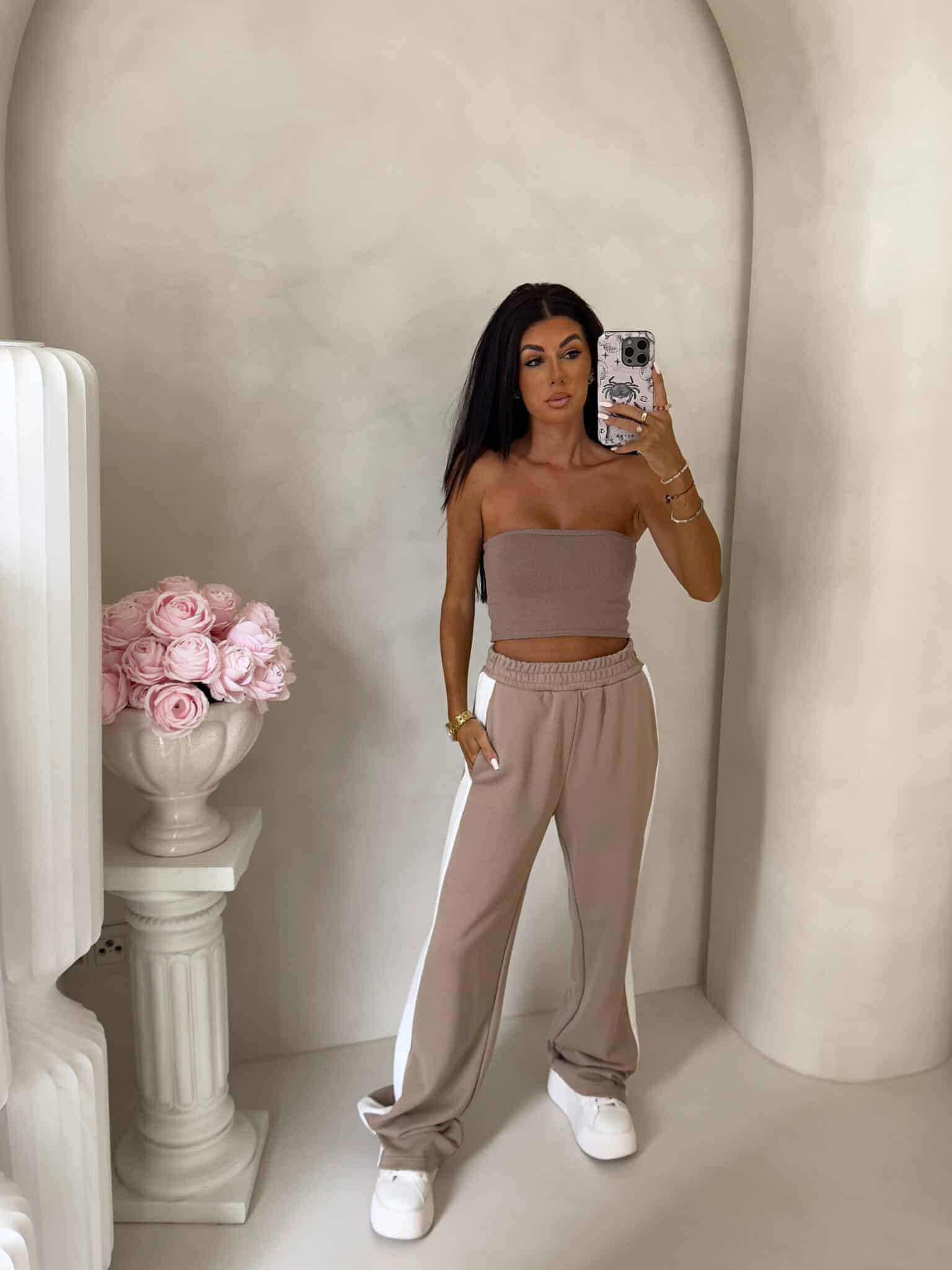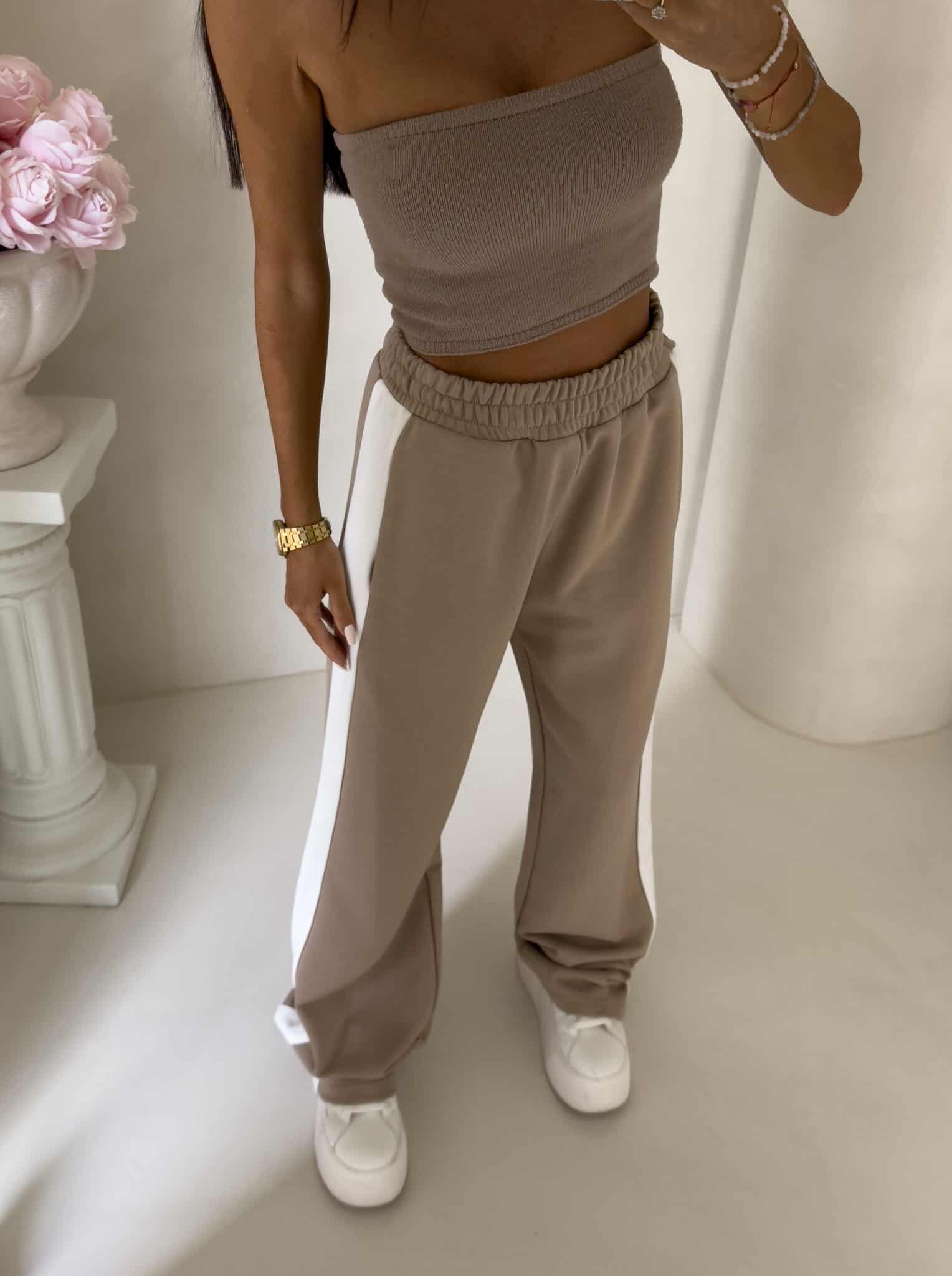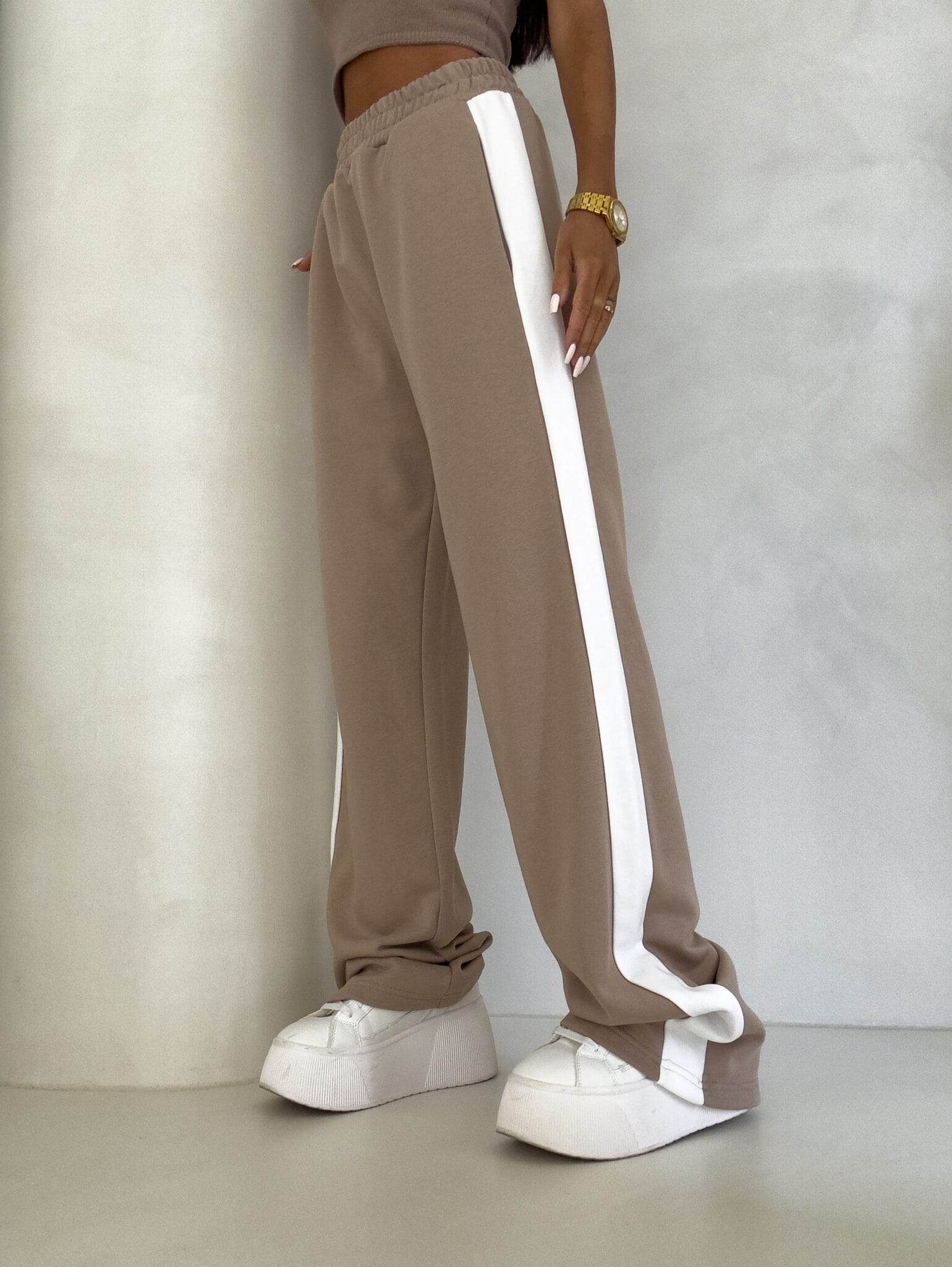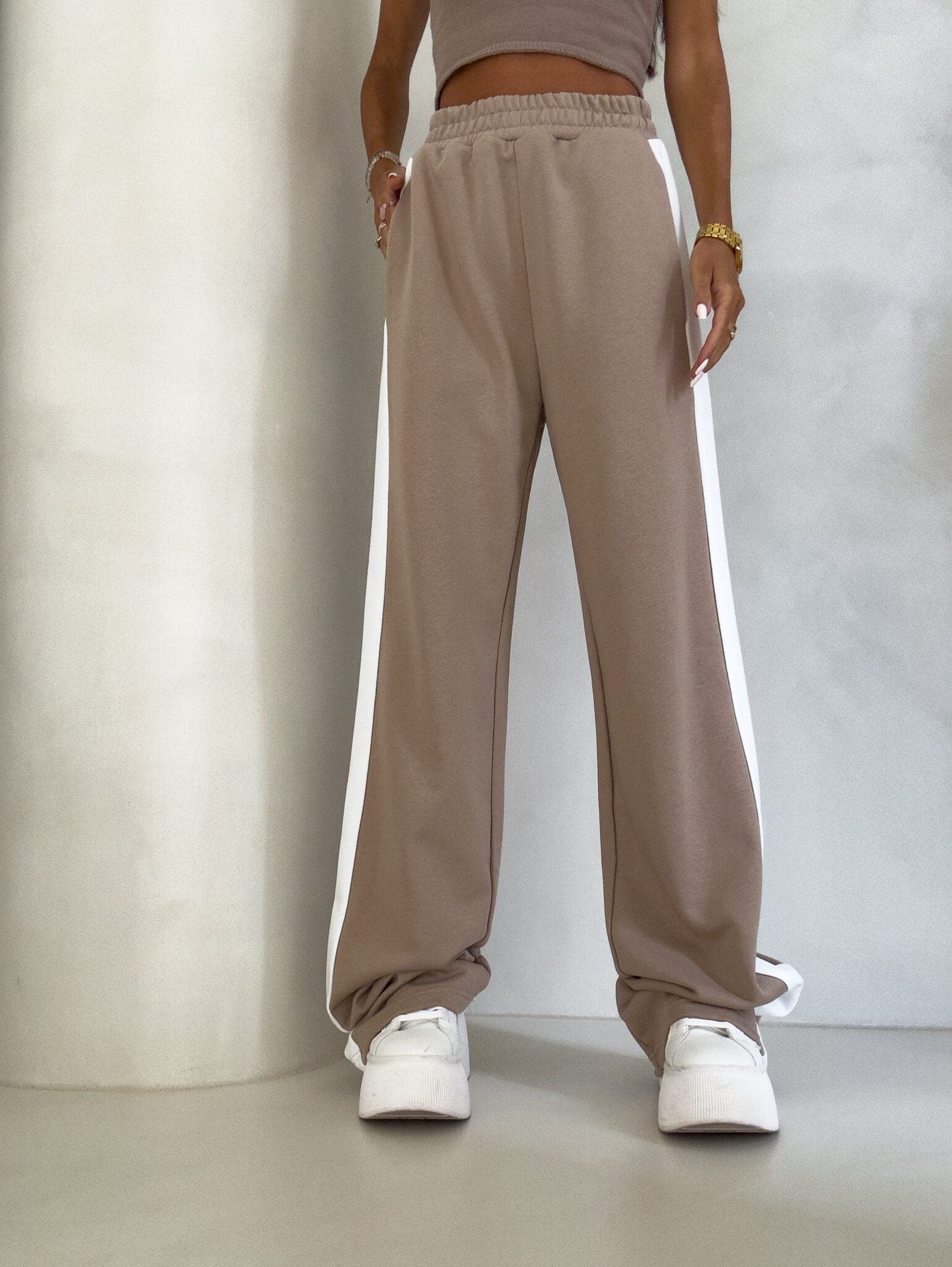 Luźne spodnie dresowe z szerokimi nogawkami to idealne połączenie komfortu i swobodnego stylu. Wykonane z miękkiego materiału, mają prosty krój i szerokie nogawki, które zapewniają maksymalną wygodę i pełną swobodę ruchów. W pasie znajduje się elastyczna gumka, dzięki której spodnie dopasowują się do sylwetki, nie uciskając. Dodatkowym detalem jest lampas biegnący wzdłuż obu zewnętrznych stron nogawek, który nadaje spodniom sportowego, a zarazem nowoczesnego charakteru.