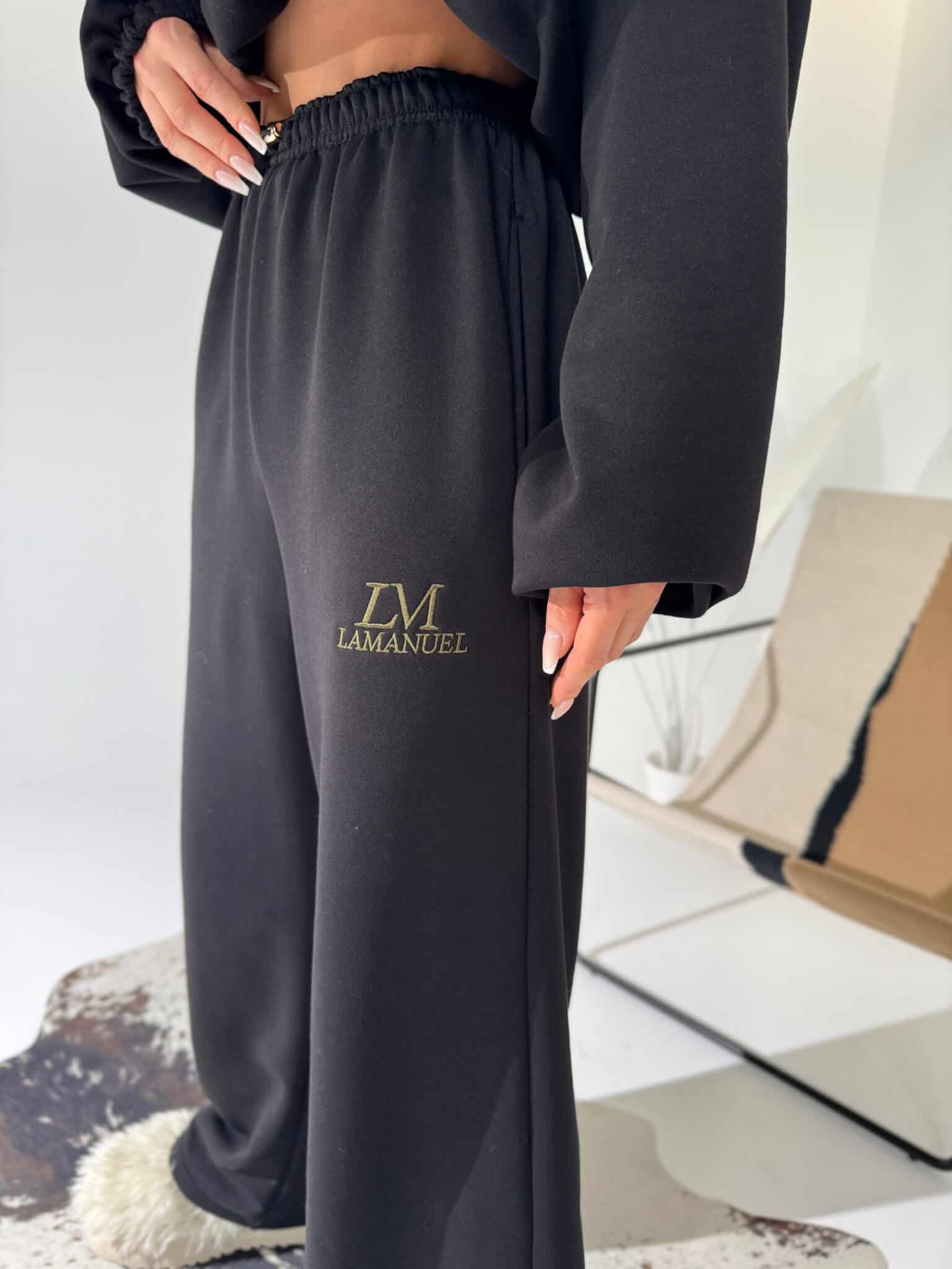 Luźne, wygodne spodnie z prostą nogawką i elastycznym pasem. Złoty detal w talii dodaje im lekkiego wyrafinowania, a haft z logo podkreśla charakter marki. Idealne do noszenia na co dzień – solo albo w komplecie.Skład: 90% bawełna 10% poliester