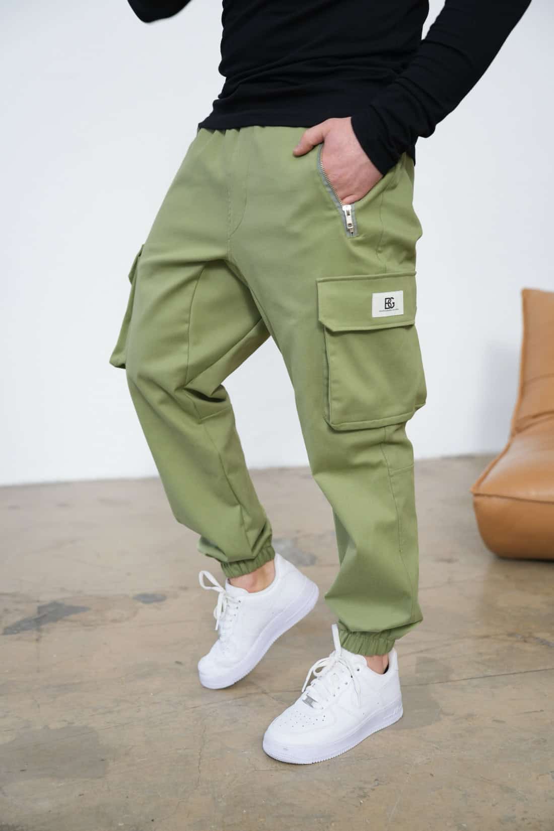 Opis produktu: Spodnie męskie BG DEAL z wysokiej jakości bawełnianego jeasnu. Spodnie posiadają gumkę w pasie oraz sznurek do wiązania od wewnętrznej strony. Duże kieszenie bojówkowe po bokach oraz na przodzie dwie kieszenie zapinane na suwaki. Na lewej patce kieszeni ozdobna naszywka z logo marki BG Brandenburg Couture. Mankiety zakończone gumką.