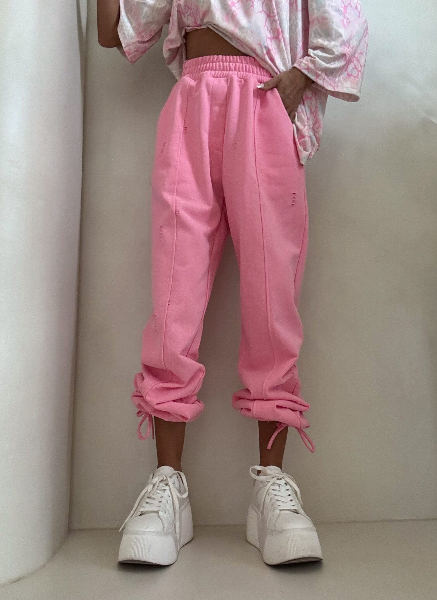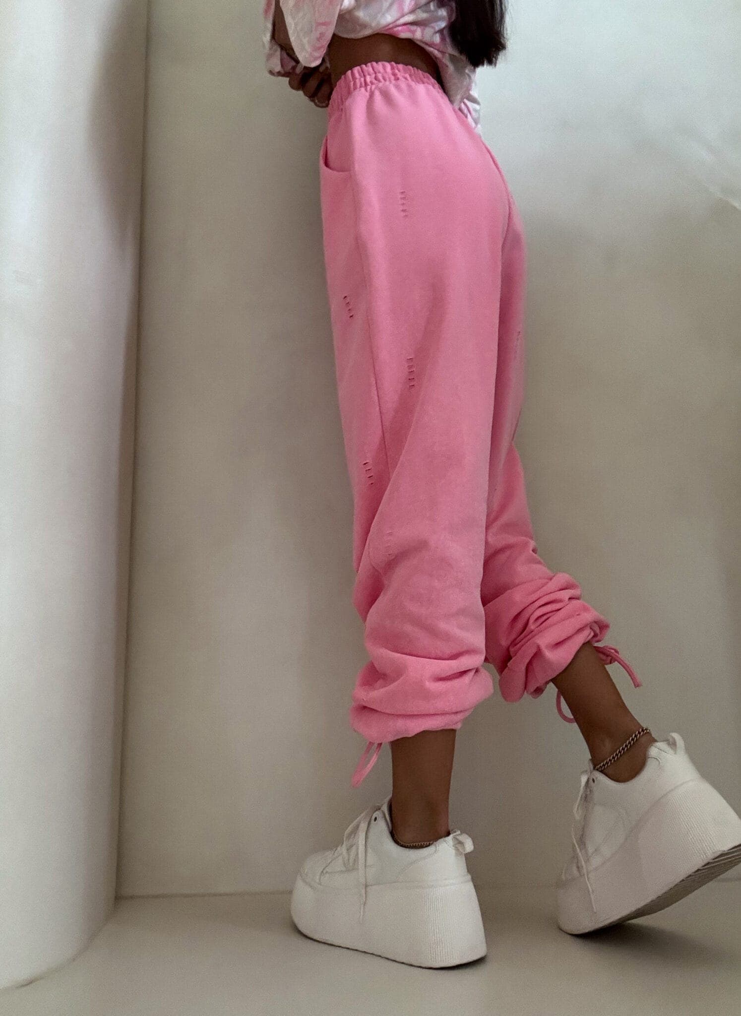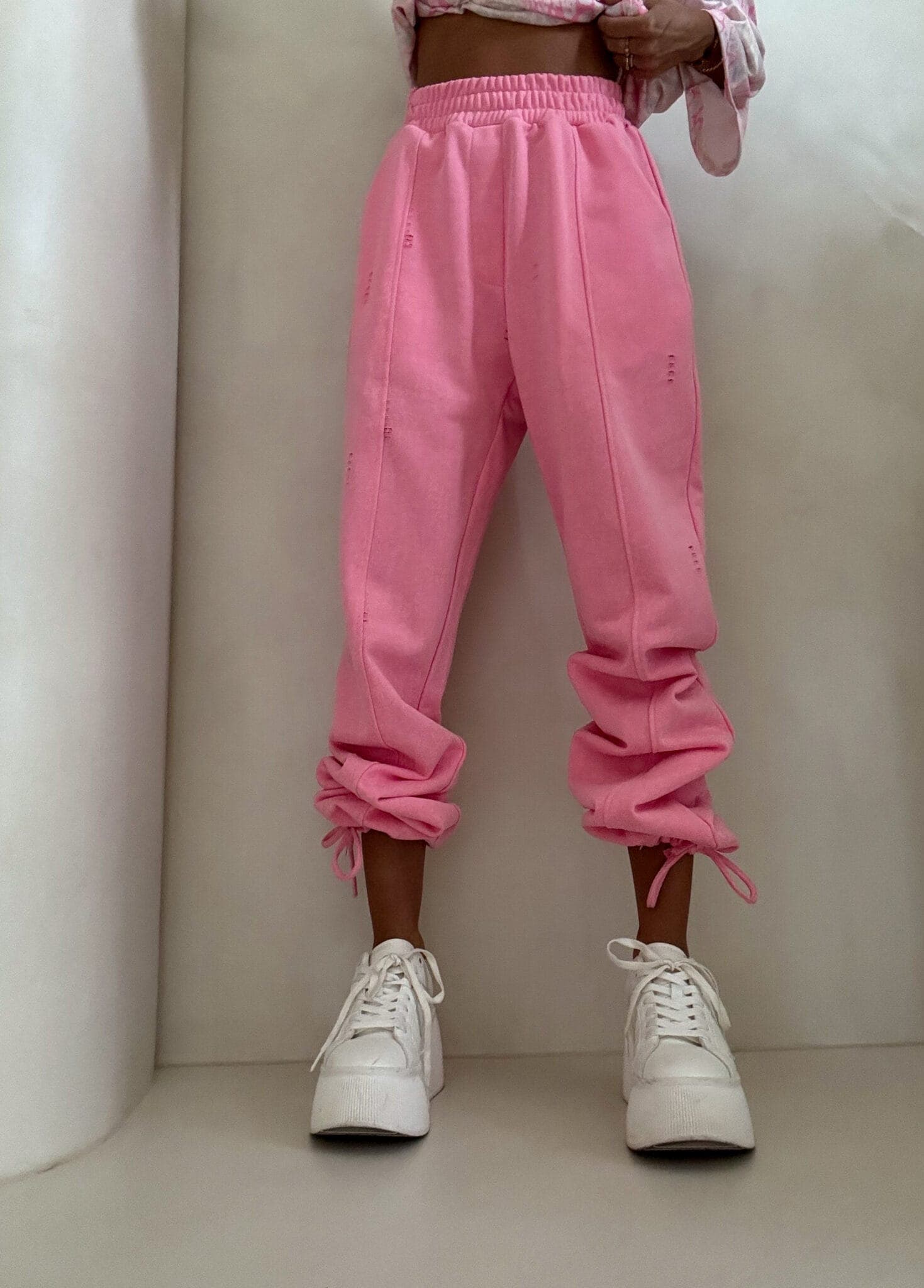 Spodnie o wysokim stanie z elastyczną gumką w pasie, zapewniającą komfort i dobre dopasowanie. Model z szerokimi nogawkami zakończonymi ściągaczami, które umożliwiają regulację długości. Z przodu widoczne pionowe przeszycia. Całość uzupełniają delikatne przetarcia i subtelne dziurki.