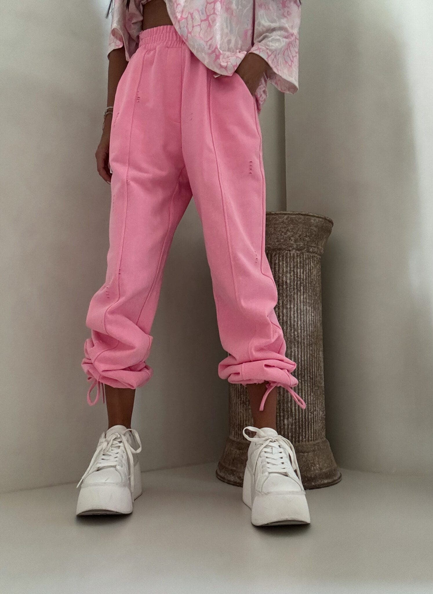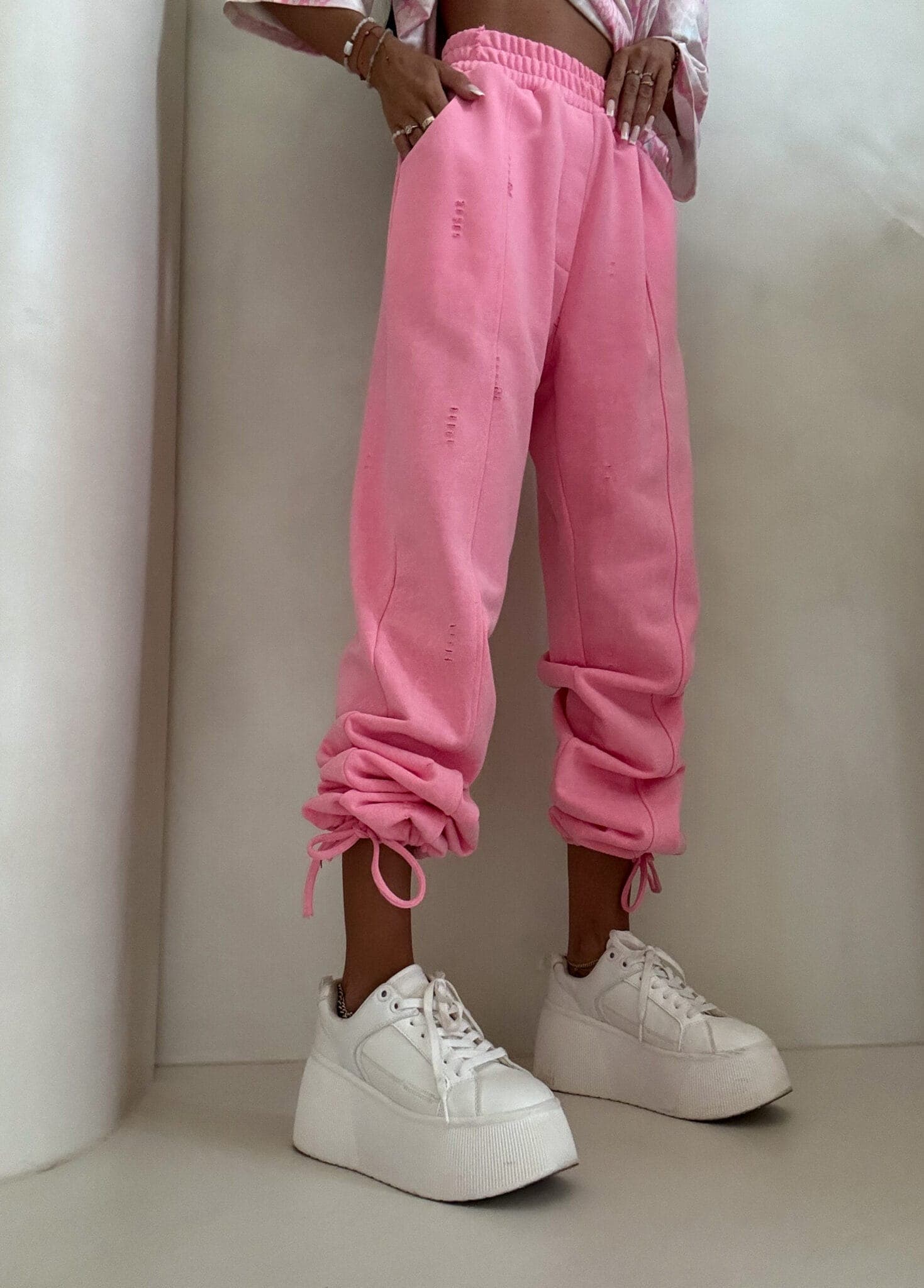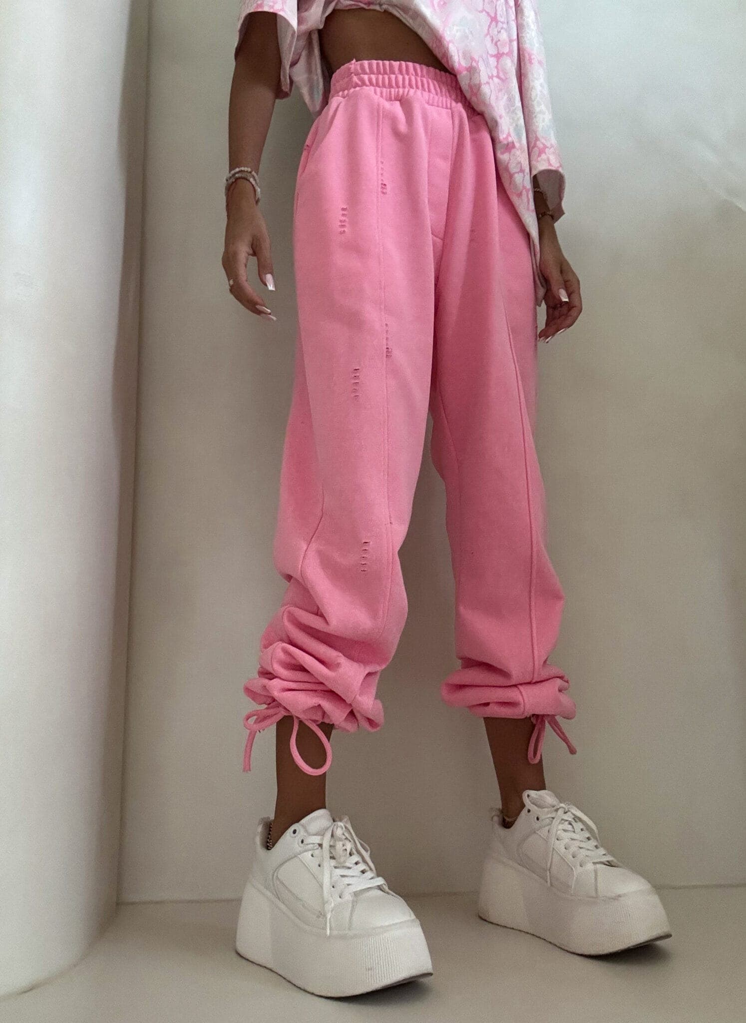 Spodnie o wysokim stanie z elastyczną gumką w pasie, zapewniającą komfort i dobre dopasowanie. Model z szerokimi nogawkami zakończonymi ściągaczami, które umożliwiają regulację długości. Z przodu widoczne pionowe przeszycia. Całość uzupełniają delikatne przetarcia i subtelne dziurki.
