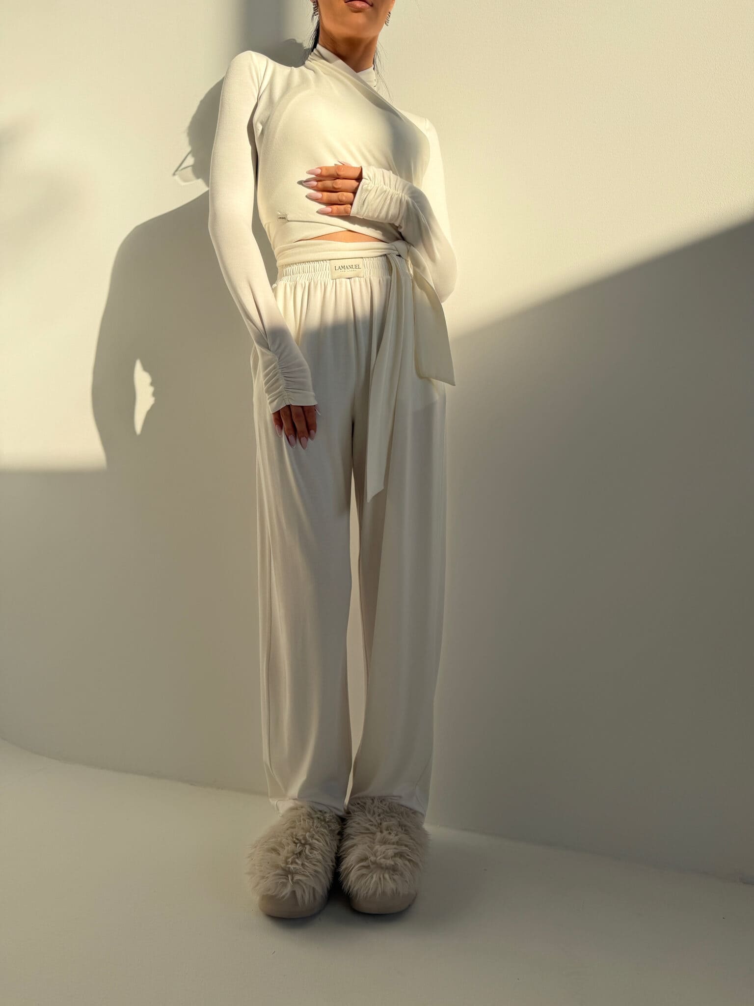 Luźne spodnie z przyjemnej w dotyku wiskozy, wykończone elastyczną gumą w pasie. Boczne kieszenie i prosta nogawka tworzą wygodny, codzienny krój, który łatwo zestawić z innymi elementami garderoby. Na przodzie – naszywana metka lamanuel. Uniwersalna baza do wielu stylizacji – świetnie wyglądają w komplecie z dopasowanym topem z tej samej kolekcji.Skład: 95% wiskoza 5% elastan