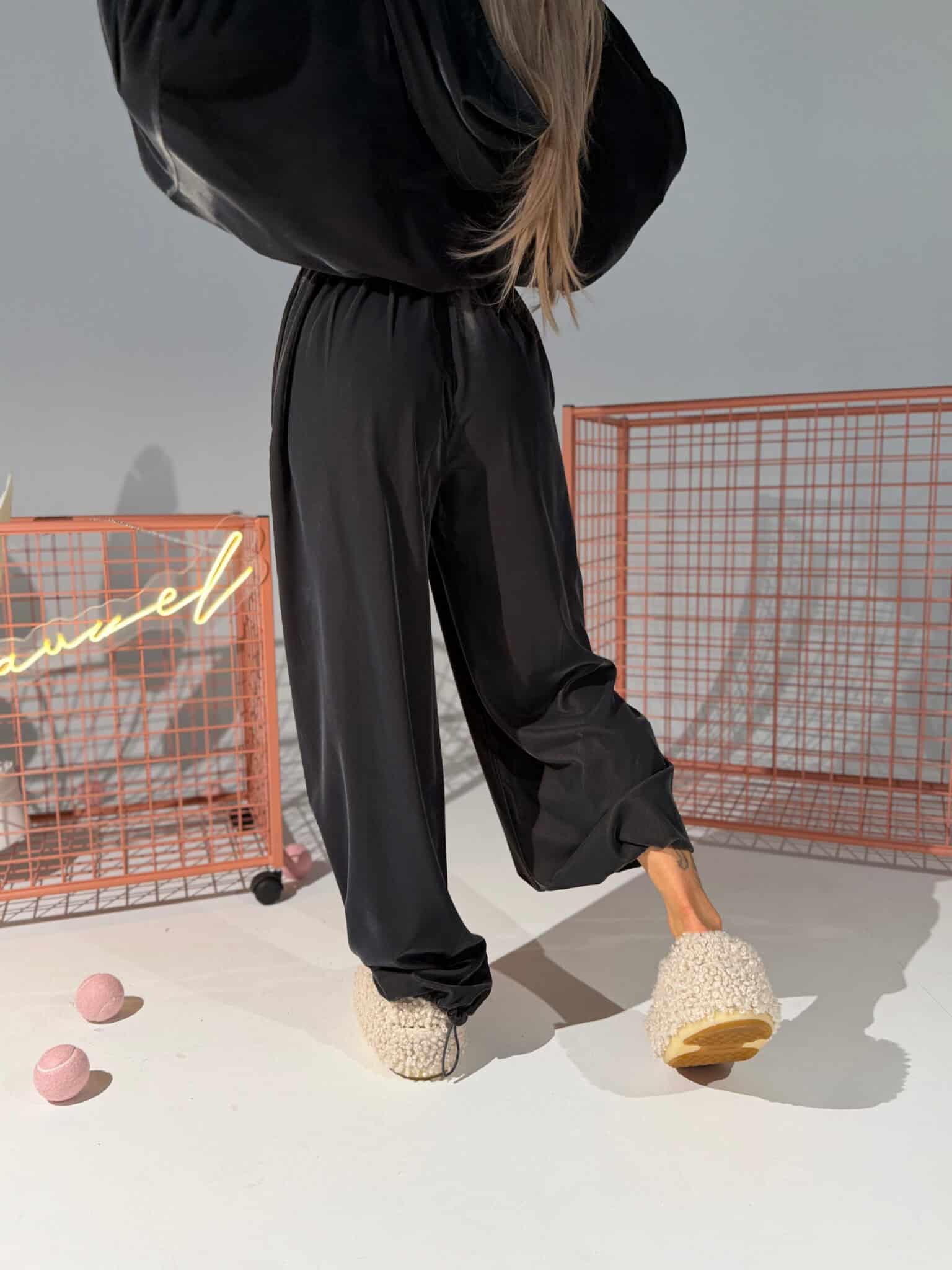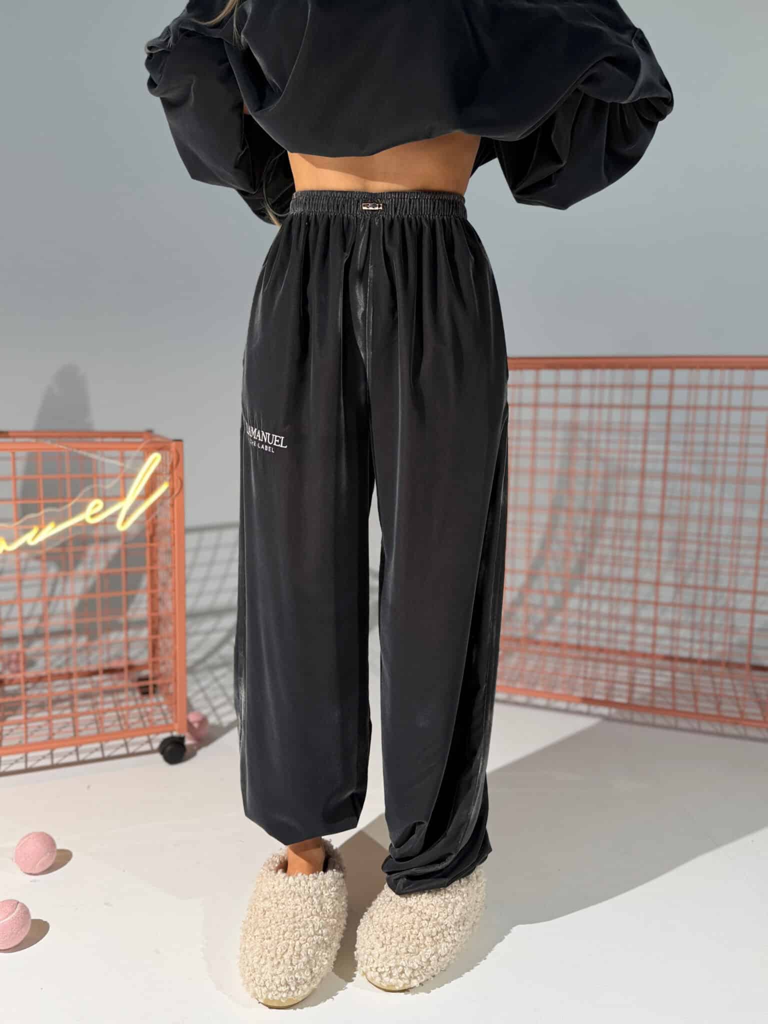 Spodnie z aksamitnej dzianiny z haftem KOLOR LIMITOWANY!!!Aksamitna dzianina z delikatnym refleksem – gładka, przyjemna w dotyku, ale bez zbędnego połysku. Wysoki stan, szeroka guma w pasie i dodatkowa regulacja sznurkiem. Nogawki proste, lekko lejące, z możliwością ściągnięcia na dole dzięki ukrytej gumce. Na biodrze haft – detal, który robi różnicę. Subtelny, ale wyczuwalny. Te spodnie wyglądają stylowo nawet w połączeniu z basicowym topem. Efekt jak z setu, nawet gdy nosisz je solo.Skład: 100 % poliester
