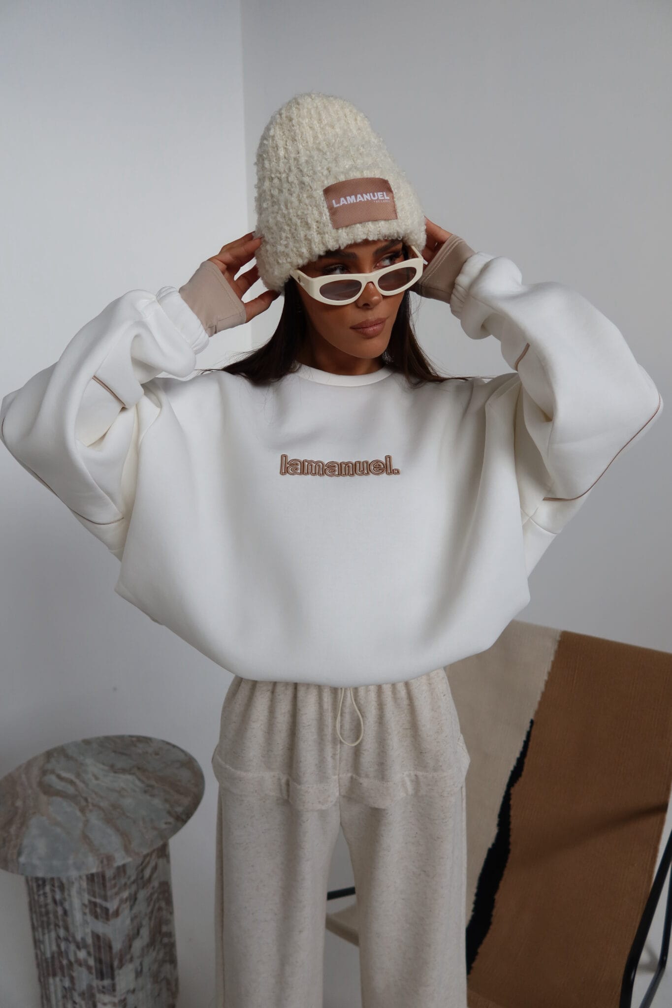 Luźne spodnie z miękkiej dzianiny dresowej. Wysoki stan z elastyczną talią i troczkiem, kieszenie boczne oraz ozdobny pasek z przeszyciem na wysokości bioder. Komfortowy fason idealny do codziennych i domowych stylizacji.Skład: 90% bawełna 10% poliester