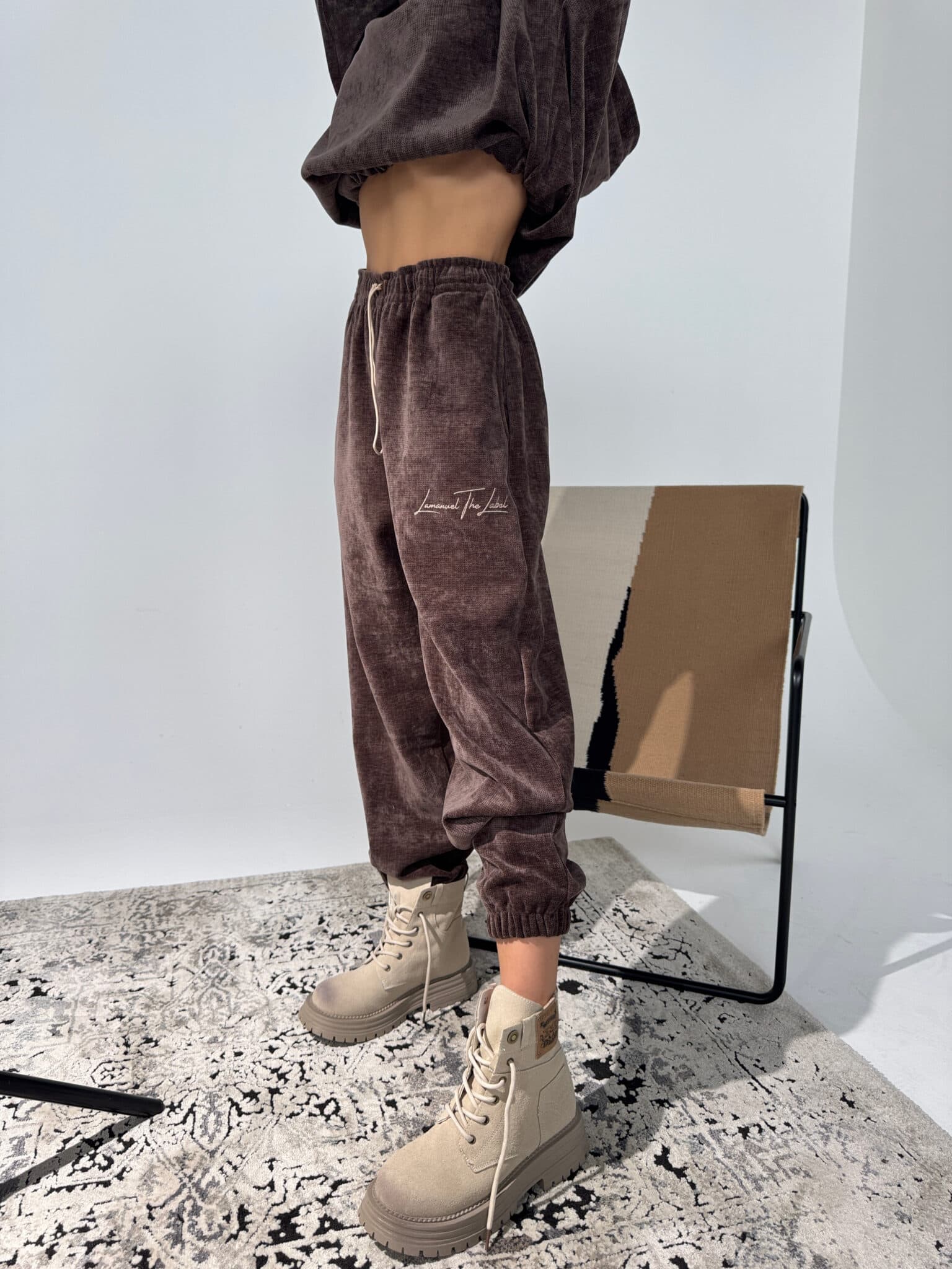 Czujesz się w nich, jakbyś właśnie wróciła z górskiej chaty. Welurowy materiał otula ciało, gumka w pasie i luźna nogawka dają pełen luz, a ściągacze trzymają formę. To spodnie na zimowy reset – do bluzy, do herbaty, do grubych skarpetek. Ale niech Cię nie zmyli ten chill – wyglądają naprawdę dobrze.Skład: 95% poliester 5% spandex