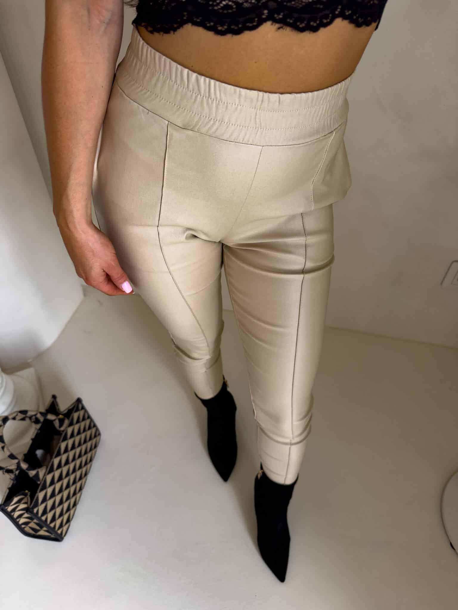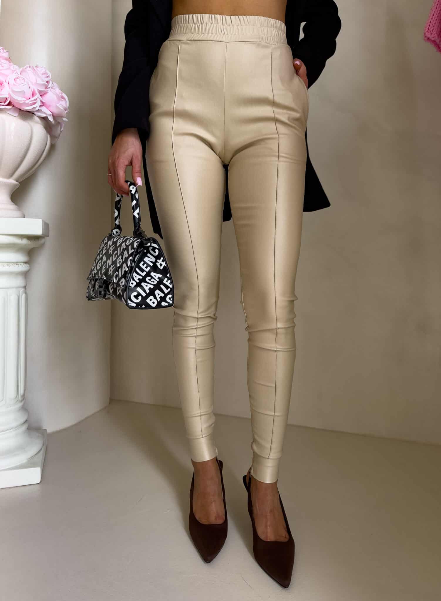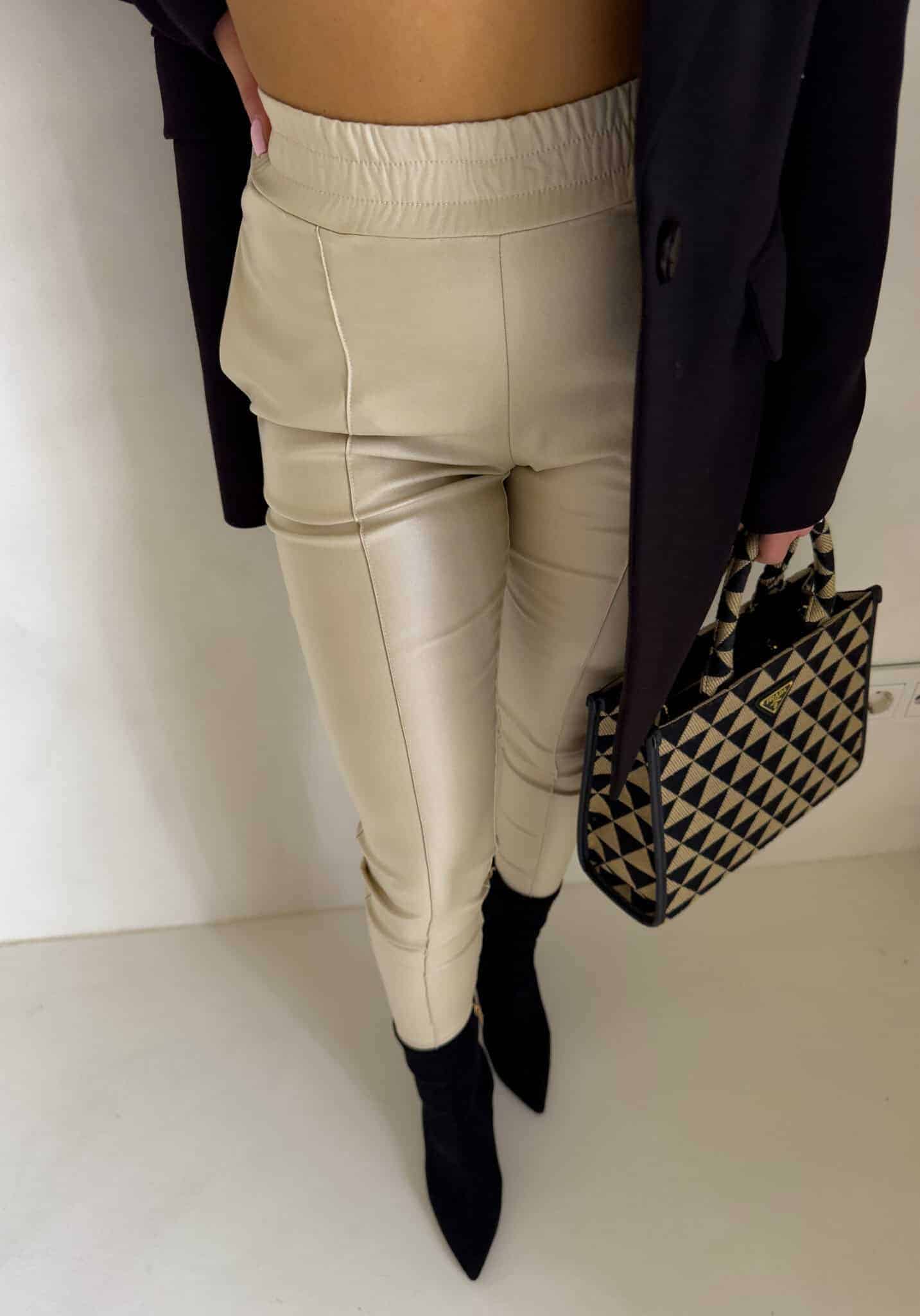 Spodnie Royal charakteryzują się woskowanym wykończeniem materiału i gumką w pasie. Przeszycia na nogawkach.
