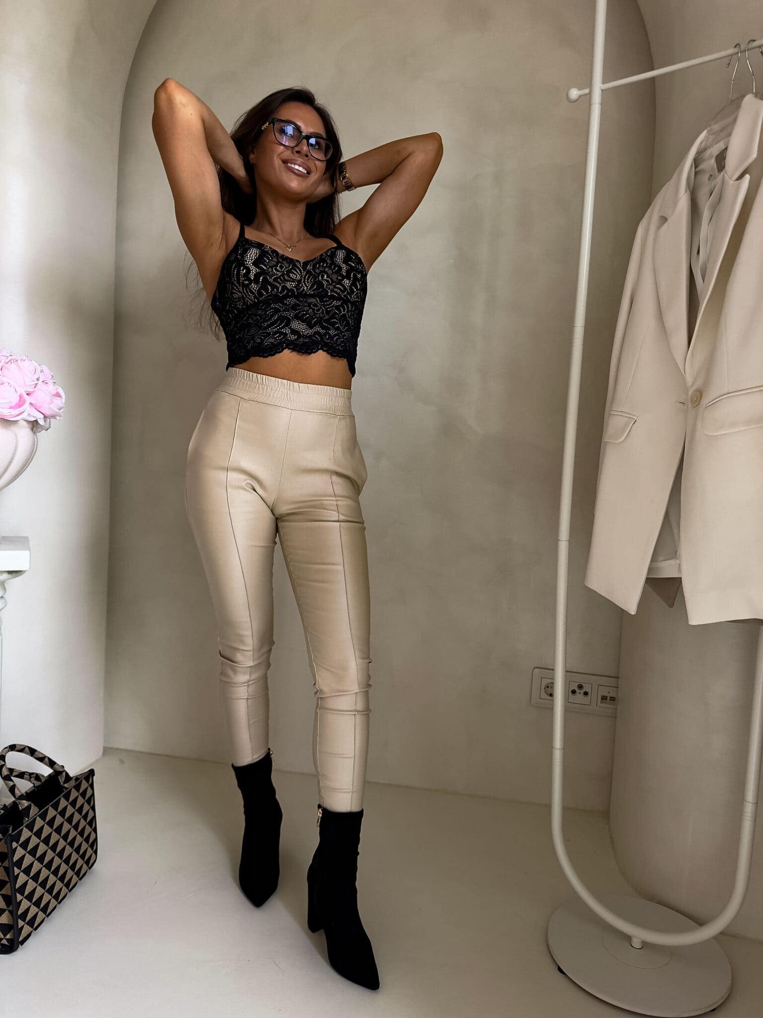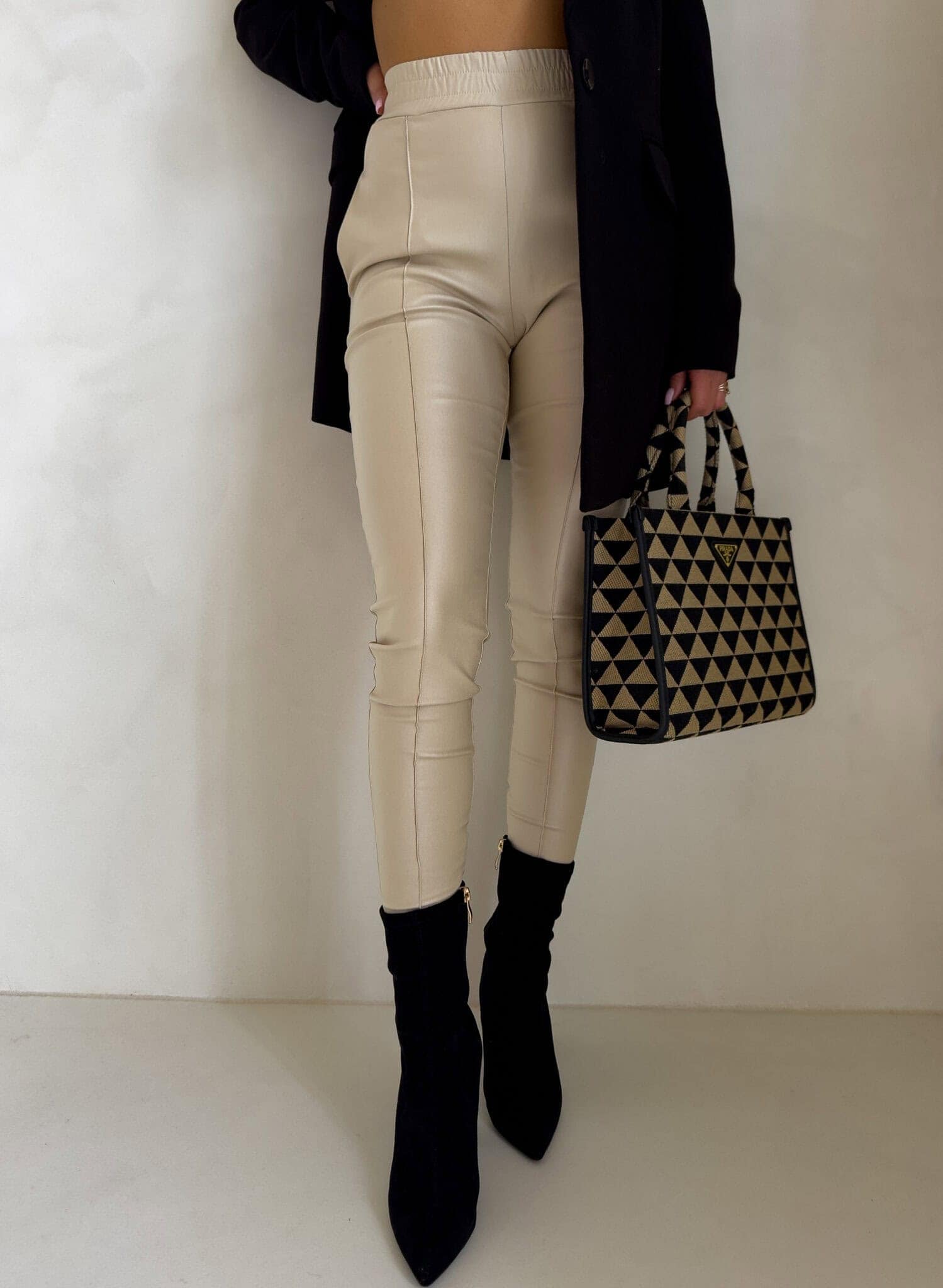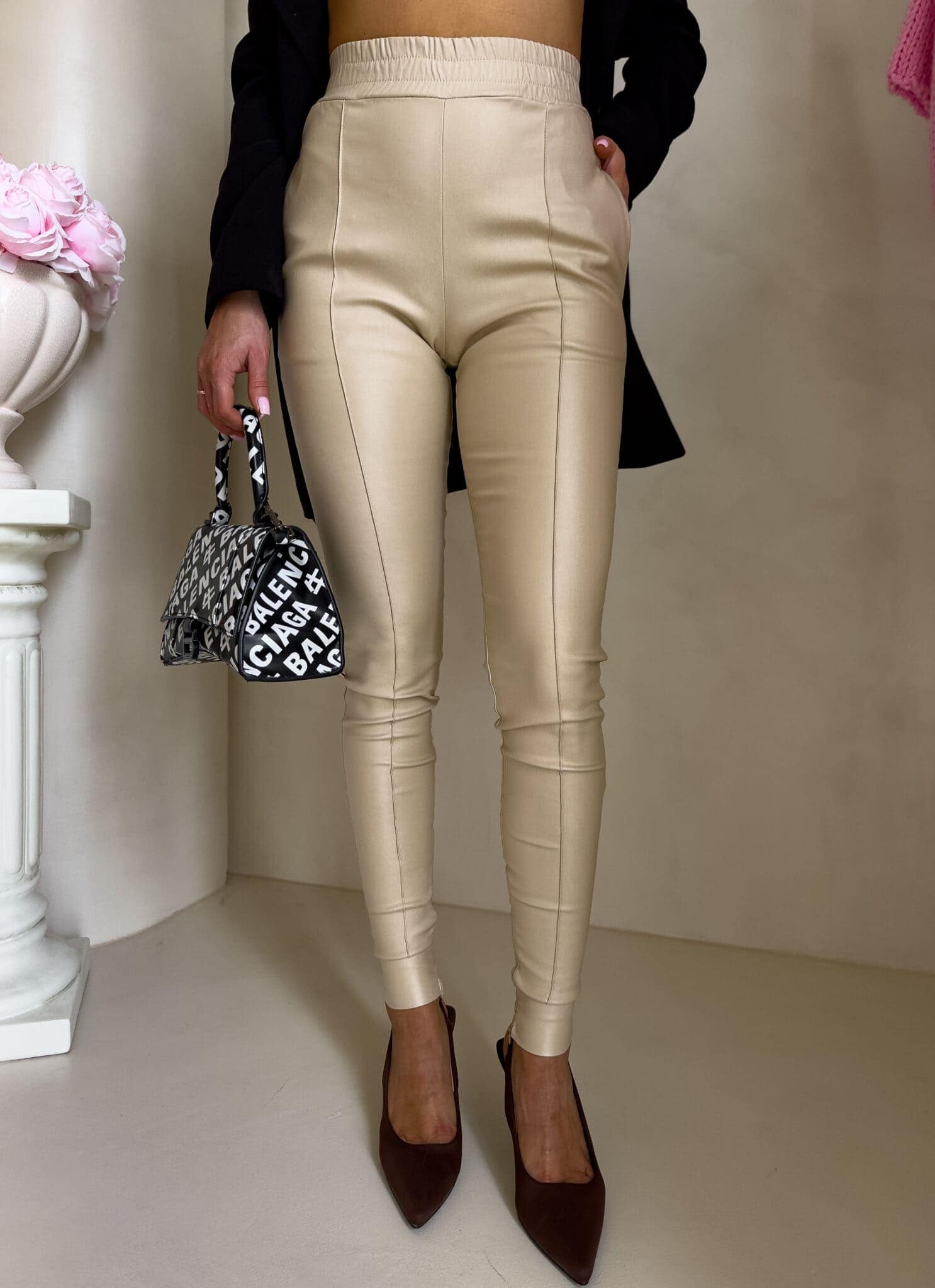 Spodnie Royal charakteryzują się woskowanym wykończeniem materiału i gumką w pasie. Przeszycia na nogawkach.
