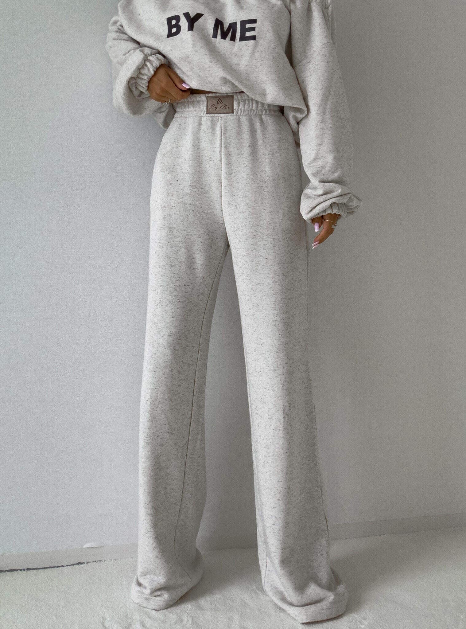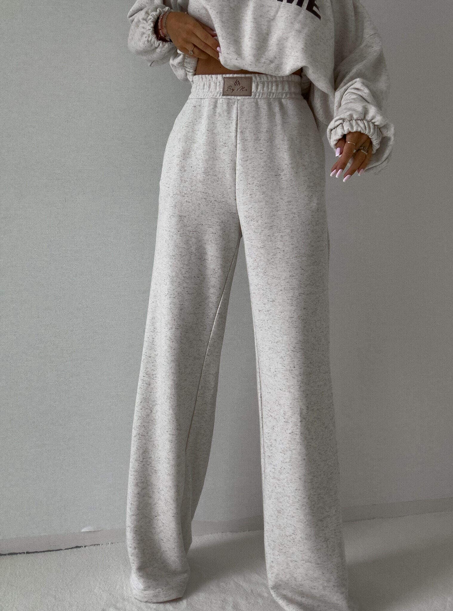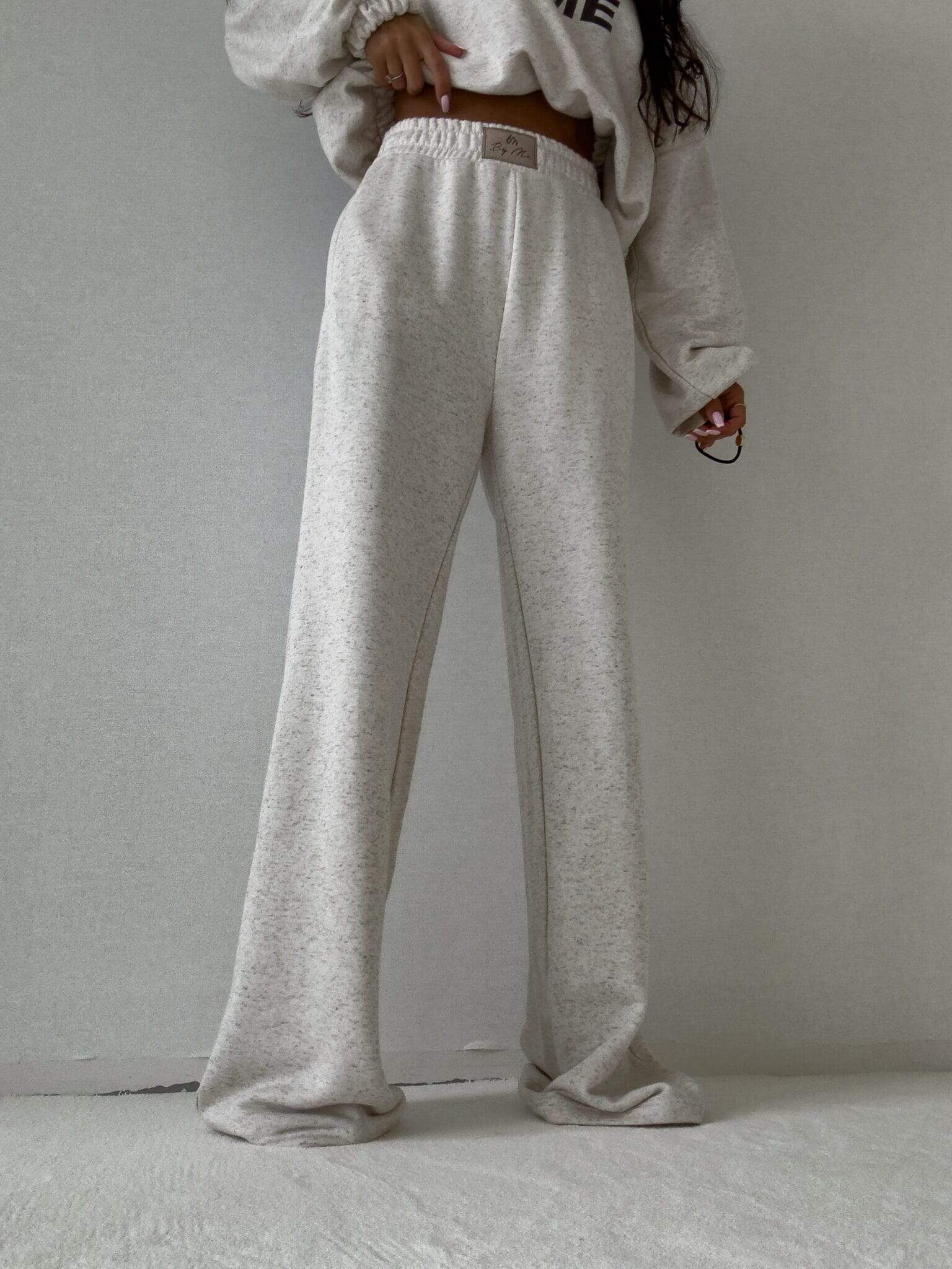 Luźne spodnie dresowe z szerokimi nogawkami to idealne połączenie komfortu i swobodnego stylu. Wykonane z miękkiego materiału, mają prosty krój i szerokie nogawki, które zapewniają maksymalną wygodę i pełną swobodę ruchów. W pasie znajduje się elastyczna gumka, dzięki której spodnie dopasowują się do sylwetki, nie uciskając. Dodatkowym detalem jest subtelna metka z napisem „By Me” przyszyta centralnie na gumce, podkreślająca unikatowy charakter produktu.