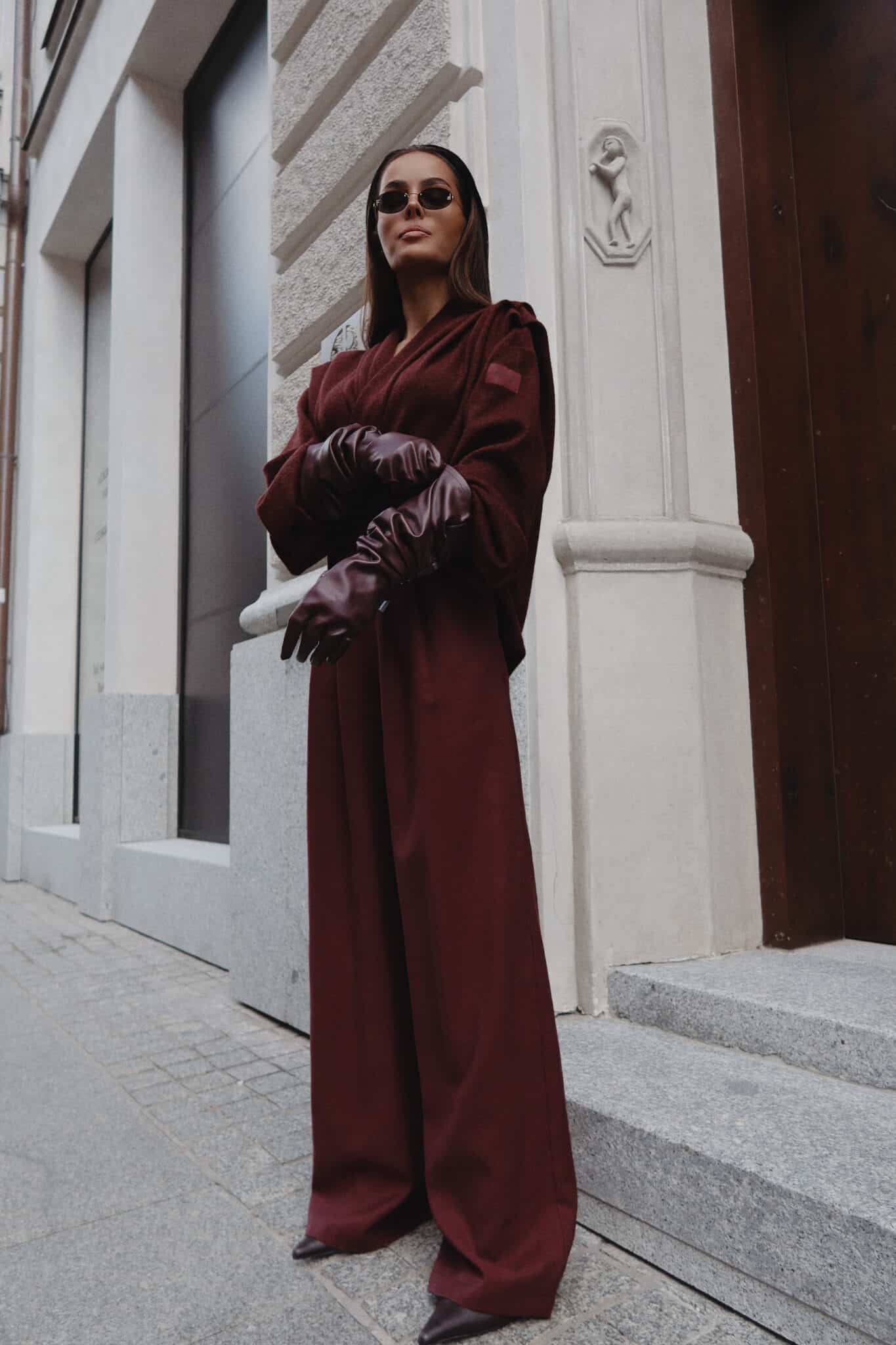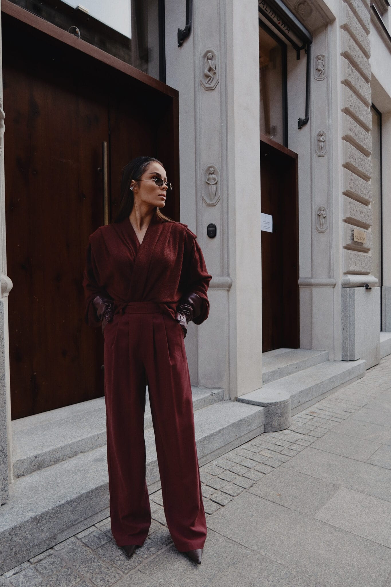 KOLOR LIMITOWANY!Elegancki fason z charakterem – szeroka nogawka, lekki połysk i zapinanie na suwak z boku, które podkreśla czystą linię talii. Plisy z przodu dodają im wyrafinowania, a dopracowana forma sprawia, że układają się idealnie w ruchu. To spodnie, które robią robotę w total looku, ale równie dobrze zagrają z basicowym topem czy grubym swetrem. Styl biurowy, wieczorowy albo casual w wersji premium – Ty decydujesz.Skład: 90% rayon 10% poliester