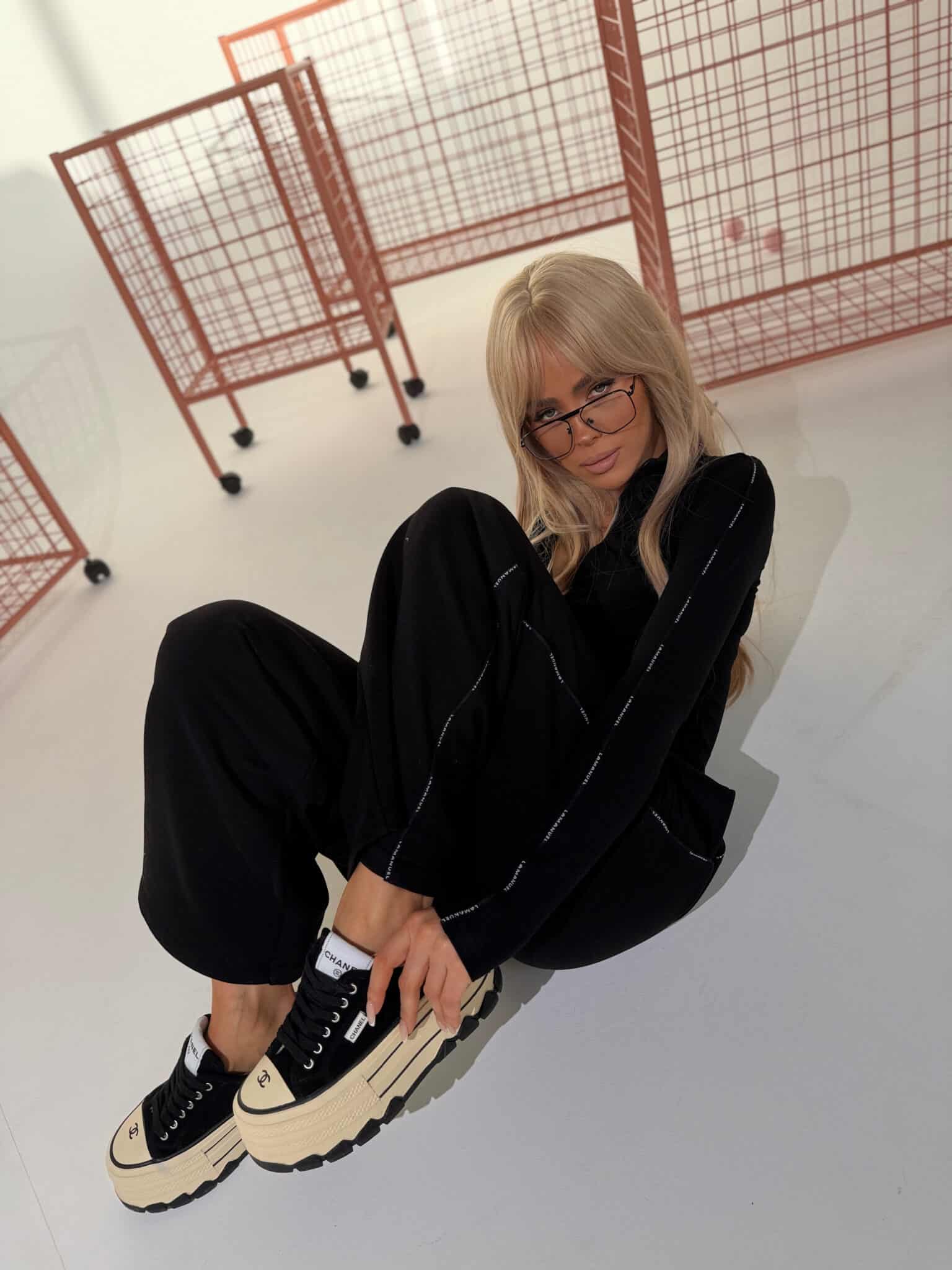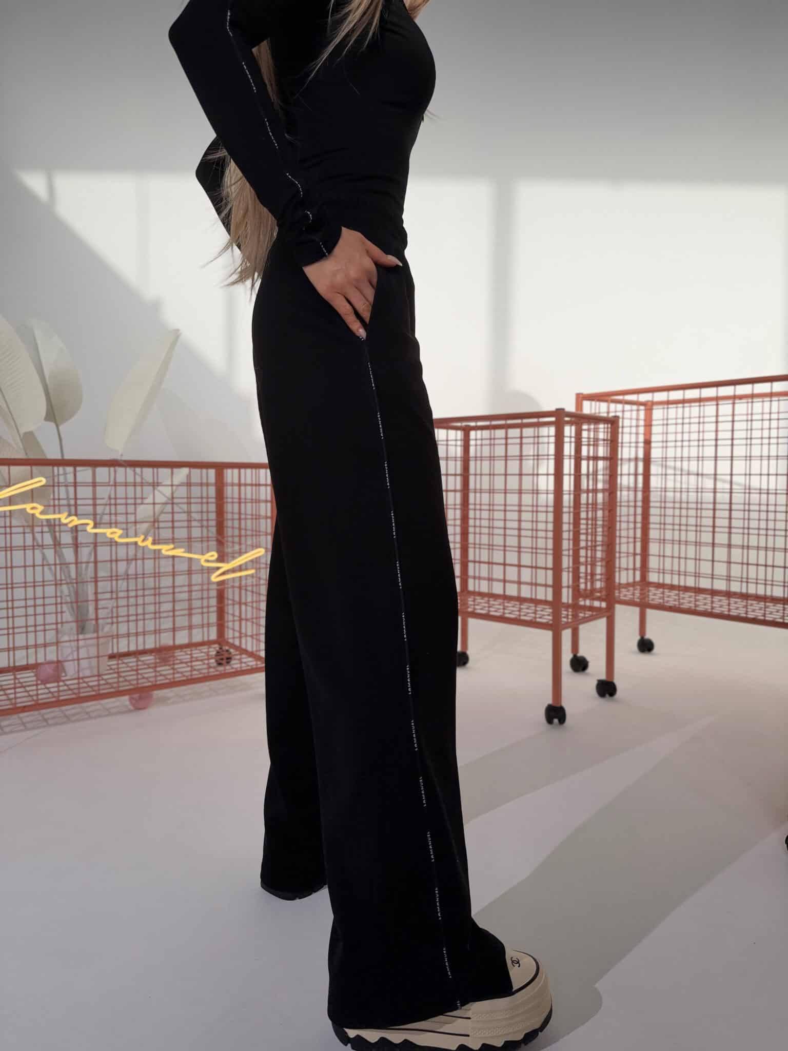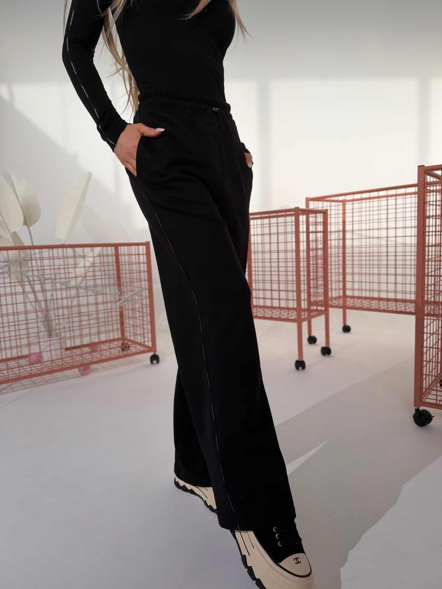 Spodnie dresowe z taśmą logoModel oparty na szerokiej, prostej nogawce z wydłużoną linią. Dzianina pętelkowa – miękka, ale stabilna. W pasie elastyczna guma i sznurek do regulacji. Boczna taśma z powtarzalnym logo w odcieniu bazowym. Wykończenie bez ściągaczy. Forma inspirowana sylwetką garniturową, przeniesiona na codzienny materiał. Spodnie, które można nosić jak dres, ale wyglądają jak przemyślany element stylizacji.Skład: 90% bawełna 10% poliester