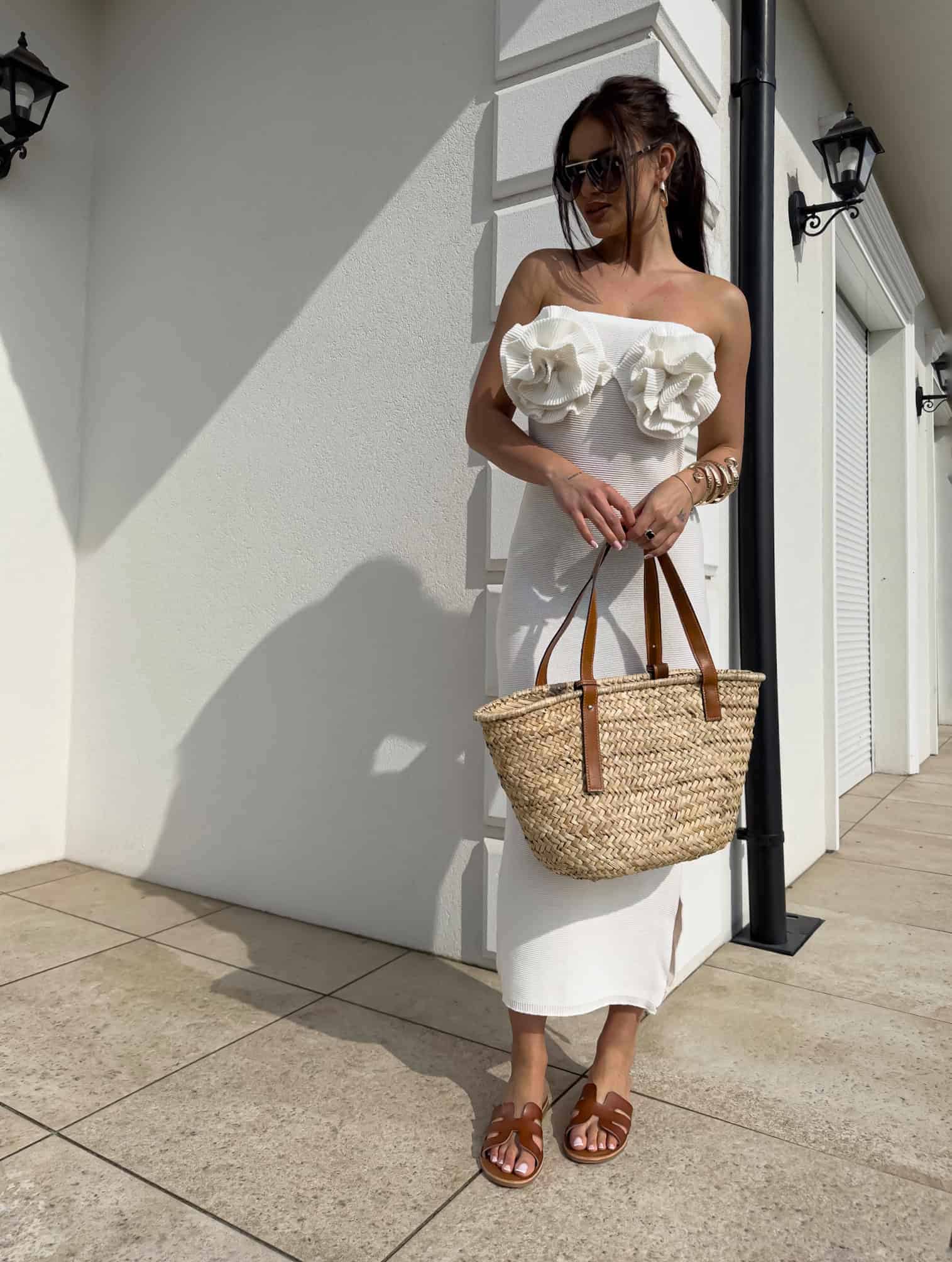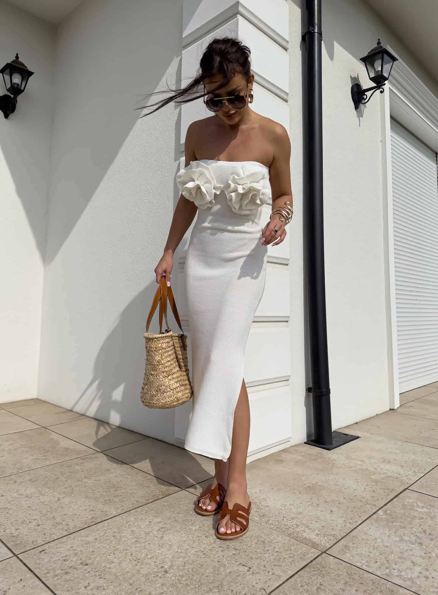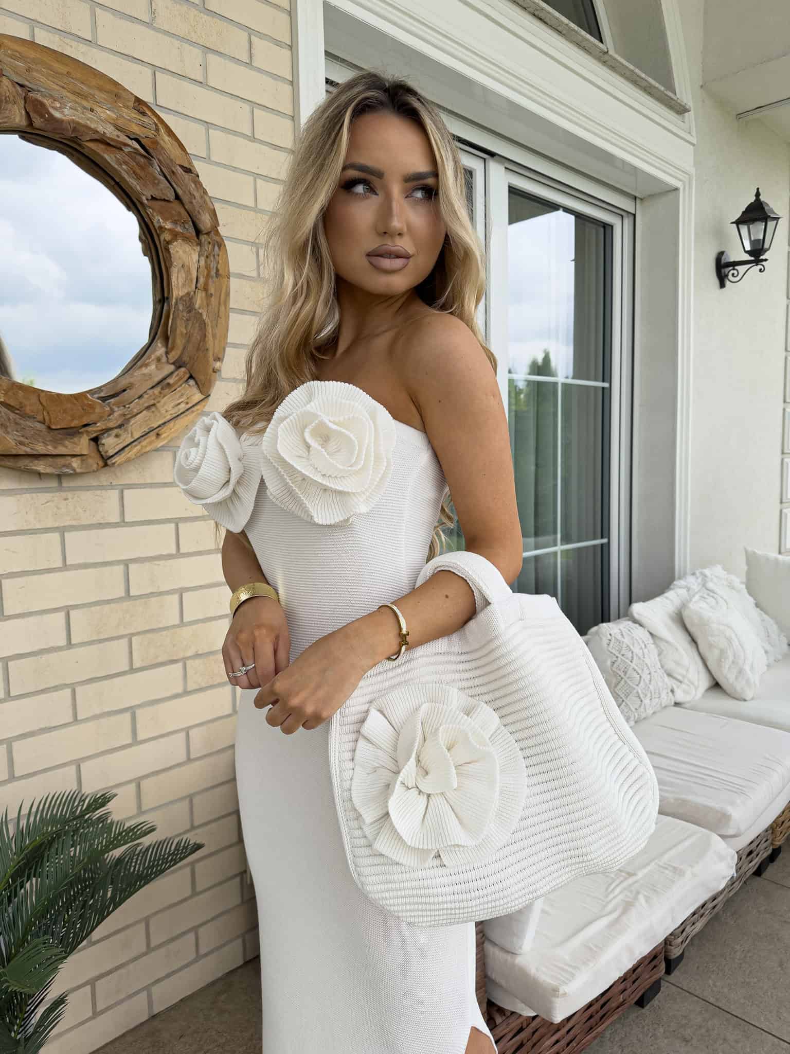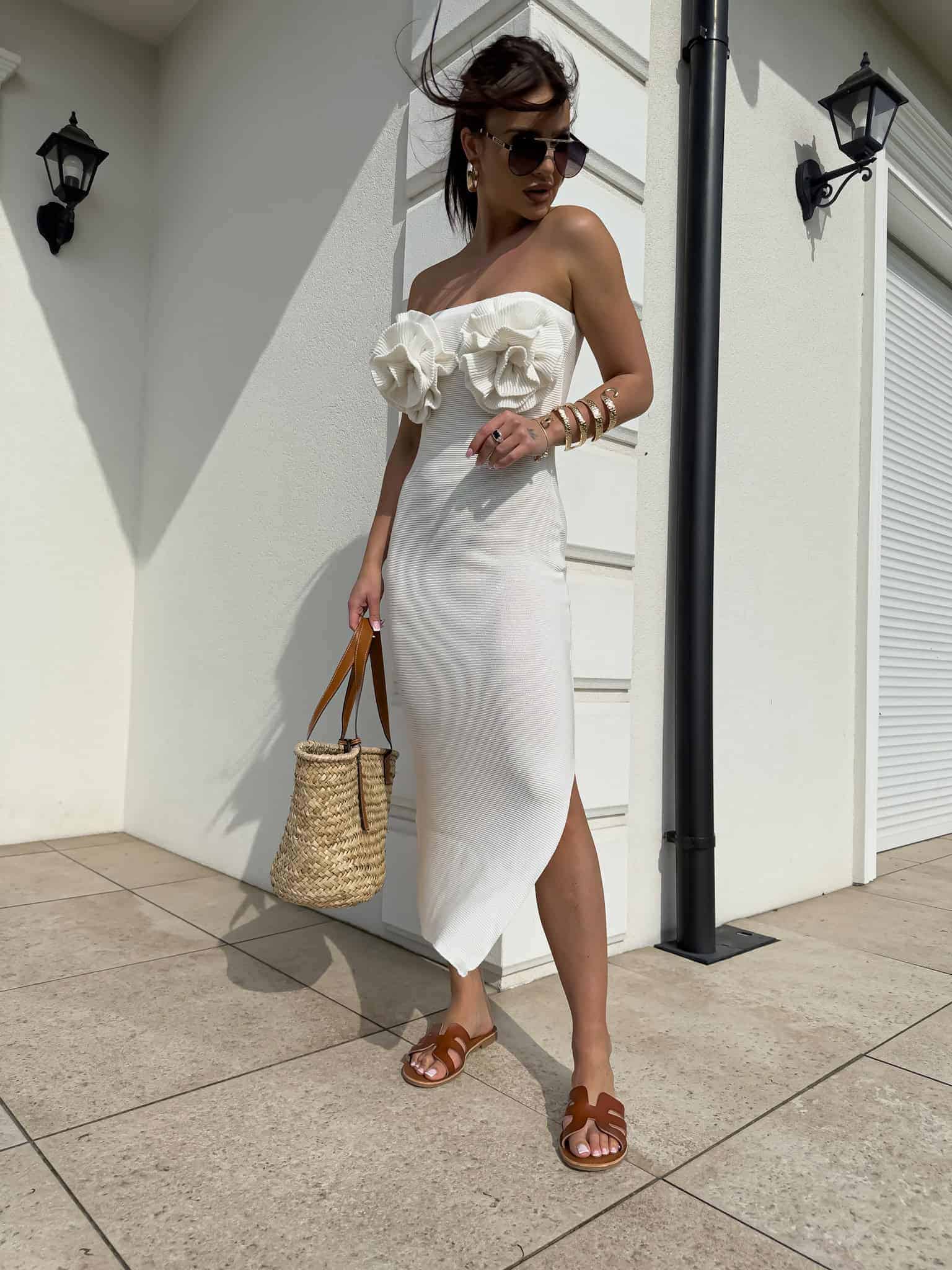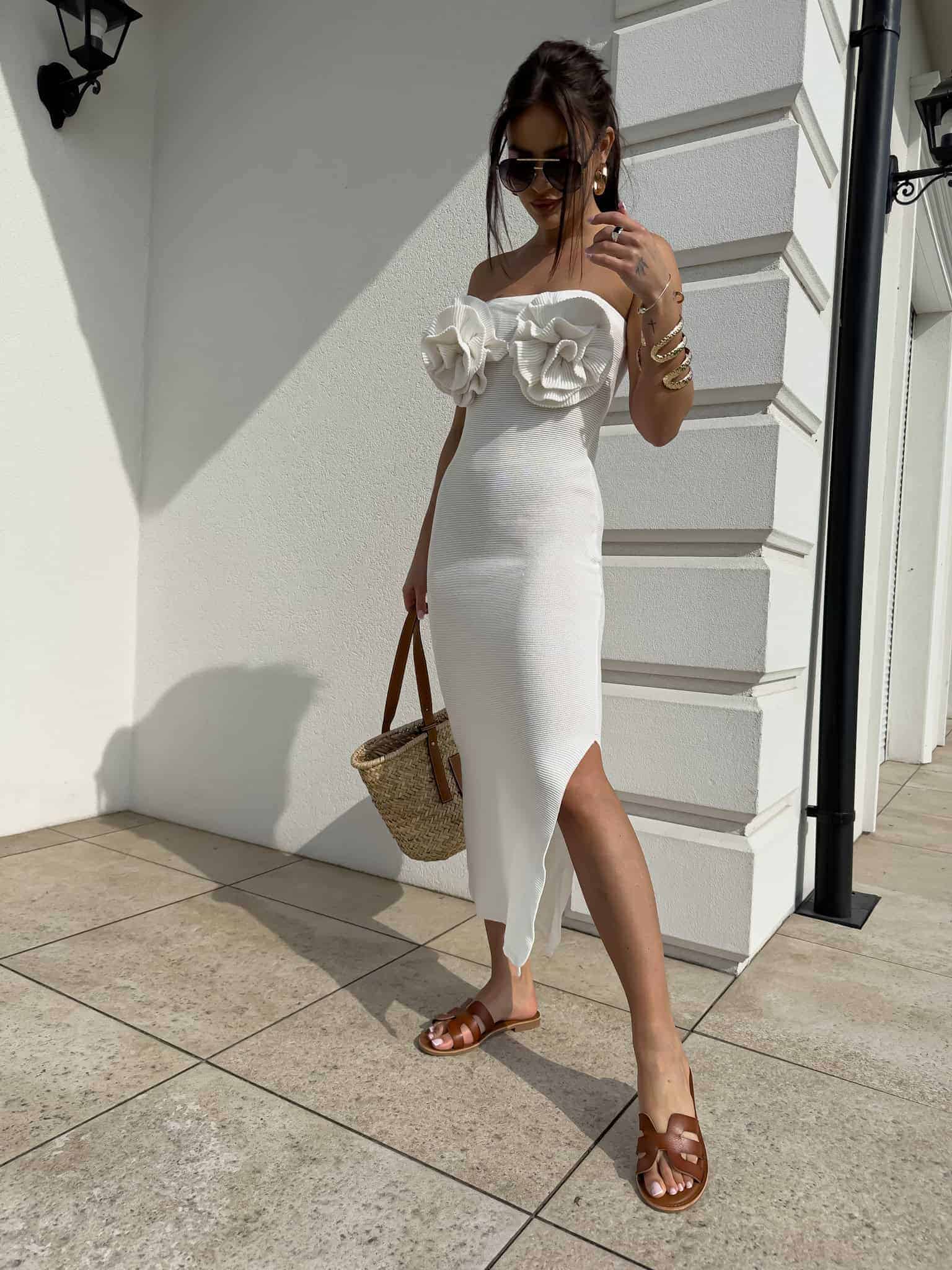Zachwycająca sukienka o długości maxi, która łączy elegancję z romantycznym wdziękiem. Model z odkrytymi ramionami subtelnie podkreśla linię szyi i ramion, dodając kobiecego uroku. Po jednej stronie znajduje się zmysłowe rozcięcie, które nadaje lekkości i wydłuża sylwetkę.