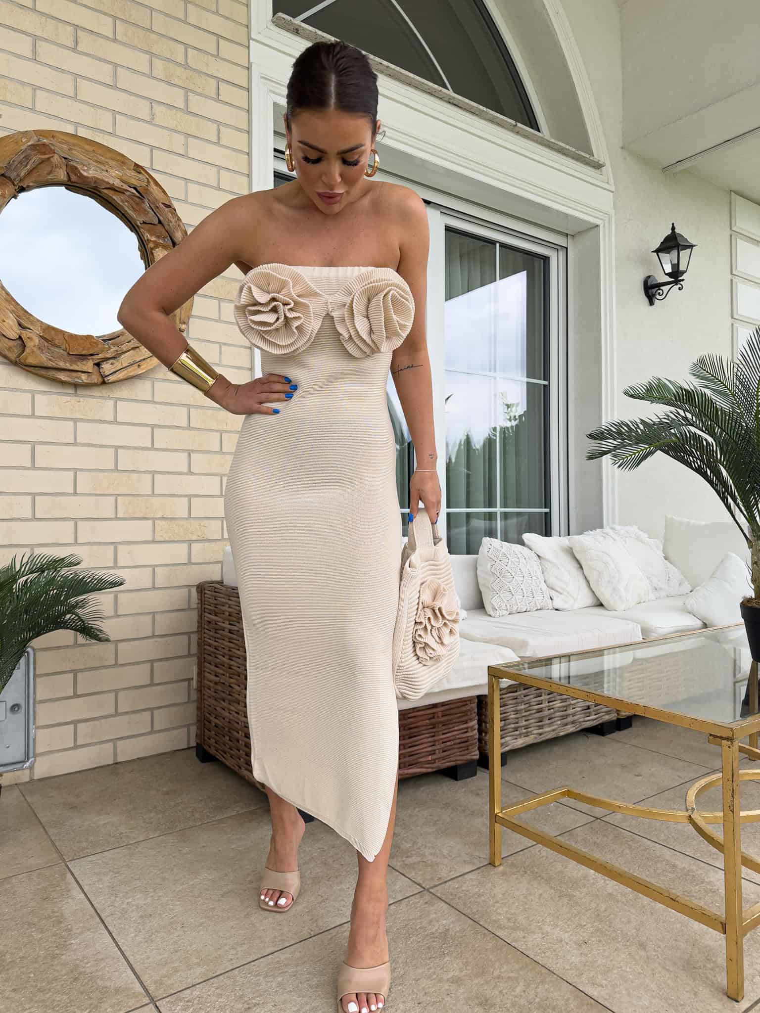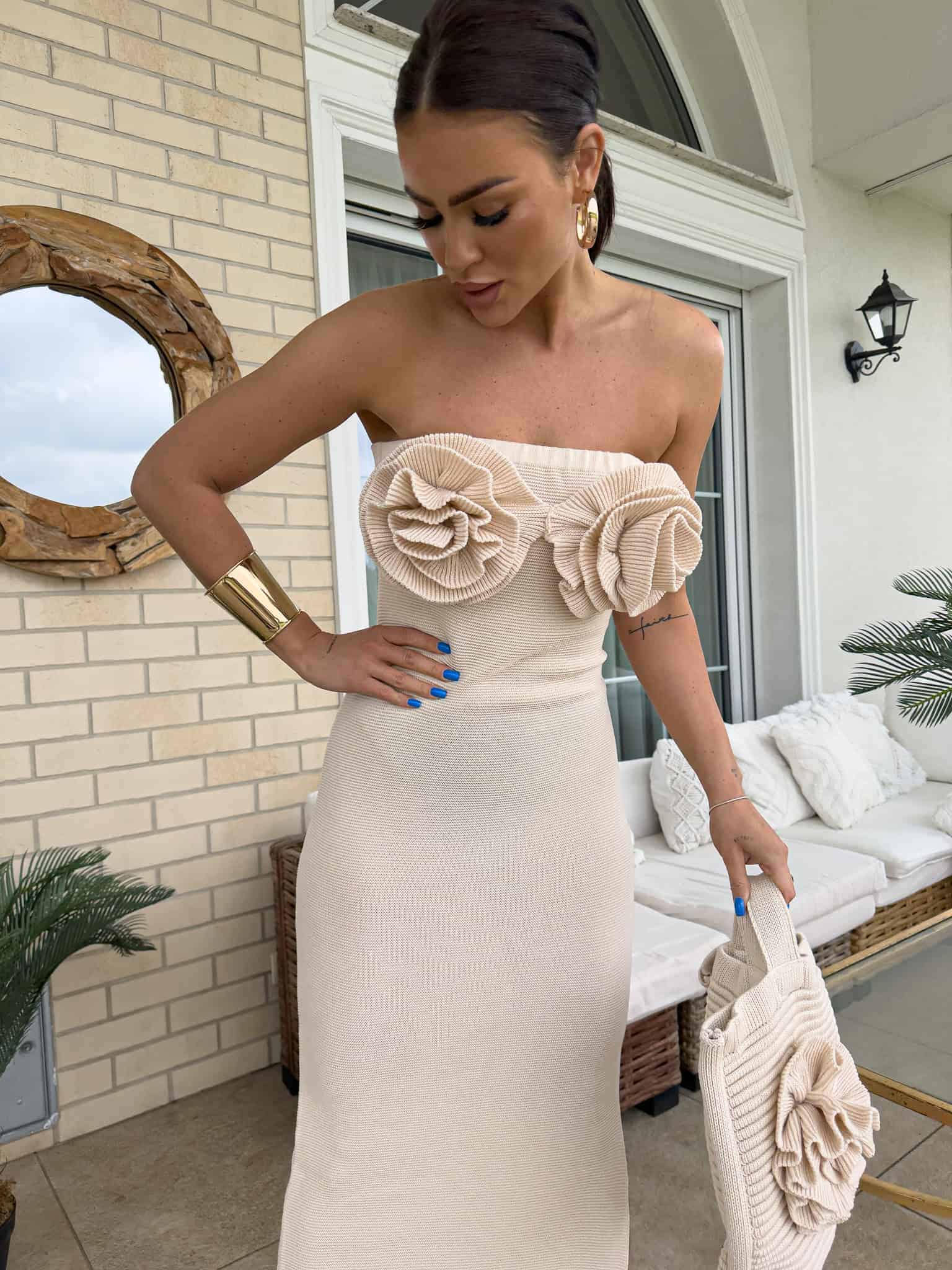 Zachwycająca sukienka o długości maxi, która łączy elegancję z romantycznym wdziękiem. Model z odkrytymi ramionami subtelnie podkreśla linię szyi i ramion, dodając kobiecego uroku. Po jednej stronie znajduje się zmysłowe rozcięcie, które nadaje lekkości i wydłuża sylwetkę.
