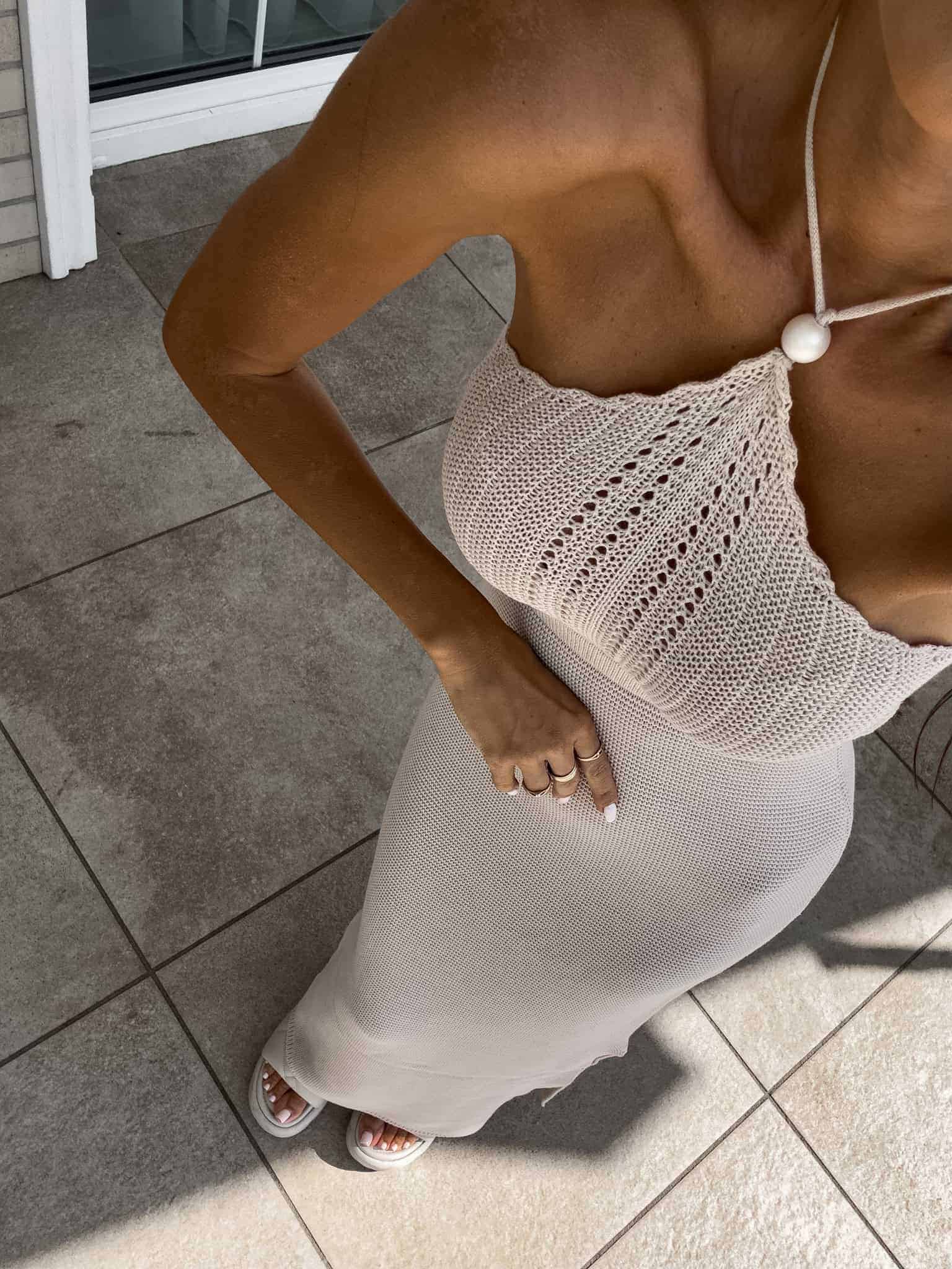Elegancka sukienka maxi to idealny wybór na letnie przyjęcia, romantyczne kolacje czy wakacyjne spacery. Model z wiązaniem na szyi ozdobiony subtelną perełką nad biustem dodaje całości kobiecego uroku i delikatności. Gumka pod biustem pięknie podkreśla talię, zapewniając jednocześnie komfort noszenia. Lekki, zwiewny materiał oraz efektowne rozcięcie z boku nadają sukience lekkości i zmysłowego charakteru.