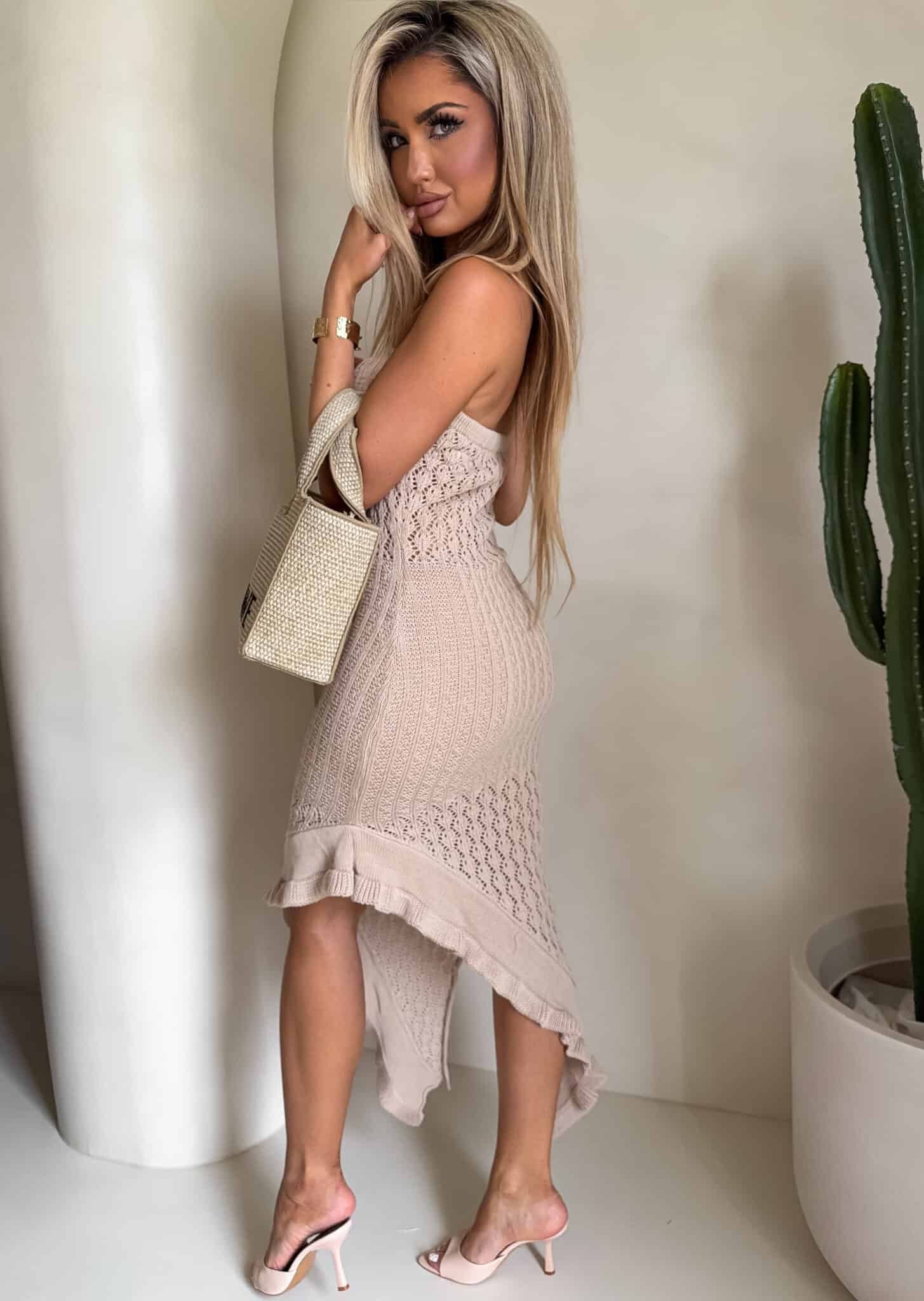 Sukienka wyróżnia się subtelnym, dekoracyjnym splotem oraz efektownym, asymetrycznym rozcięciem z falbaną, które dodaje lekkości i delikatnej zmysłowości przy każdym ruchu.