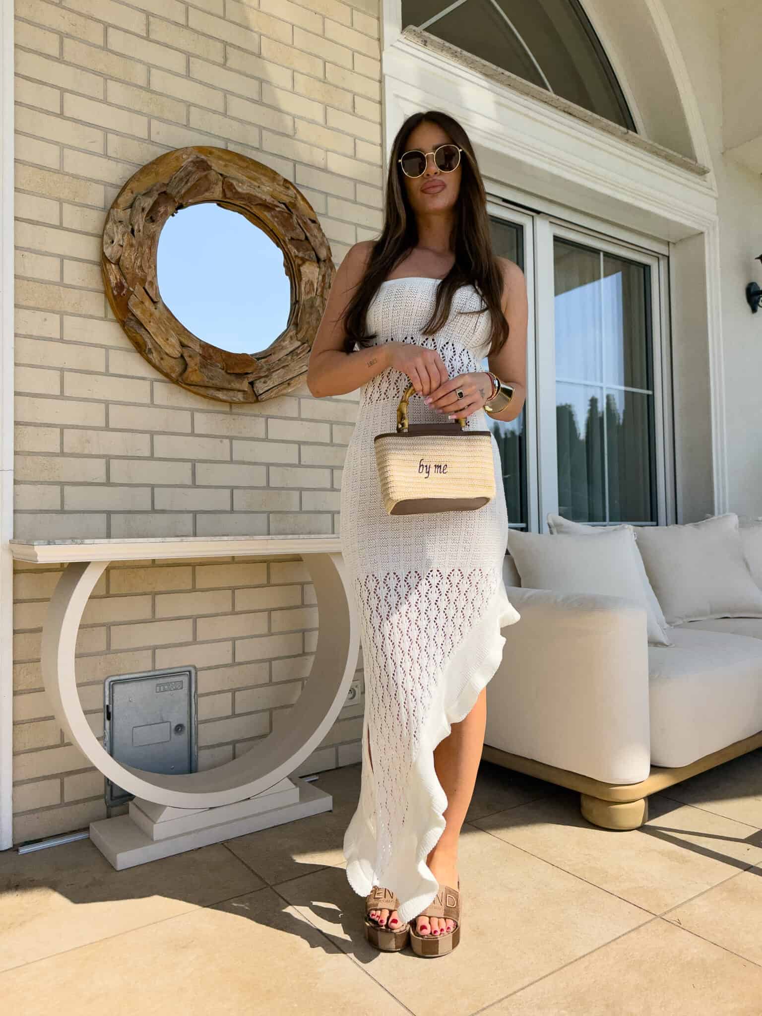 Zmysłowa i niezwykle stylowa sukienka maxi o dopasowanym kroju, wykonana z ażurowej, przewiewnej dzianiny – idealna na letnie, gorące dni. Model bez ramiączek z prostym dekoltem typu bandeau pięknie eksponuje ramiona i dekolt, podkreślając kobiecą sylwetkę.