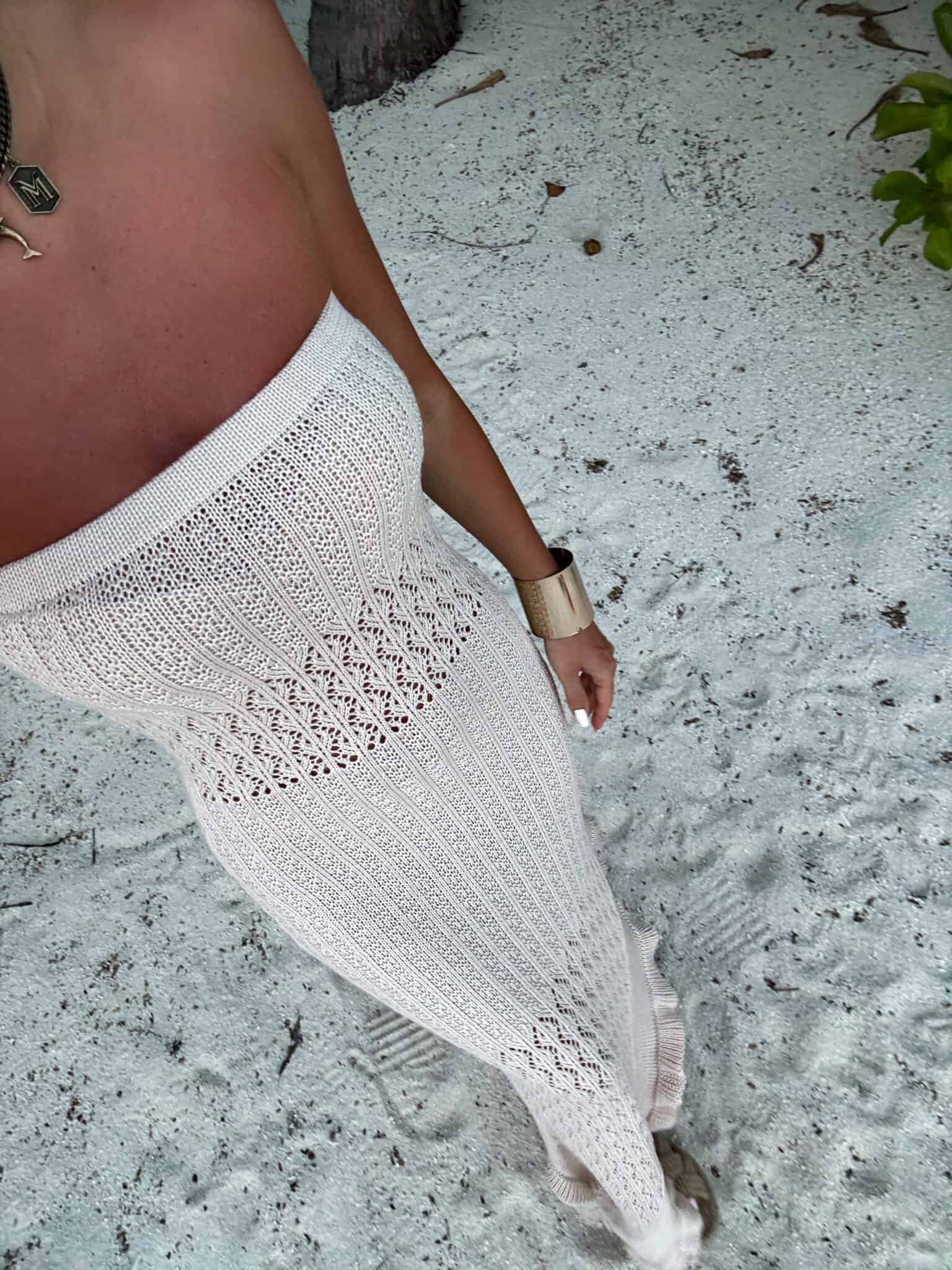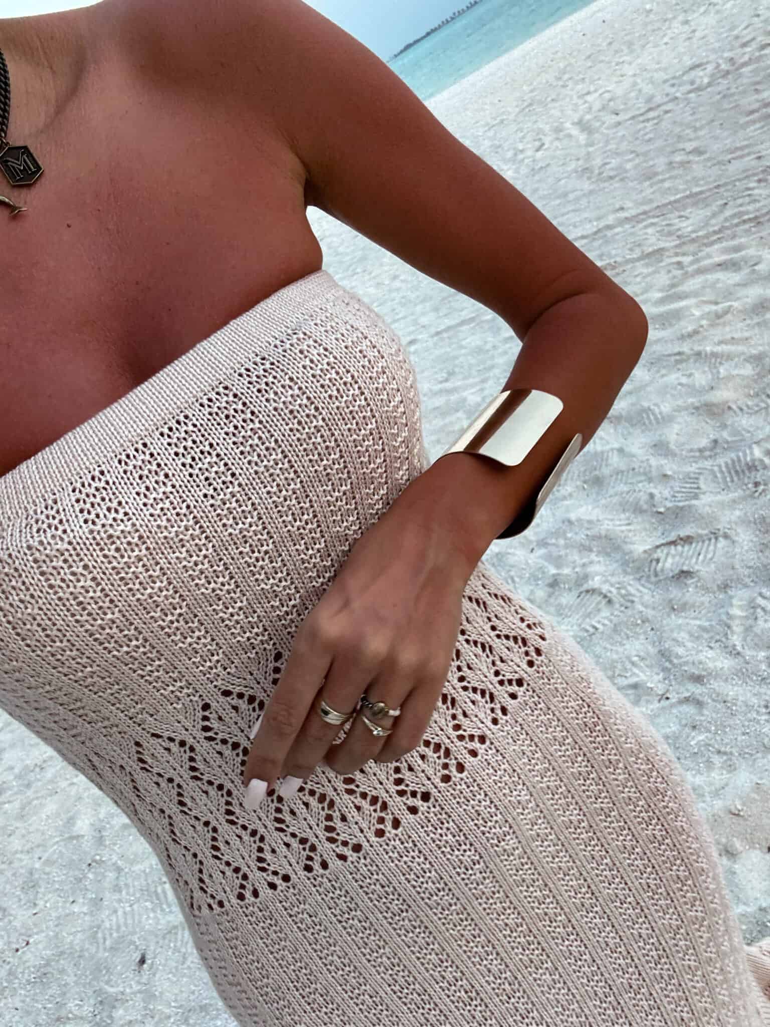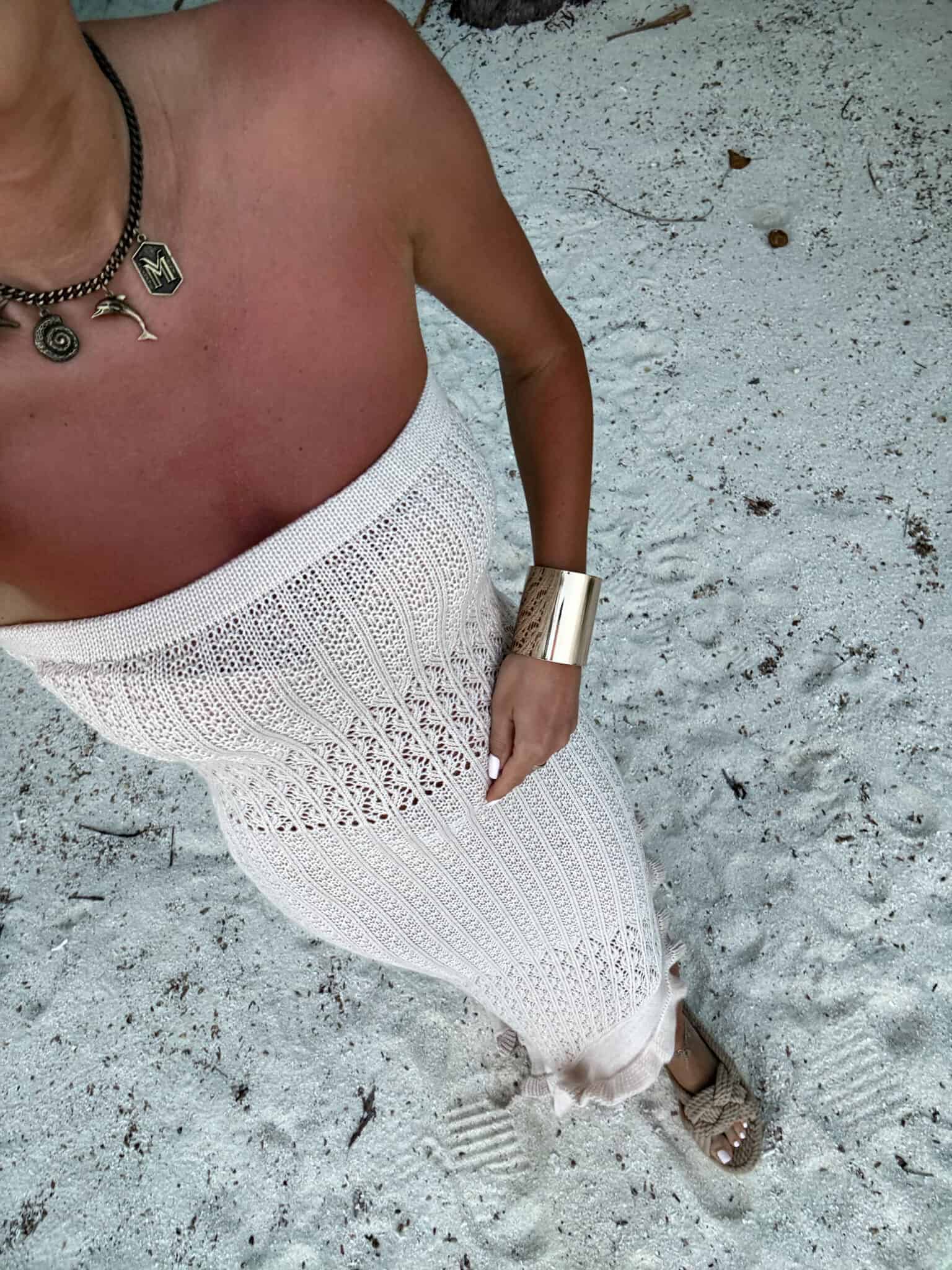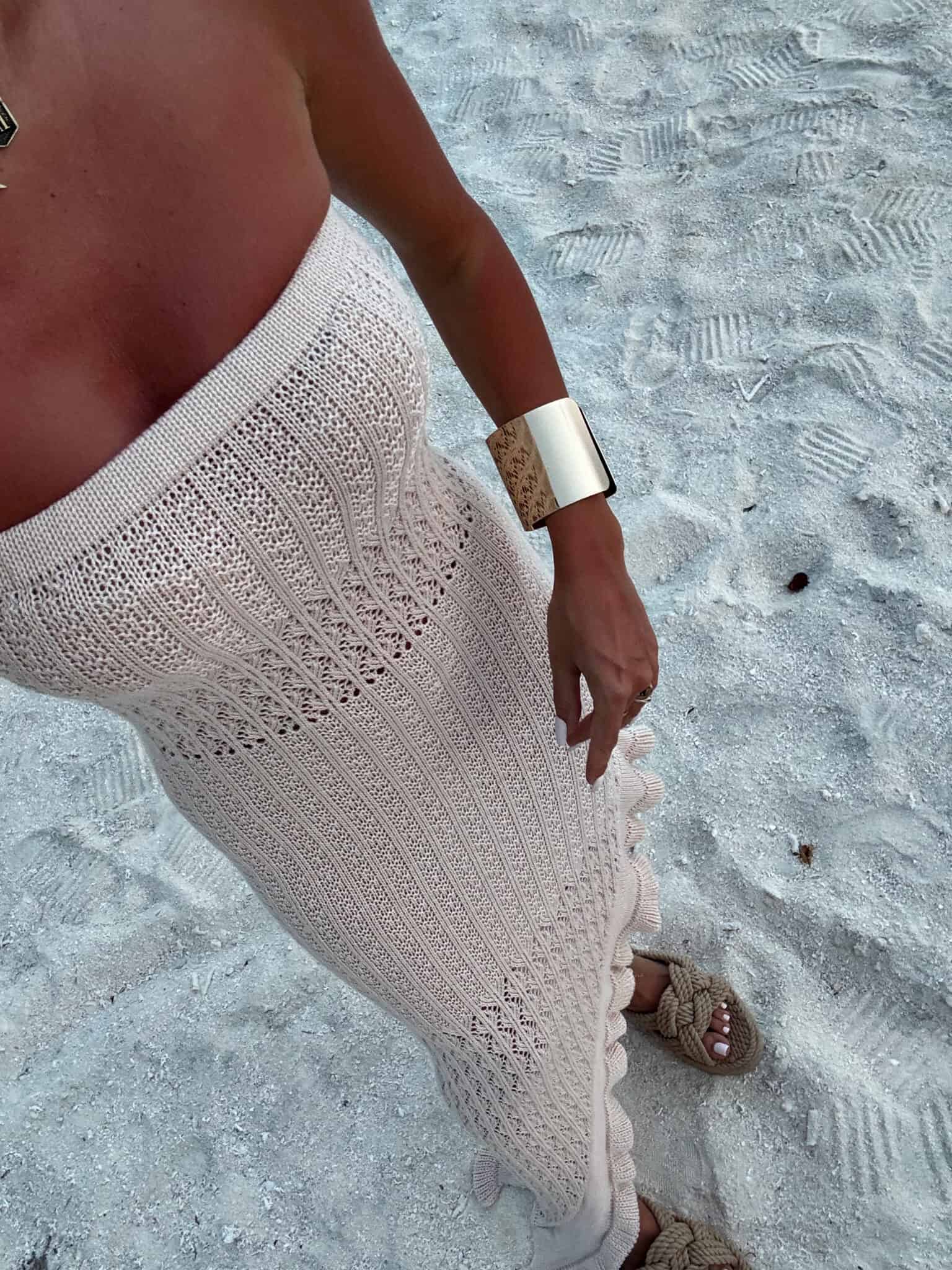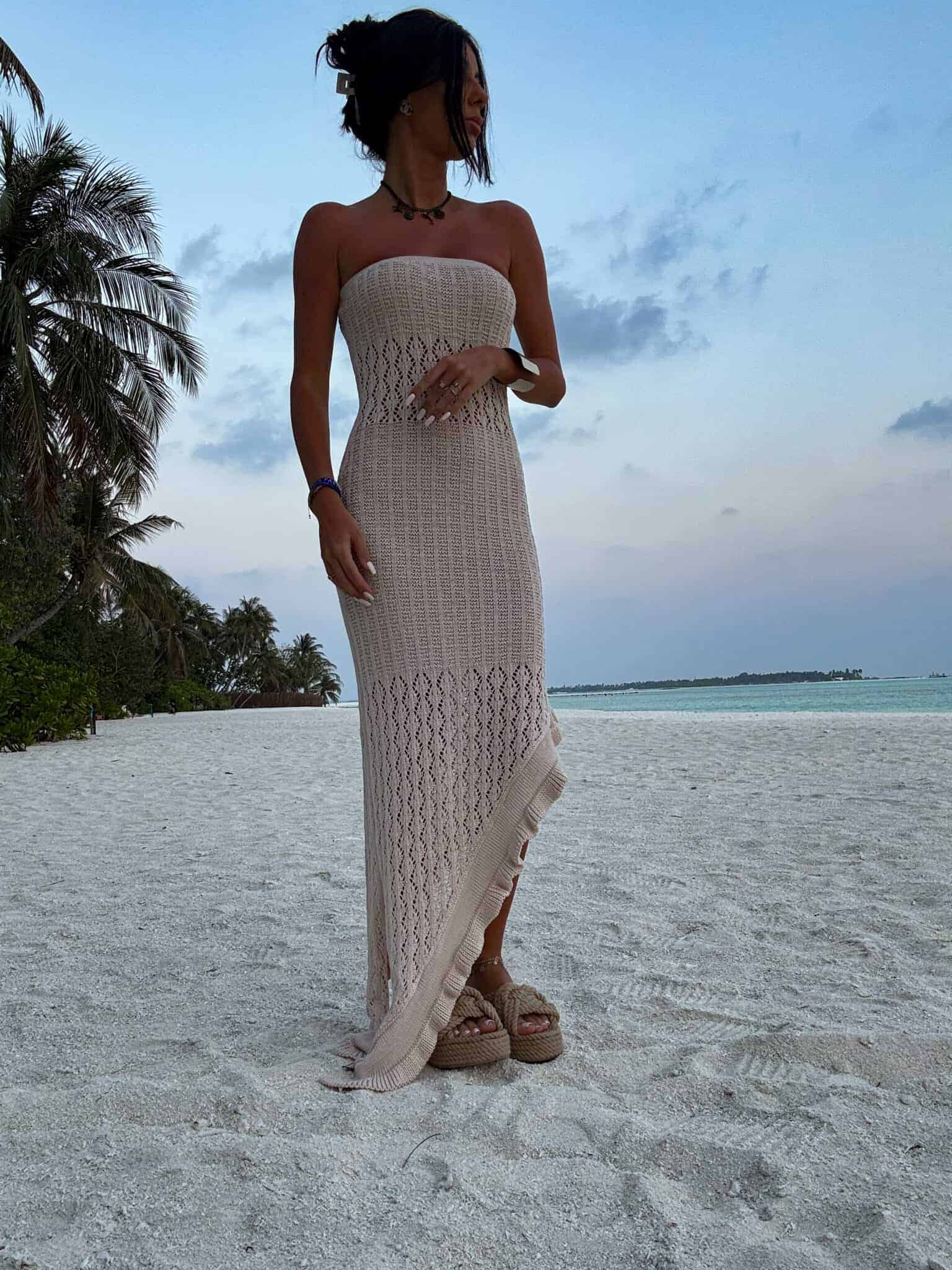 Zmysłowa i niezwykle stylowa sukienka maxi o dopasowanym kroju, wykonana z ażurowej, przewiewnej dzianiny – idealna na letnie, gorące dni. Model bez ramiączek z prostym dekoltem typu bandeau pięknie eksponuje ramiona i dekolt, podkreślając kobiecą sylwetkę.