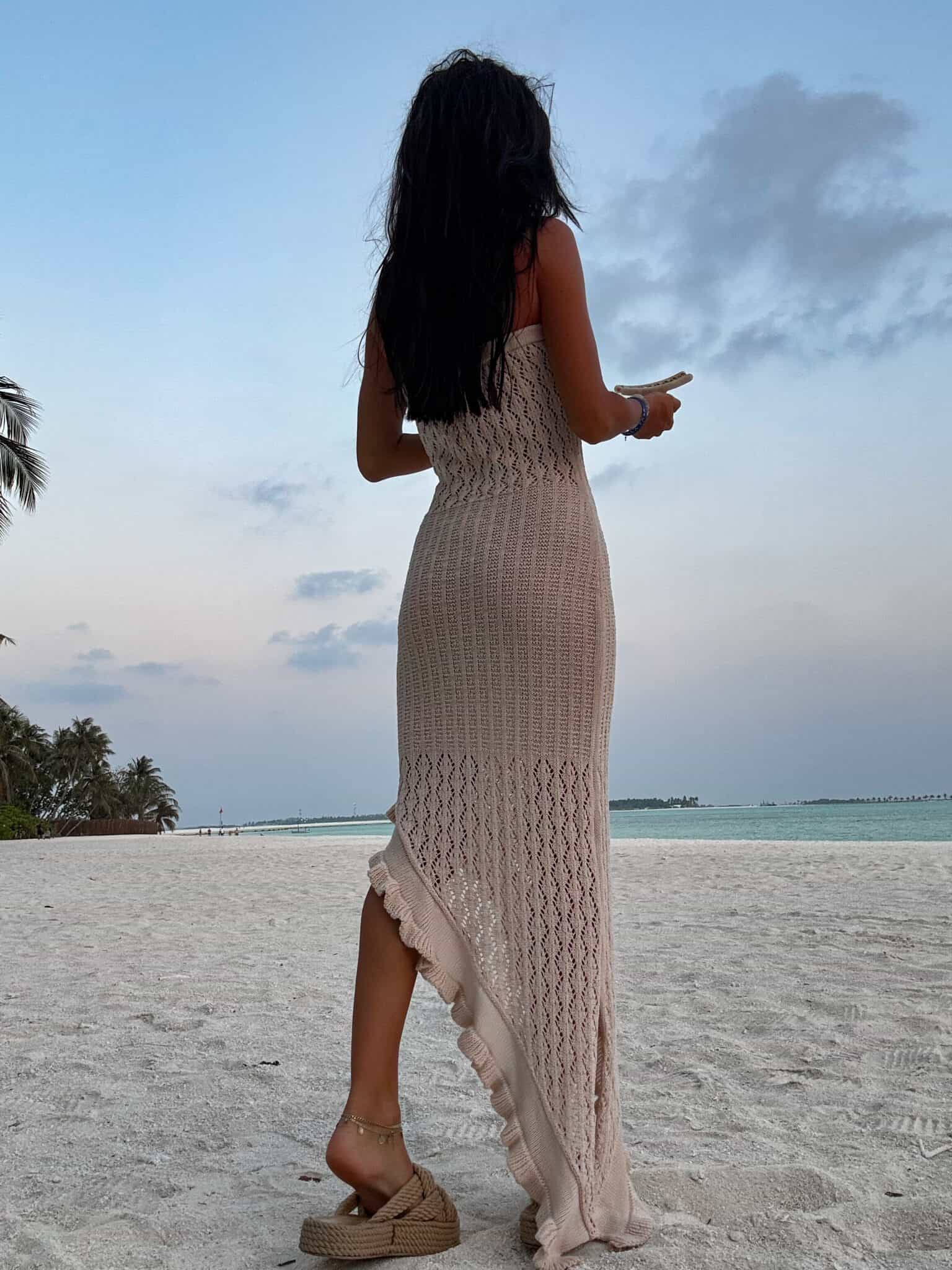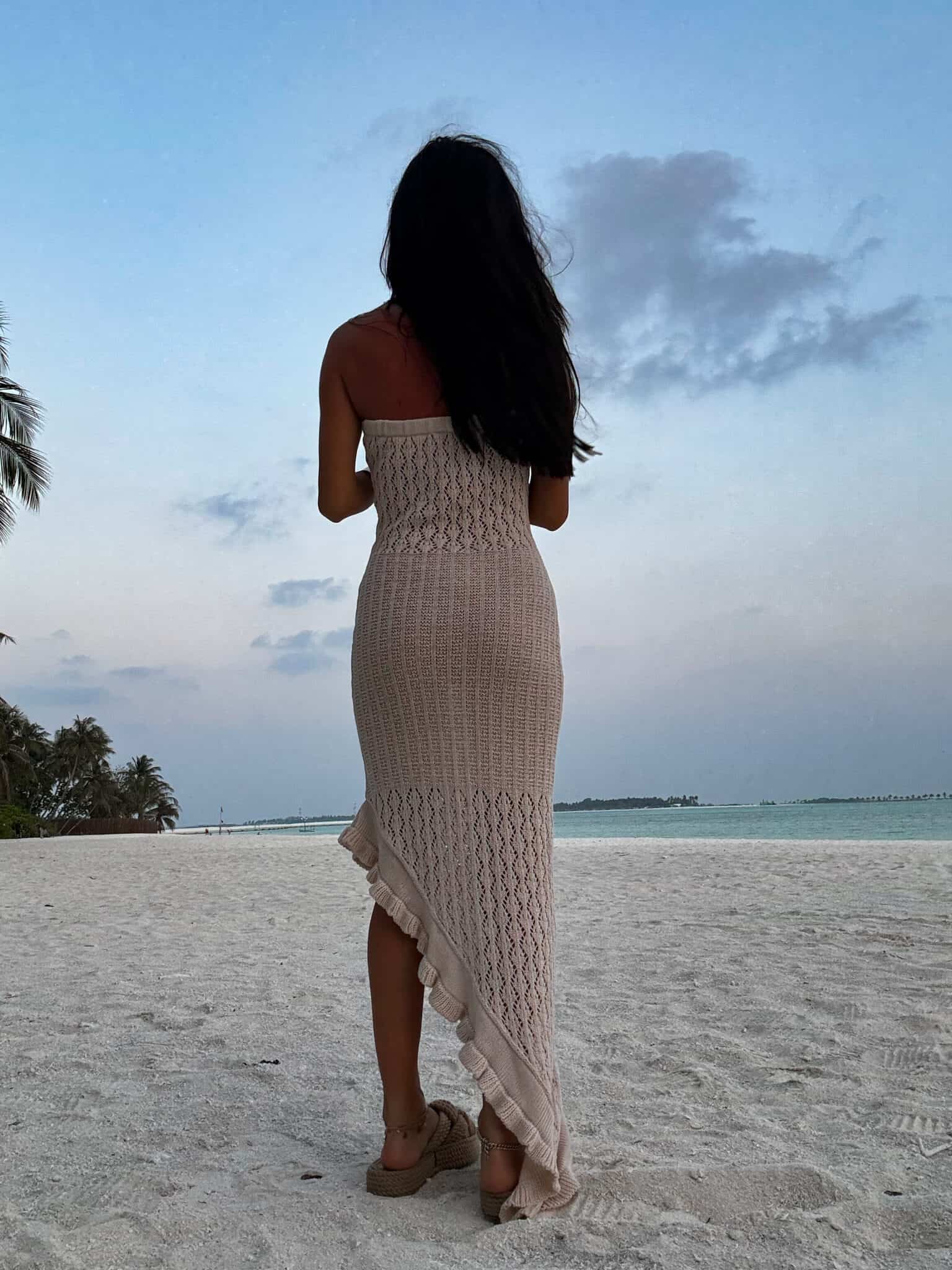 Sukienka wyróżnia się subtelnym, dekoracyjnym splotem oraz efektownym, asymetrycznym rozcięciem z falbaną, które dodaje lekkości i delikatnej zmysłowości przy każdym ruchu.