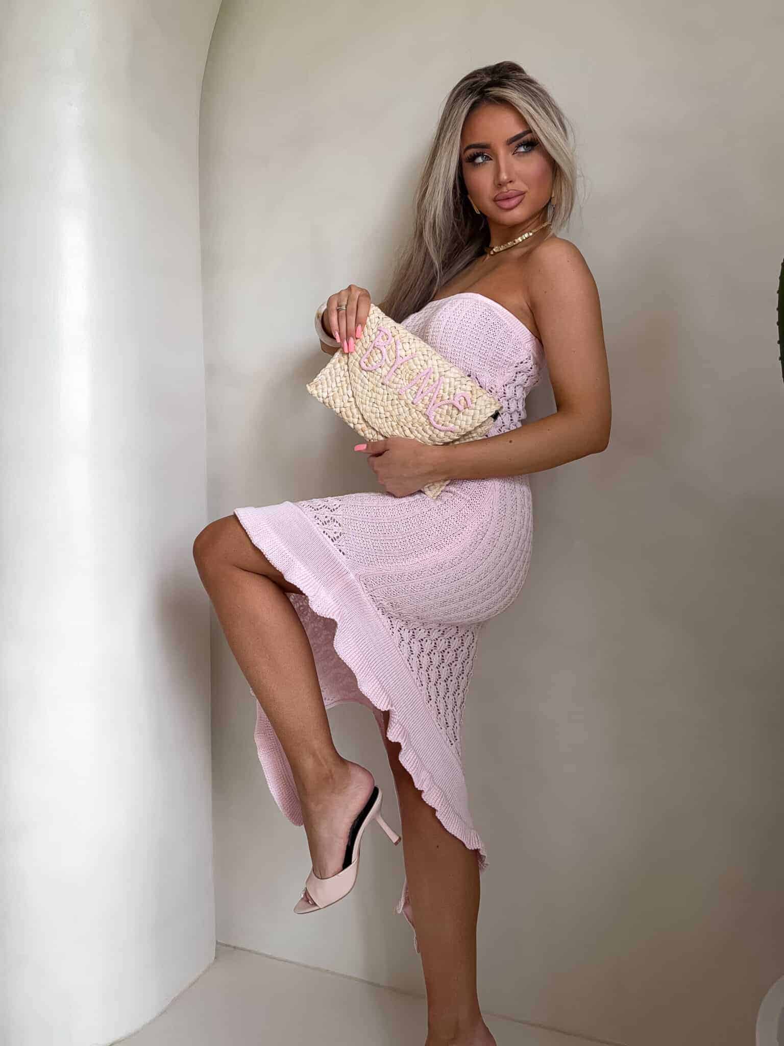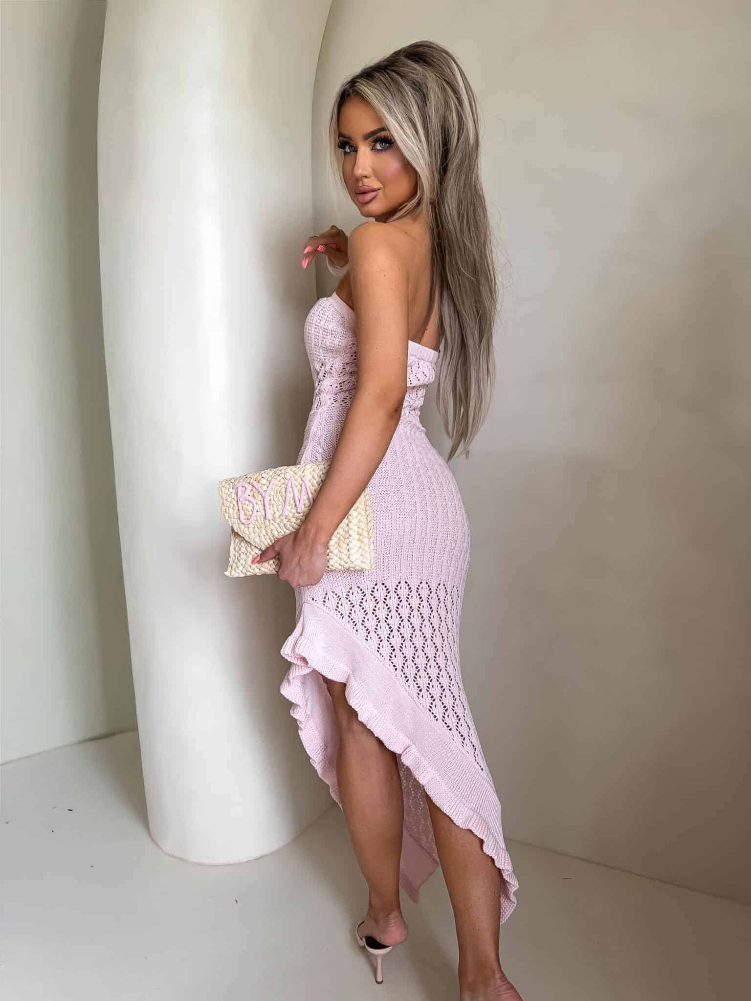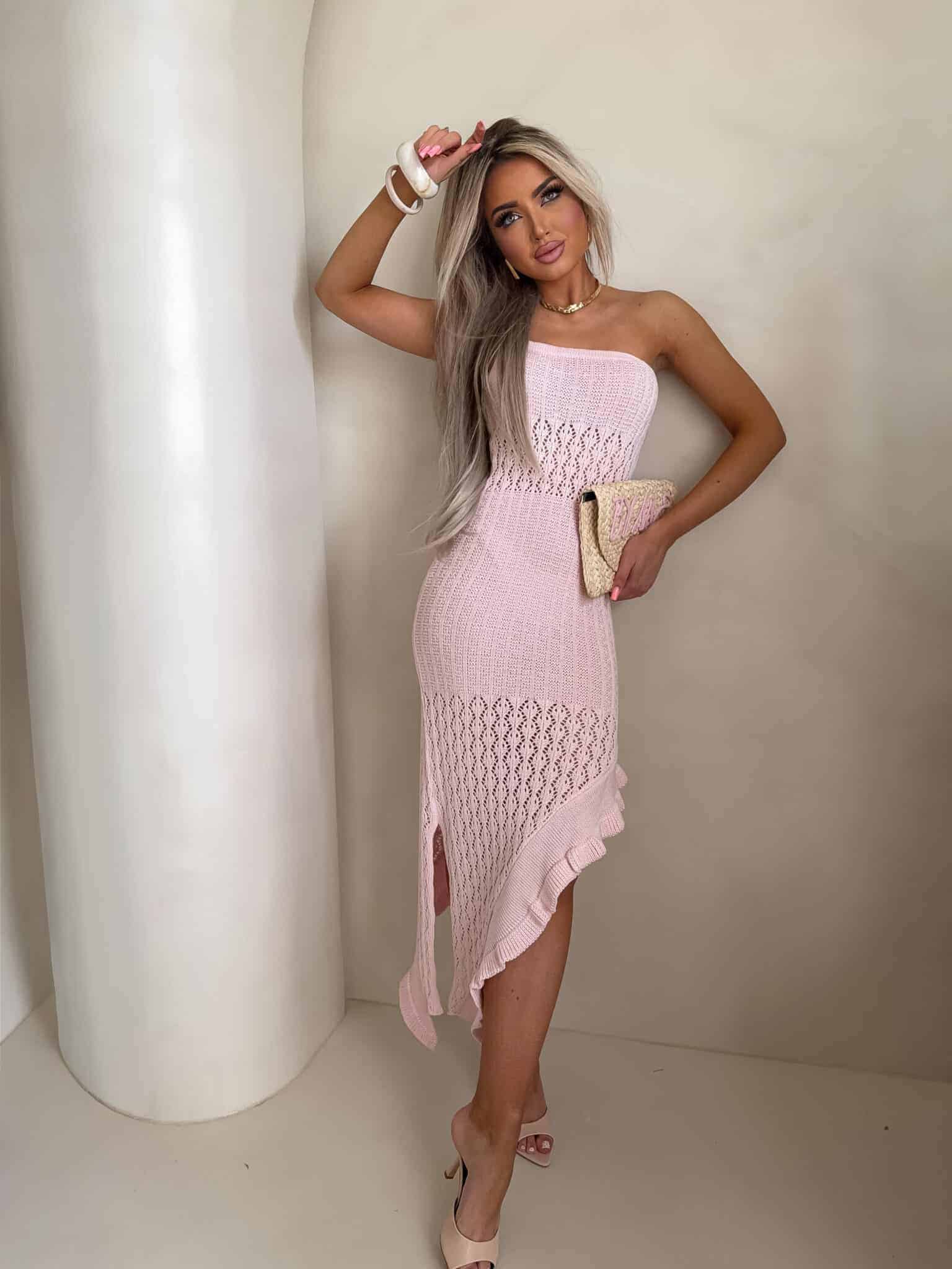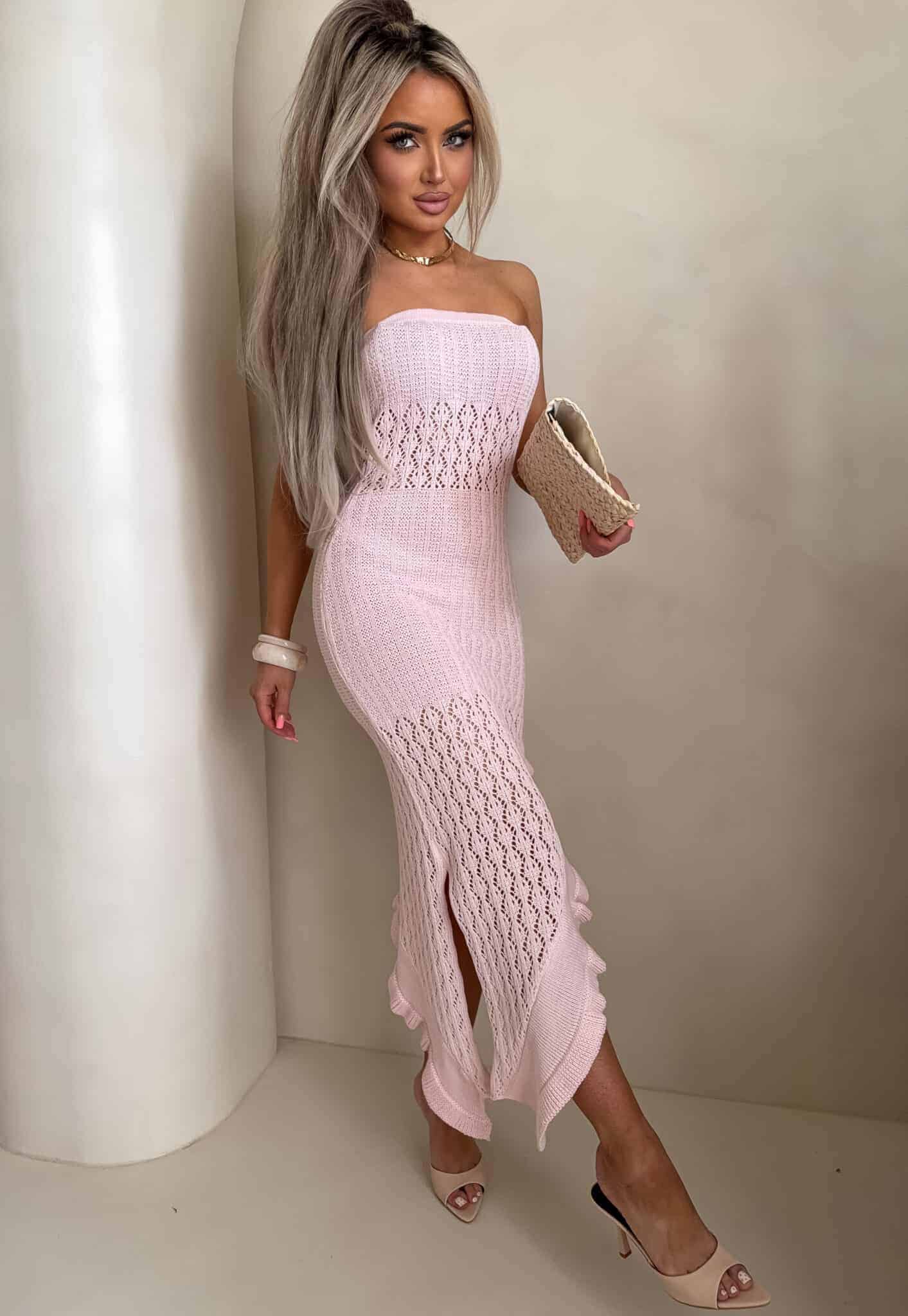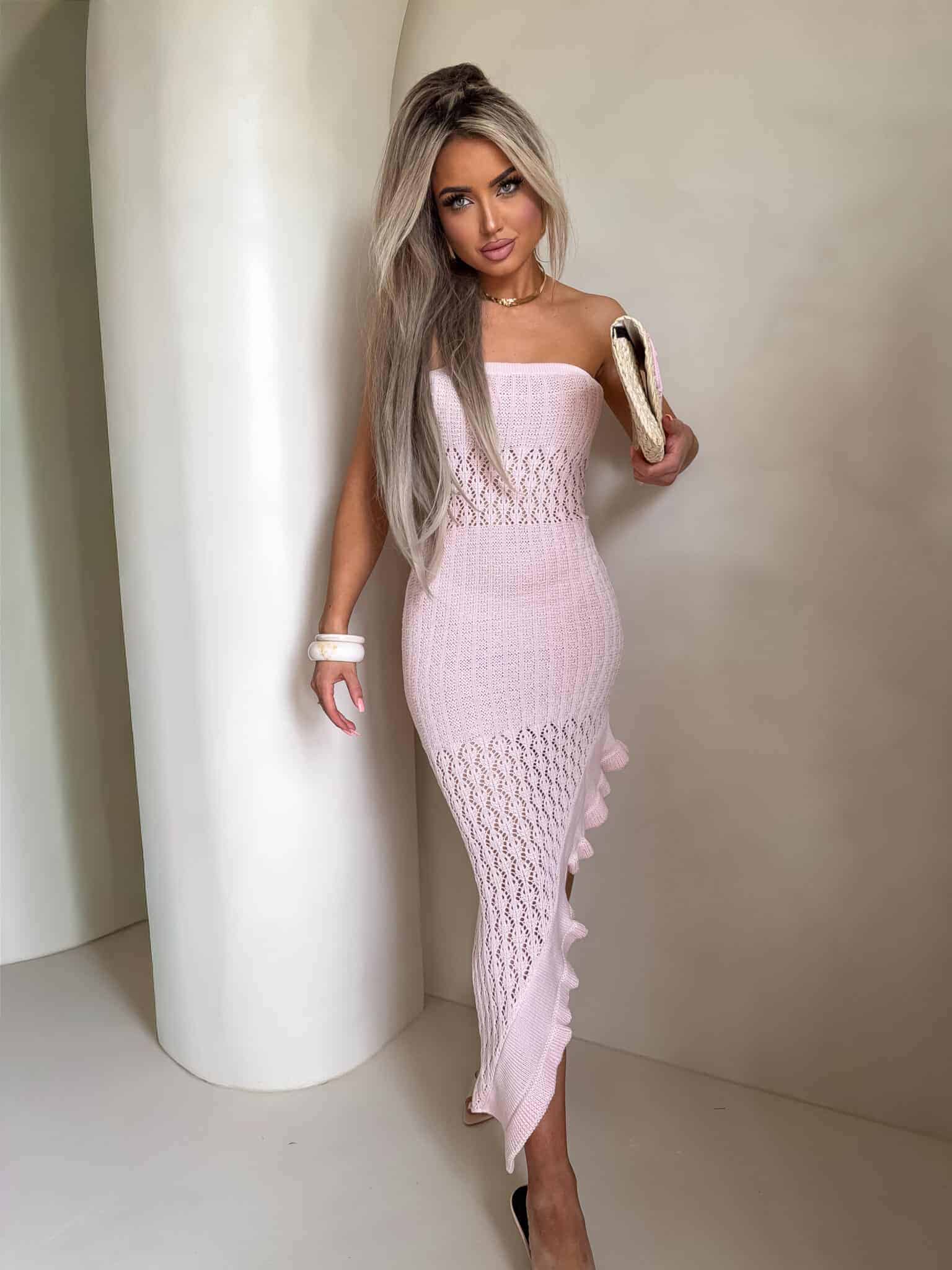 Zmysłowa i niezwykle stylowa sukienka maxi o dopasowanym kroju, wykonana z ażurowej, przewiewnej dzianiny – idealna na letnie, gorące dni. Model bez ramiączek z prostym dekoltem typu bandeau pięknie eksponuje ramiona i dekolt, podkreślając kobiecą sylwetkę.