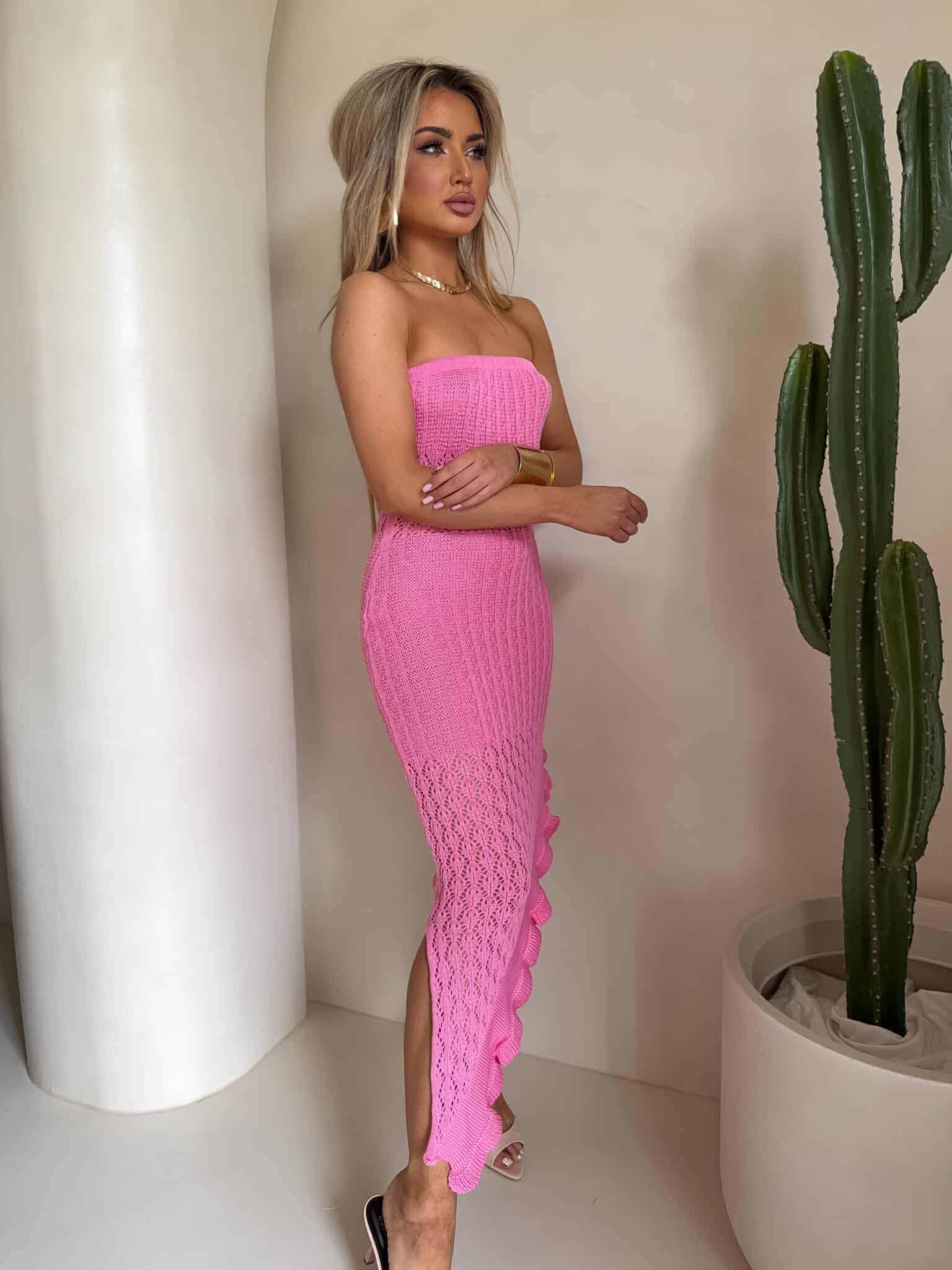 Zmysłowa i niezwykle stylowa sukienka maxi o dopasowanym kroju, wykonana z ażurowej, przewiewnej dzianiny – idealna na letnie, gorące dni. Model bez ramiączek z prostym dekoltem typu bandeau pięknie eksponuje ramiona i dekolt, podkreślając kobiecą sylwetkę.