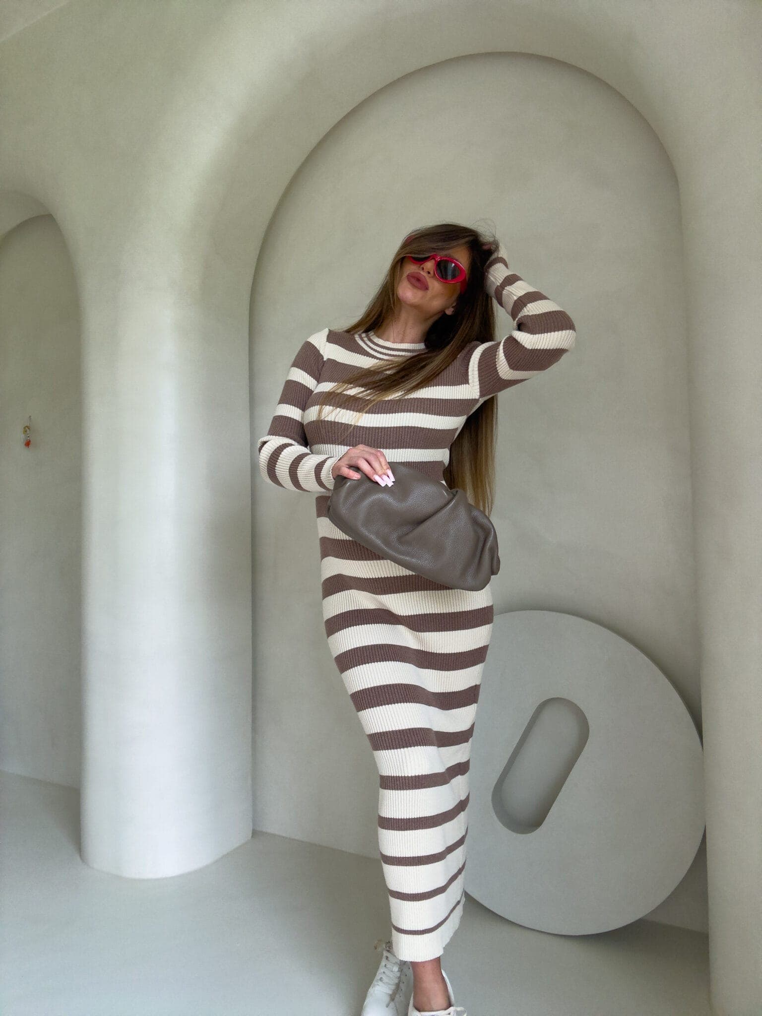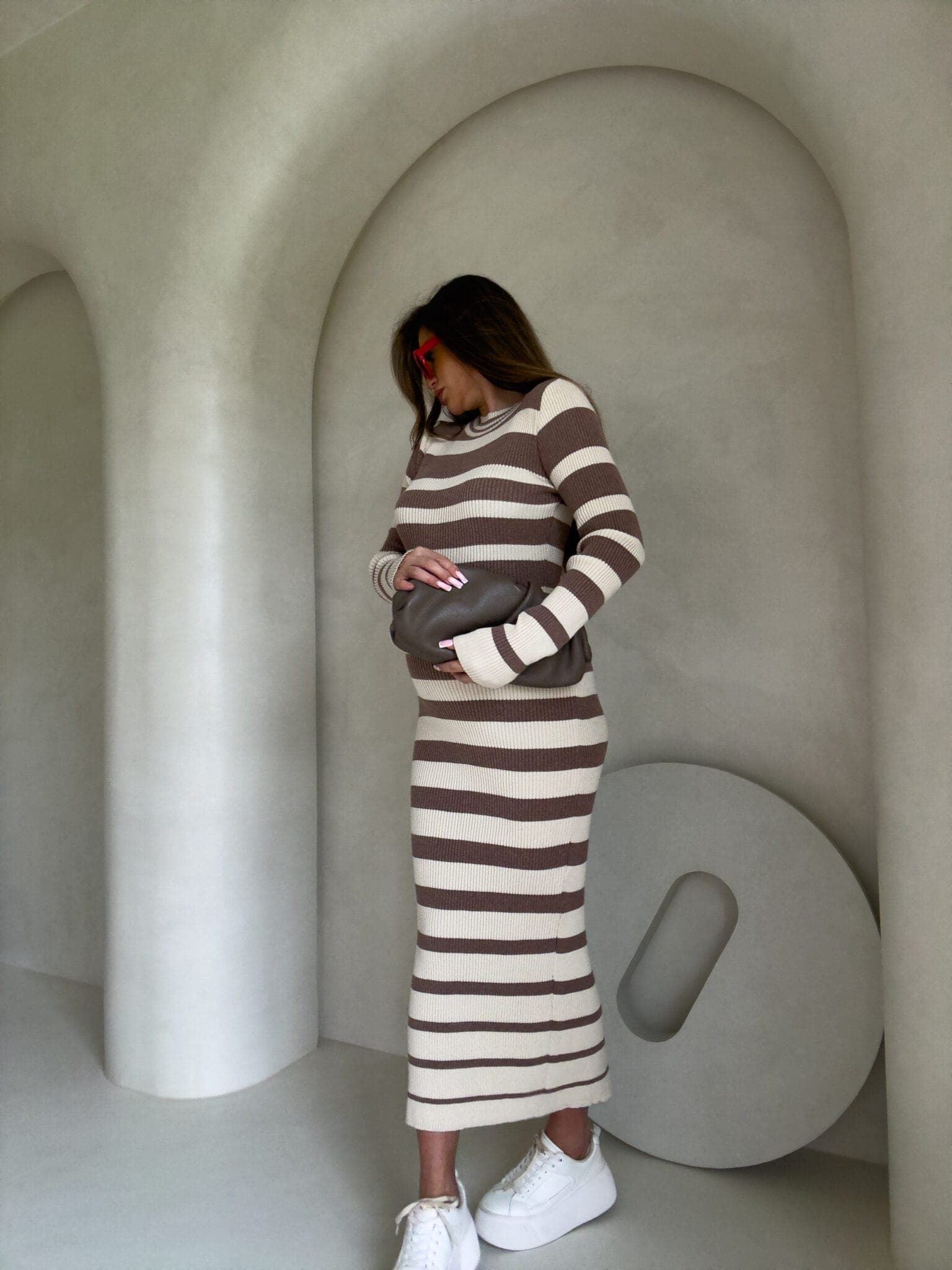 Dzianinowa sukienka, dopasowana w klasyczne poziome pasy. Na długi rękaw, sięga do kostek, co nadaje jej elegancki i minimalistyczny wygląd. Wzór pasków jest regularny, co optycznie podkreśla sylwetkę. Materiał prążkowany dzianinowy splot, który dobrze układa się na ciele.
