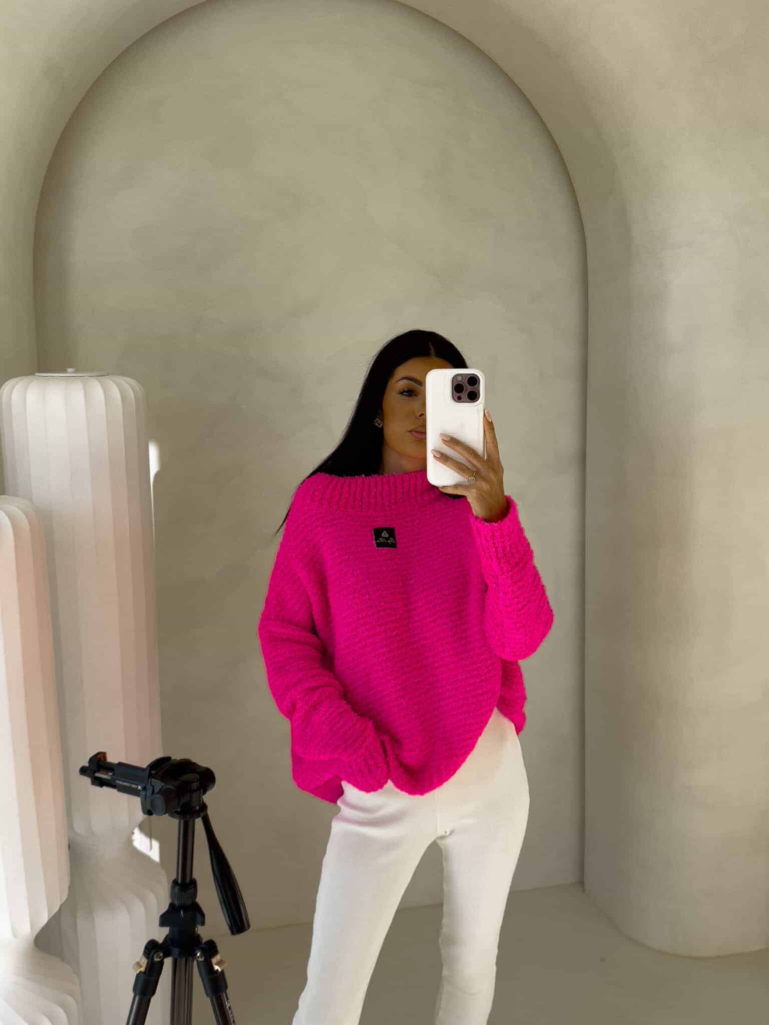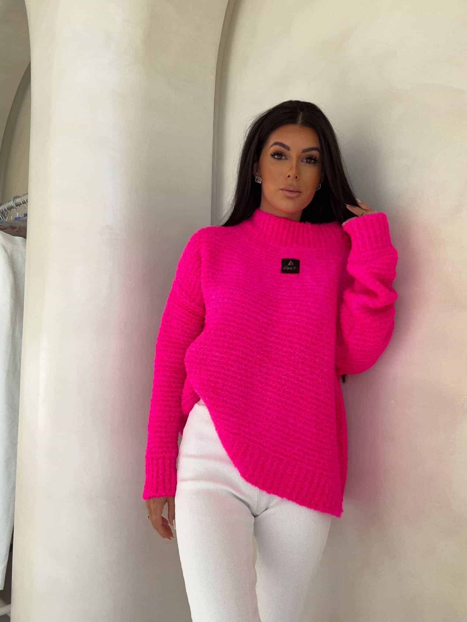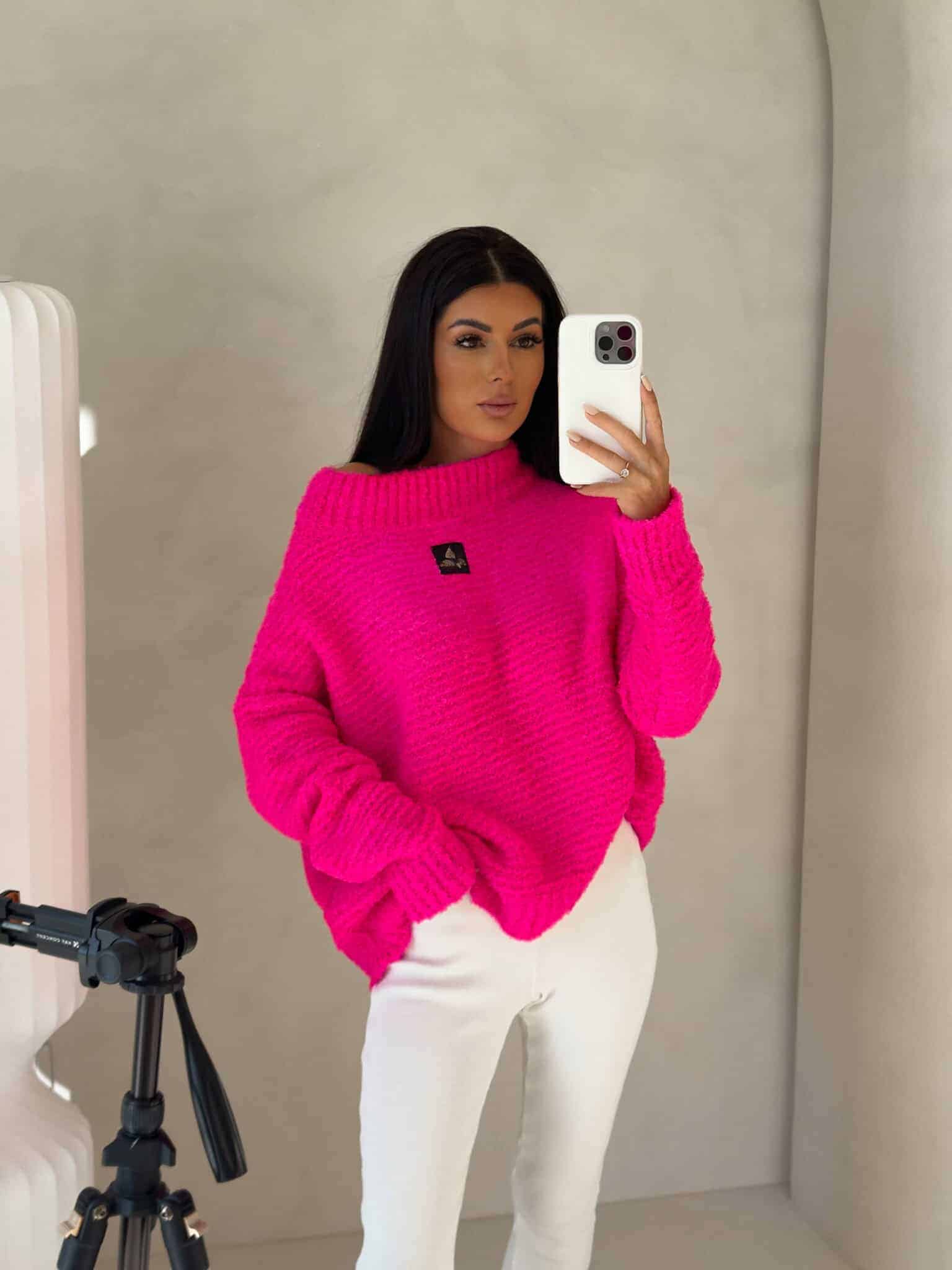 Sweter Bucla ma luźny, oversize’owy krój i jest wykonany z miękkiej, puszystej dzianiny. Posiada klasyczny, okrągły dekolt zakończony ściągaczem oraz długie rękawy, również wykończone szerokimi ściągaczami. Na przodzie, na wysokości klatki piersiowej, znajduje się mała, czarna naszywka z napisem „By Me” i delikatnym logo.