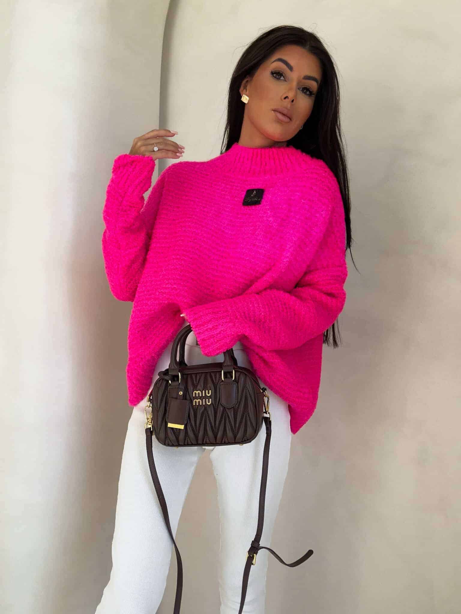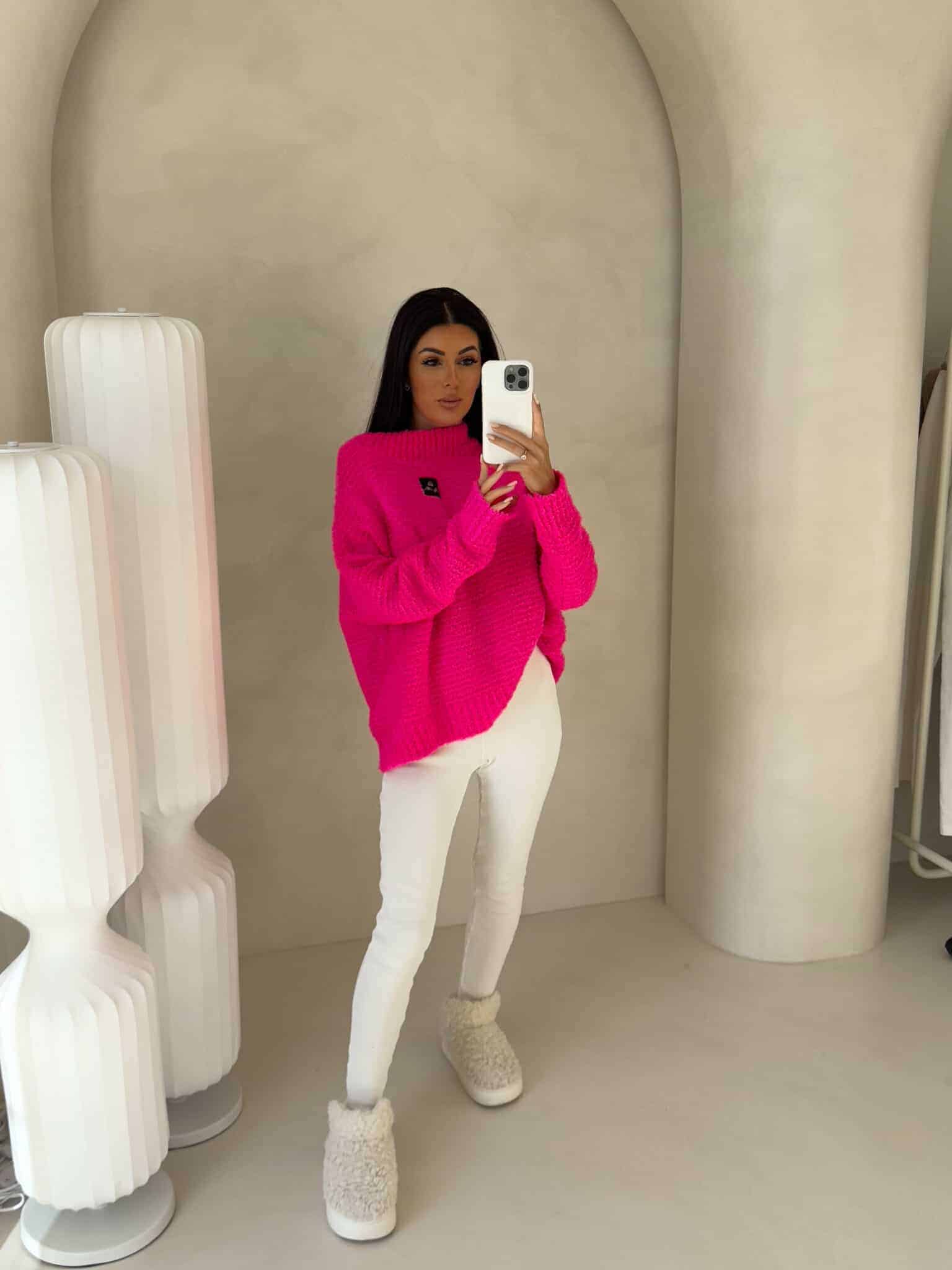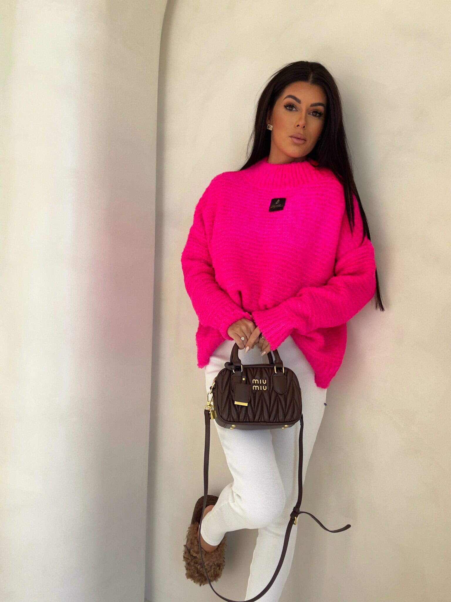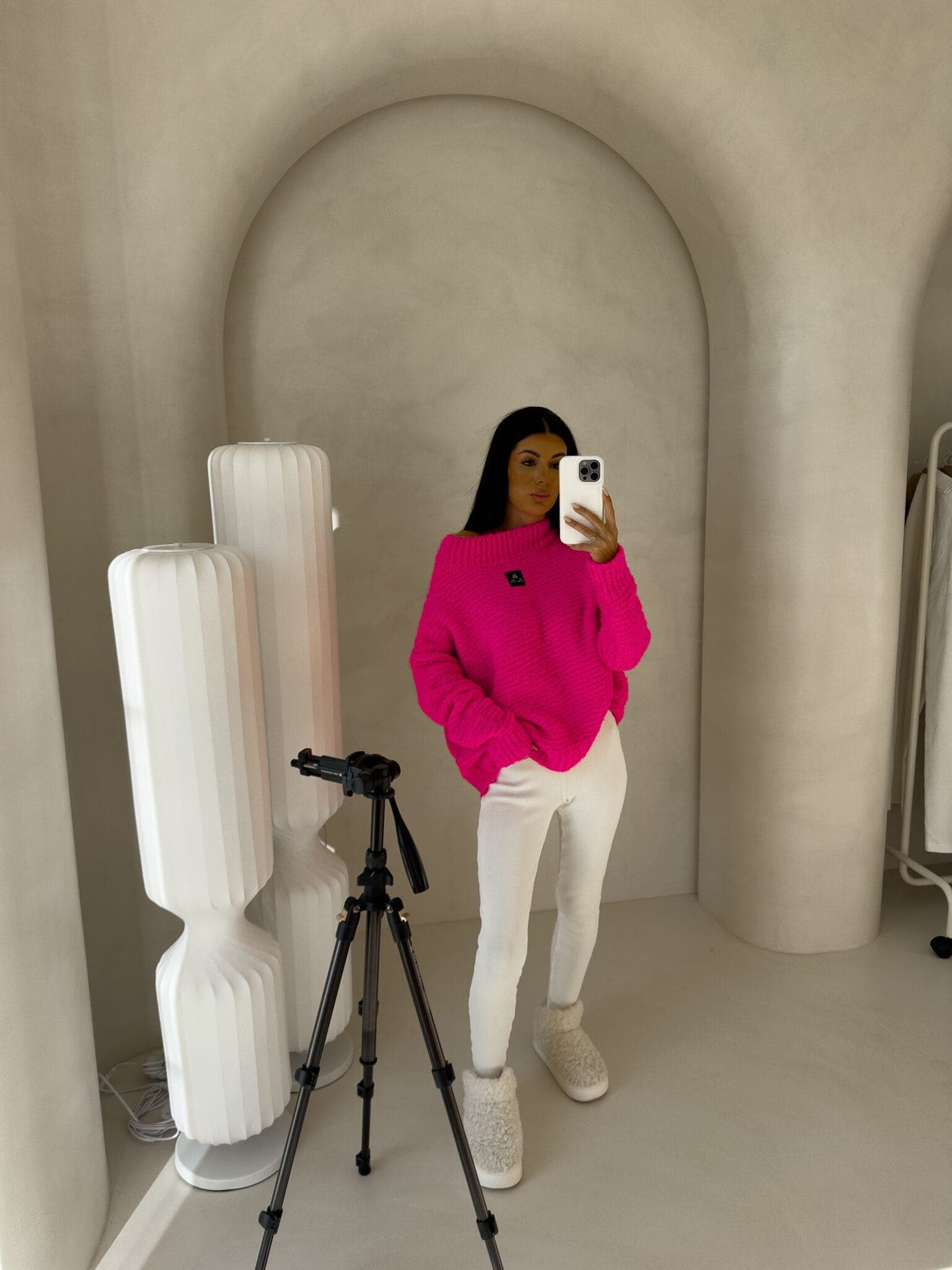 Sweter Bucla ma luźny, oversize’owy krój i jest wykonany z miękkiej, puszystej dzianiny. Posiada klasyczny, okrągły dekolt zakończony ściągaczem oraz długie rękawy, również wykończone szerokimi ściągaczami. Na przodzie, na wysokości klatki piersiowej, znajduje się mała, czarna naszywka z napisem „By Me” i delikatnym logo.