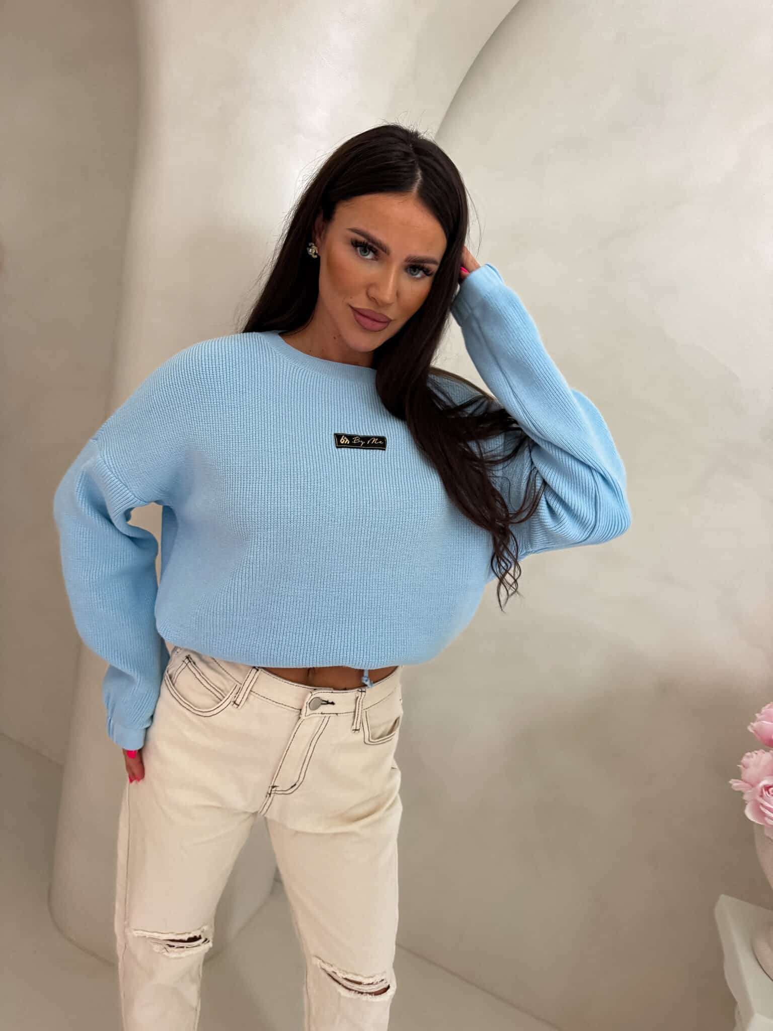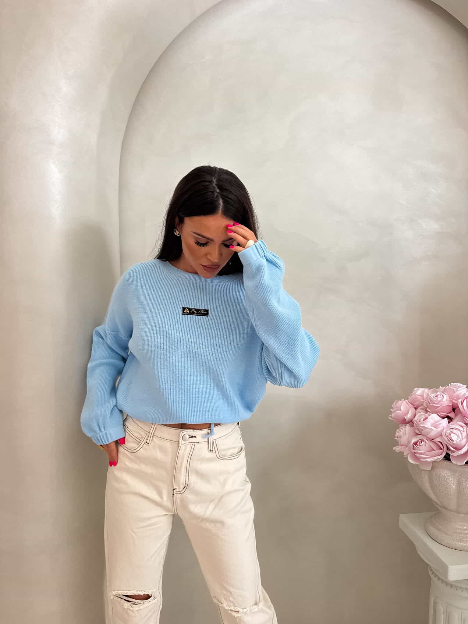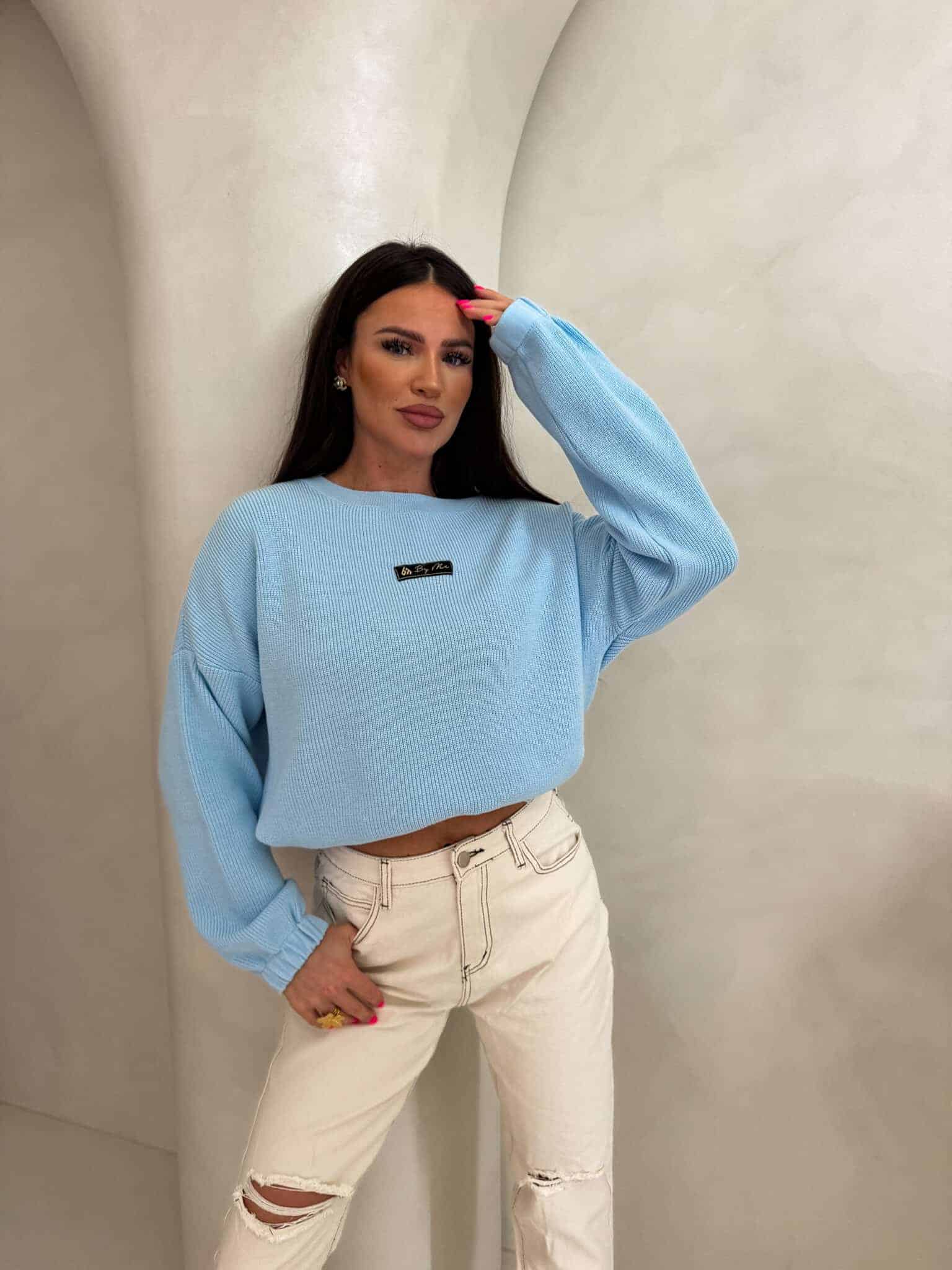 Oversize’owy sweter z długimi rękawami, zakładany przez głowę, wyposażony w troczki umożliwiające regulację długości – możesz nosić go na różne sposoby, dopasowując do swojego stylu.