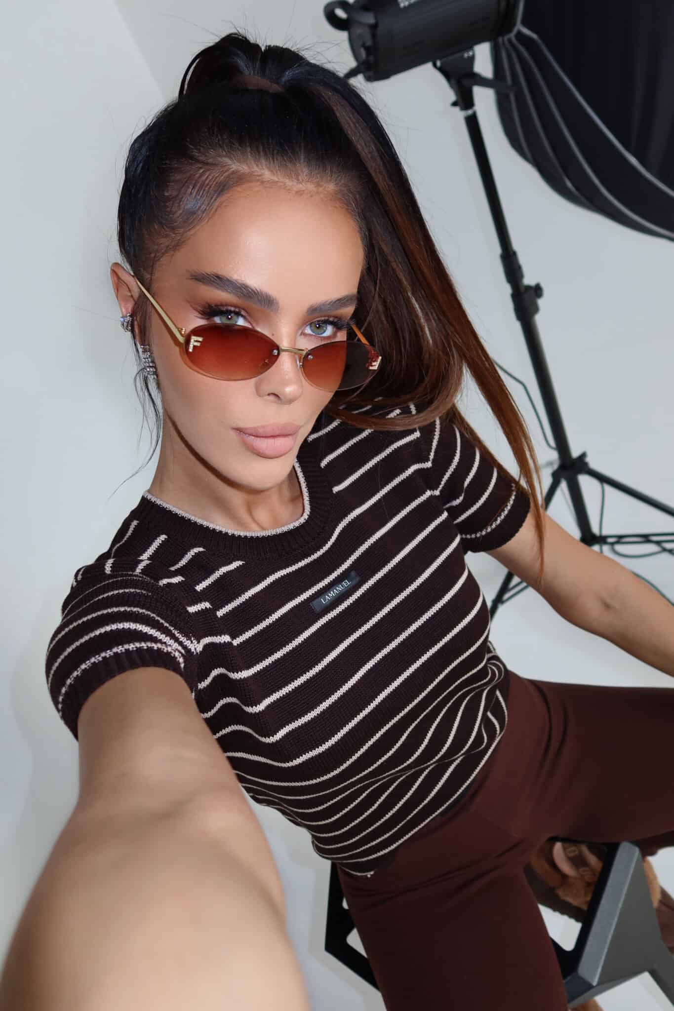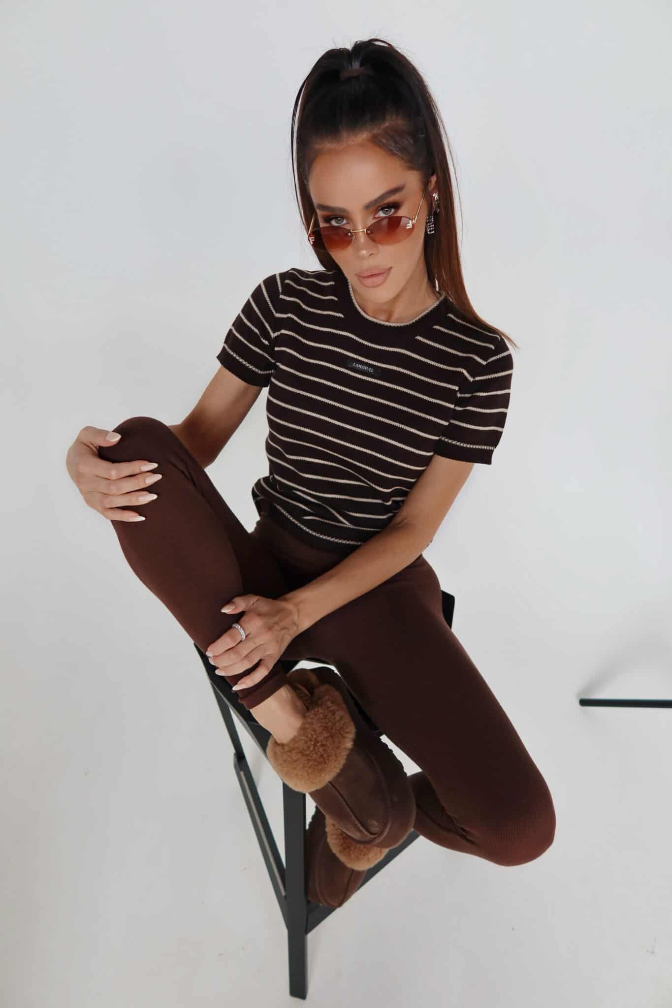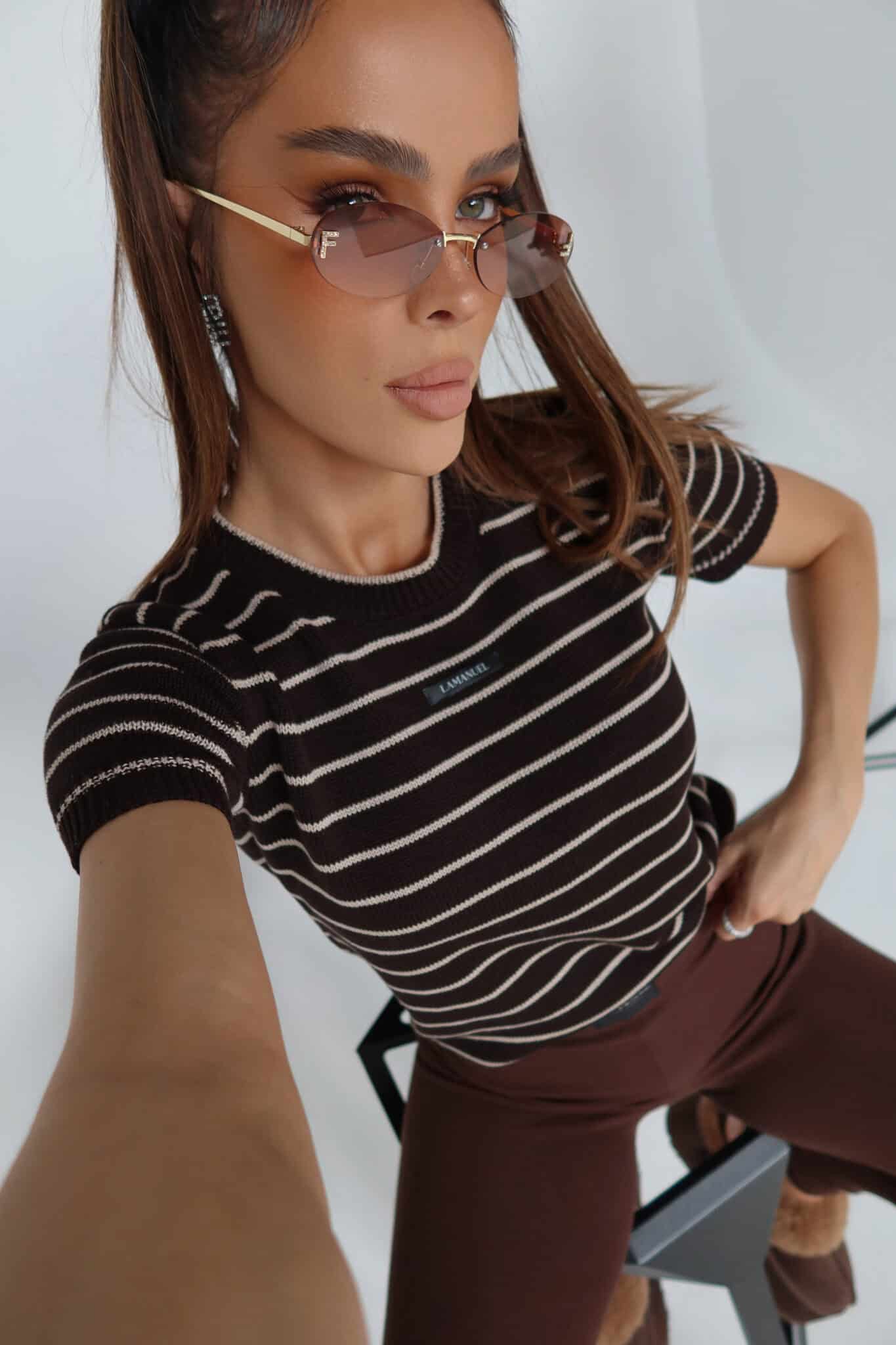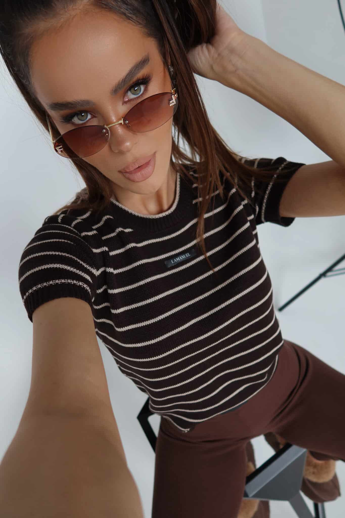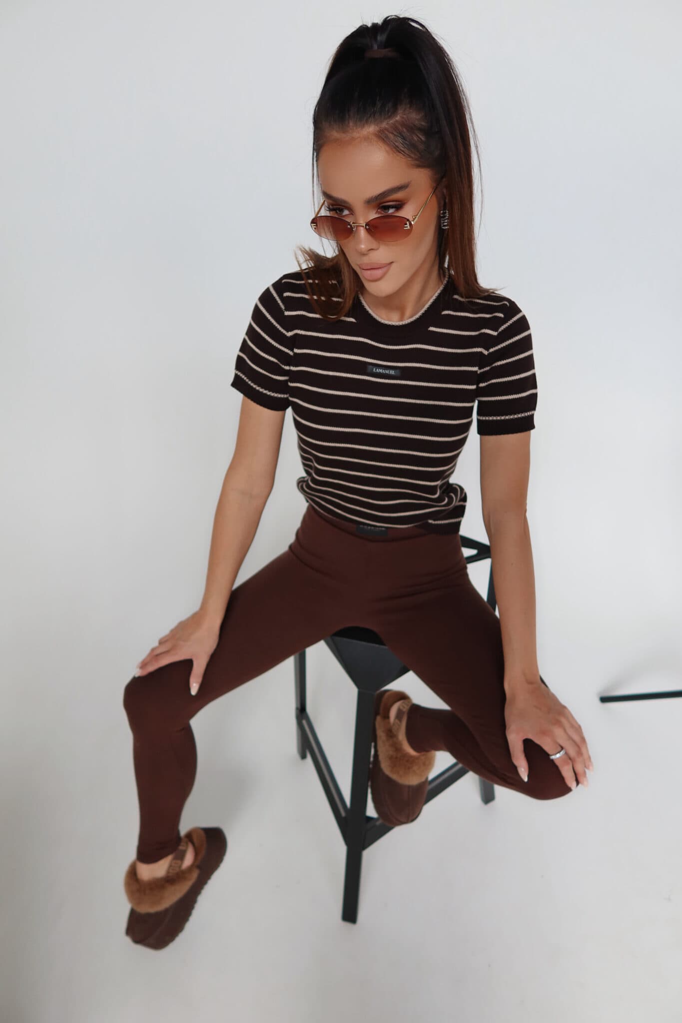 Krótkorękawowy sweter z dzianiny o gęstym splocie i prostym, lekko dopasowanym fasonie. Model w ponadczasowy wzór w paski z okrągłym dekoltem i wykończeniem ściągaczowym przy szyi, rękawach i dole. Z przodu naszywka z logo, która subtelnie domyka look. Idealny do jeansów, spódnic i pod marynarkę – must have na cały rok.Skład: 50% bawełna 50% akryl