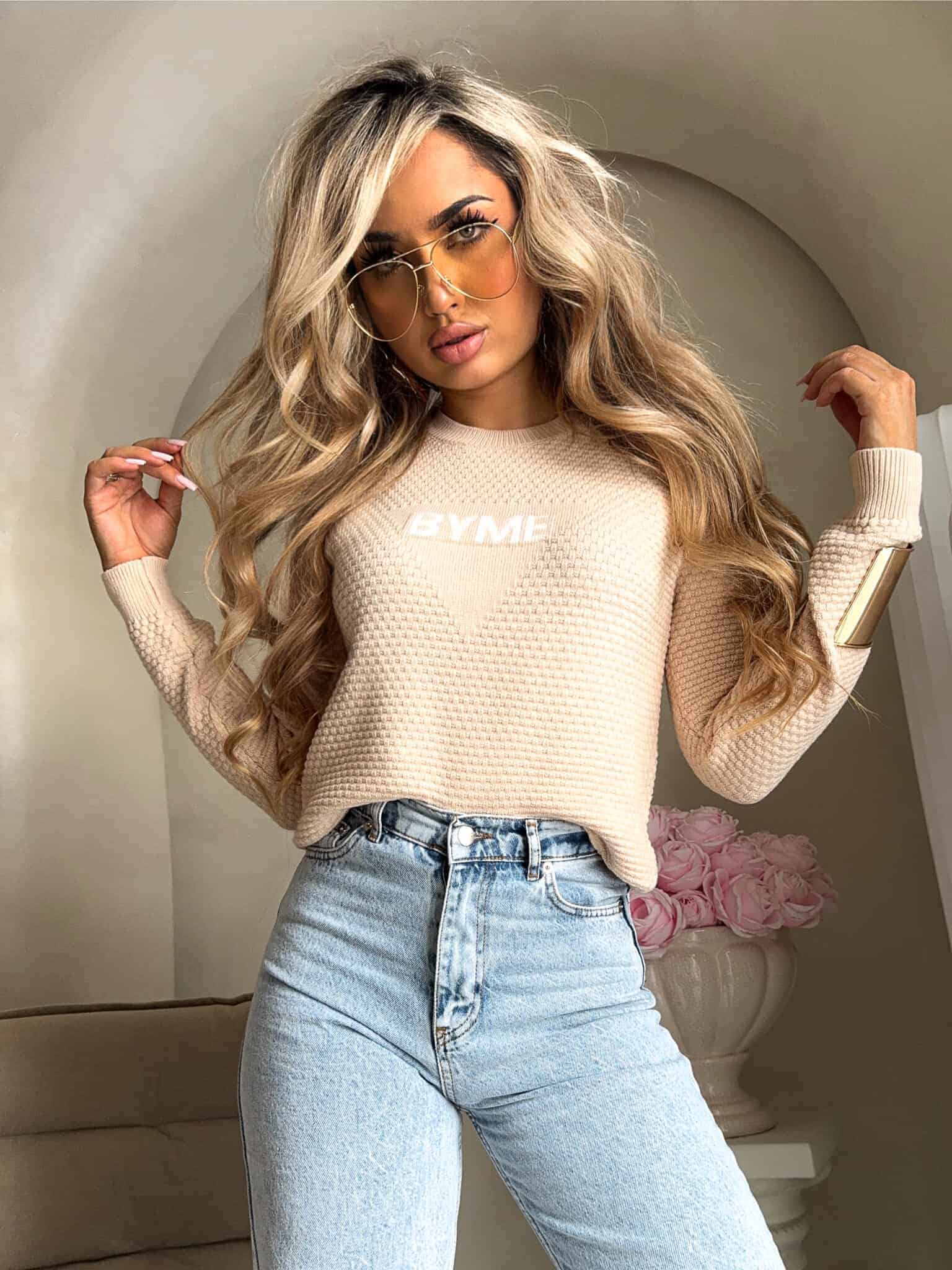 Sweter o dopasowanym kroju z długimi rękawami. Na środku klatki piersiowej umieszczony subtelny napis „BYME”, który nadaje całości minimalistyczny charakter. Model posiada klasyczny, okrągły dekolt.