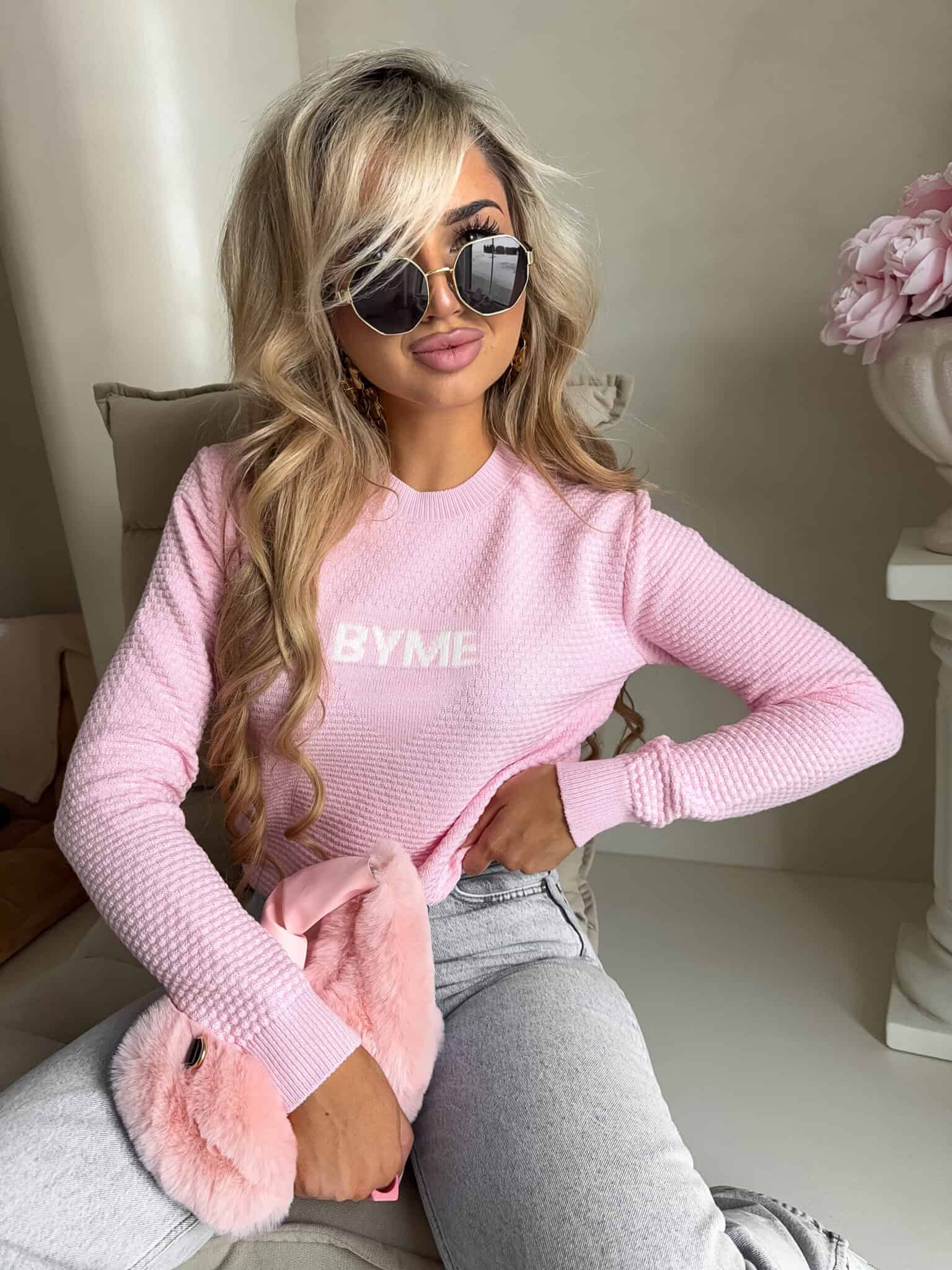 Sweter o dopasowanym kroju z długimi rękawami. Na środku klatki piersiowej umieszczony subtelny napis „BYME”, który nadaje całości minimalistyczny charakter. Model posiada klasyczny, okrągły dekolt.
