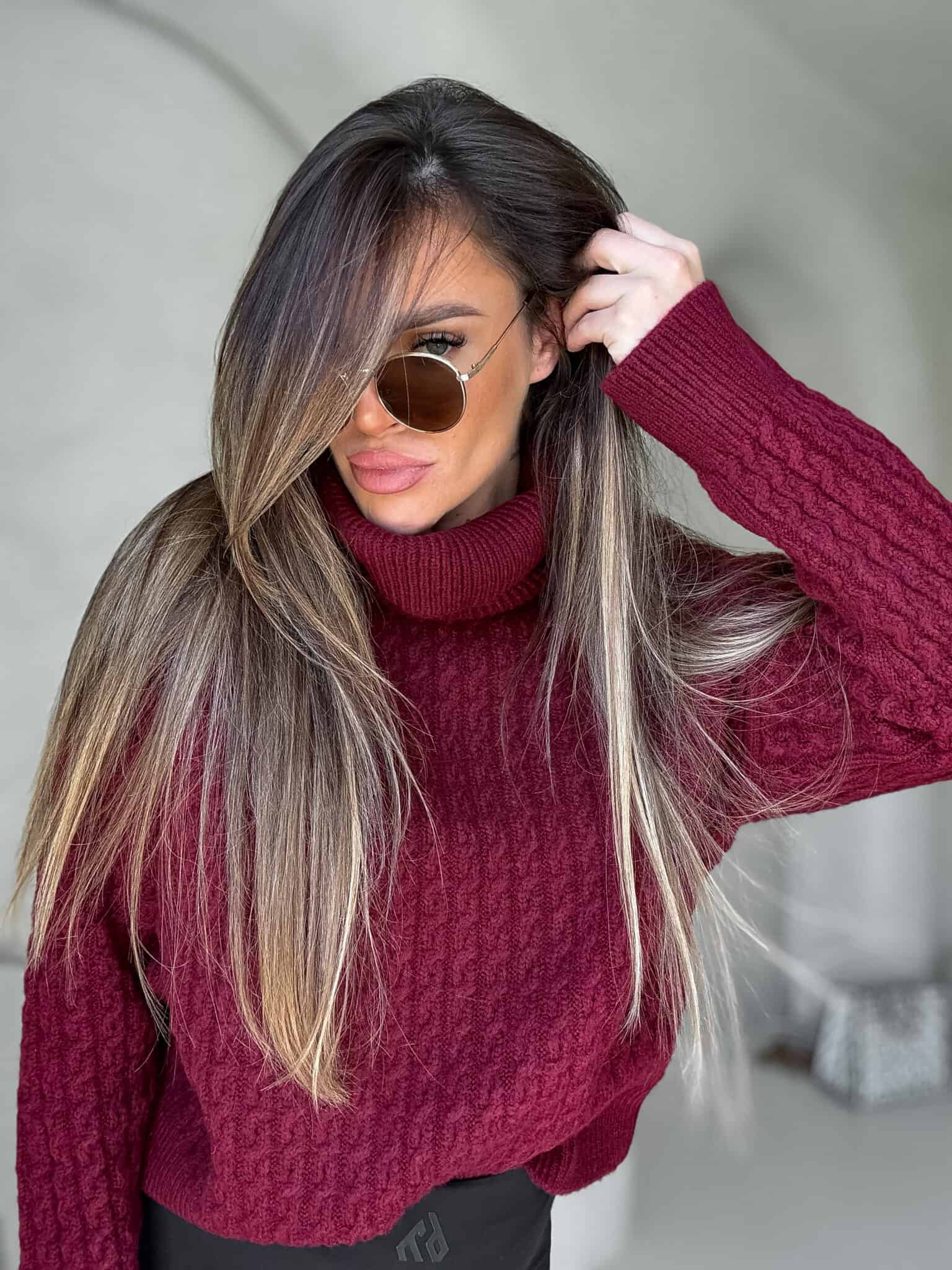 Sweter z golfem, wkładany przez głowę, na długi rękaw z ciekawym splotem. Bardzo ciepły.
