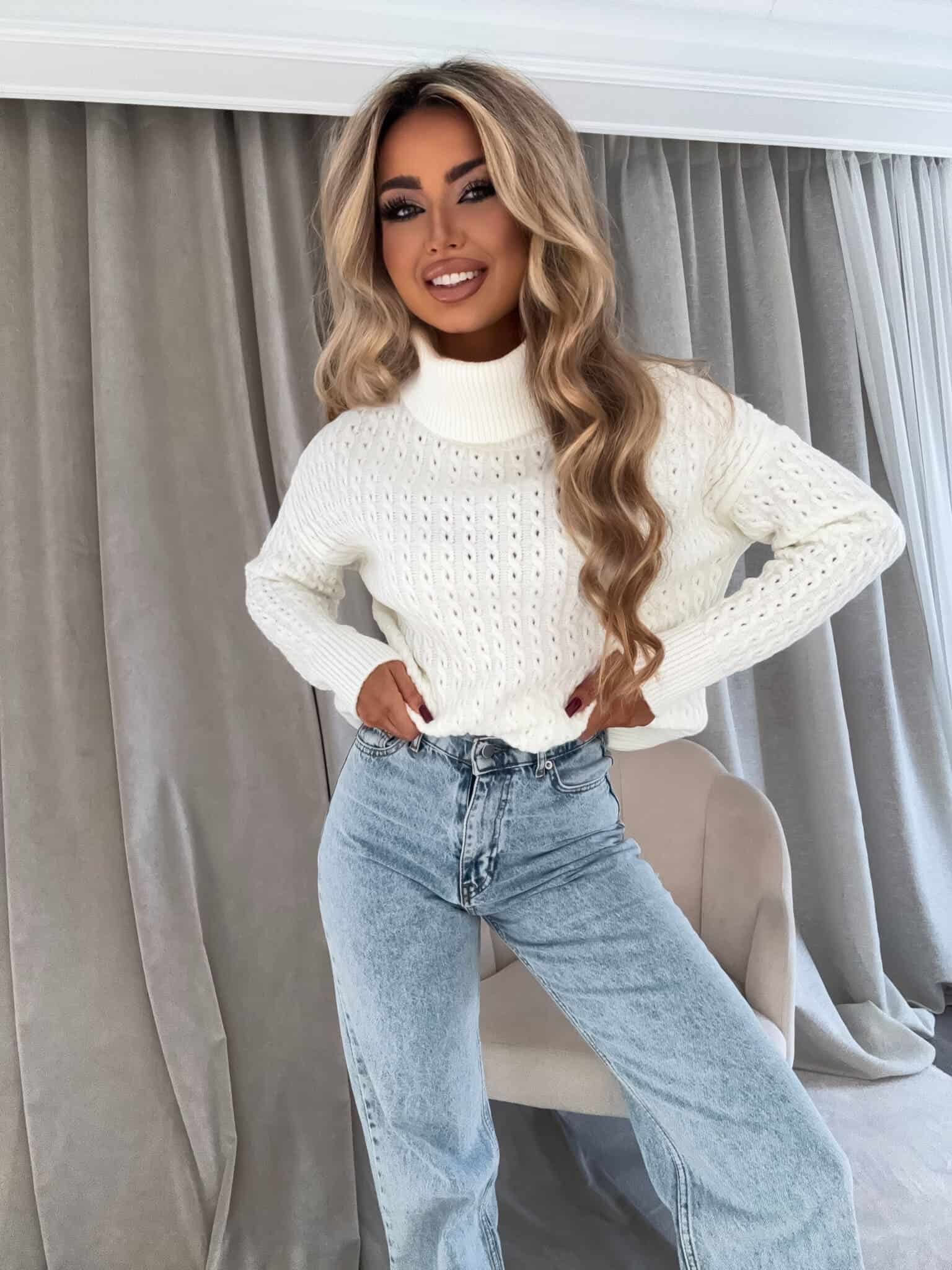 Sweter z golfem, wkładany przez głowę, na długi rękaw z ciekawym splotem. Bardzo ciepły.
