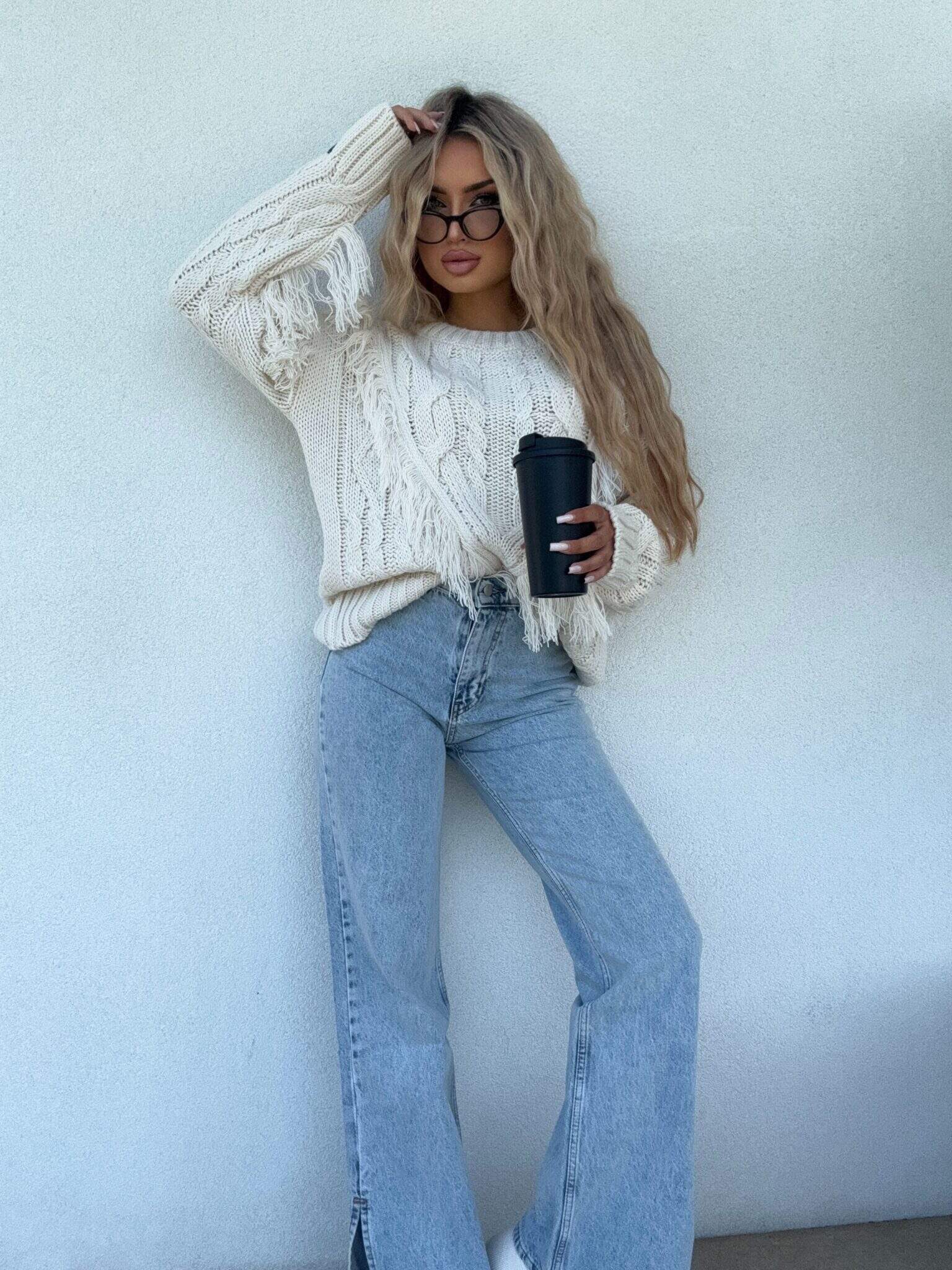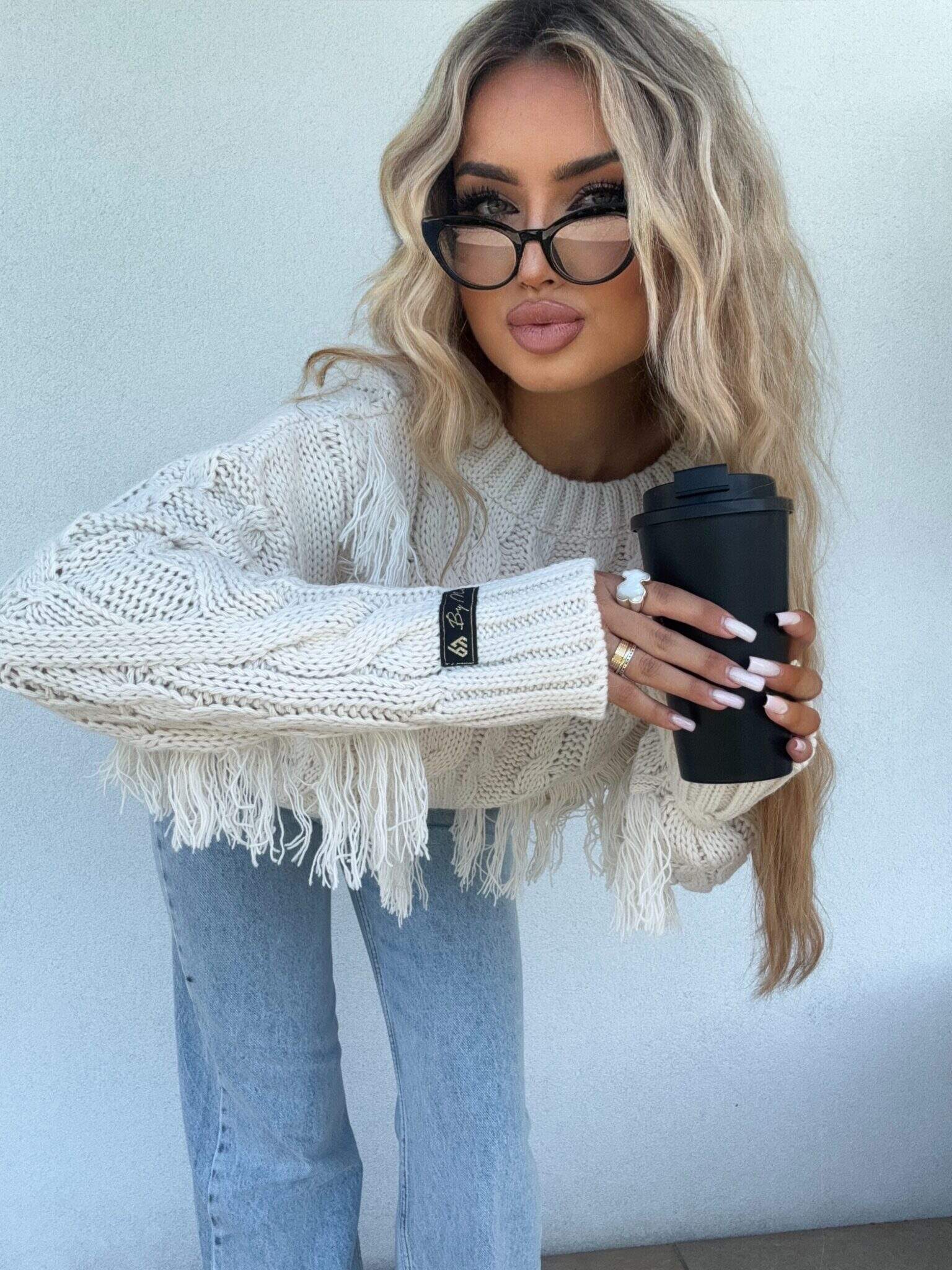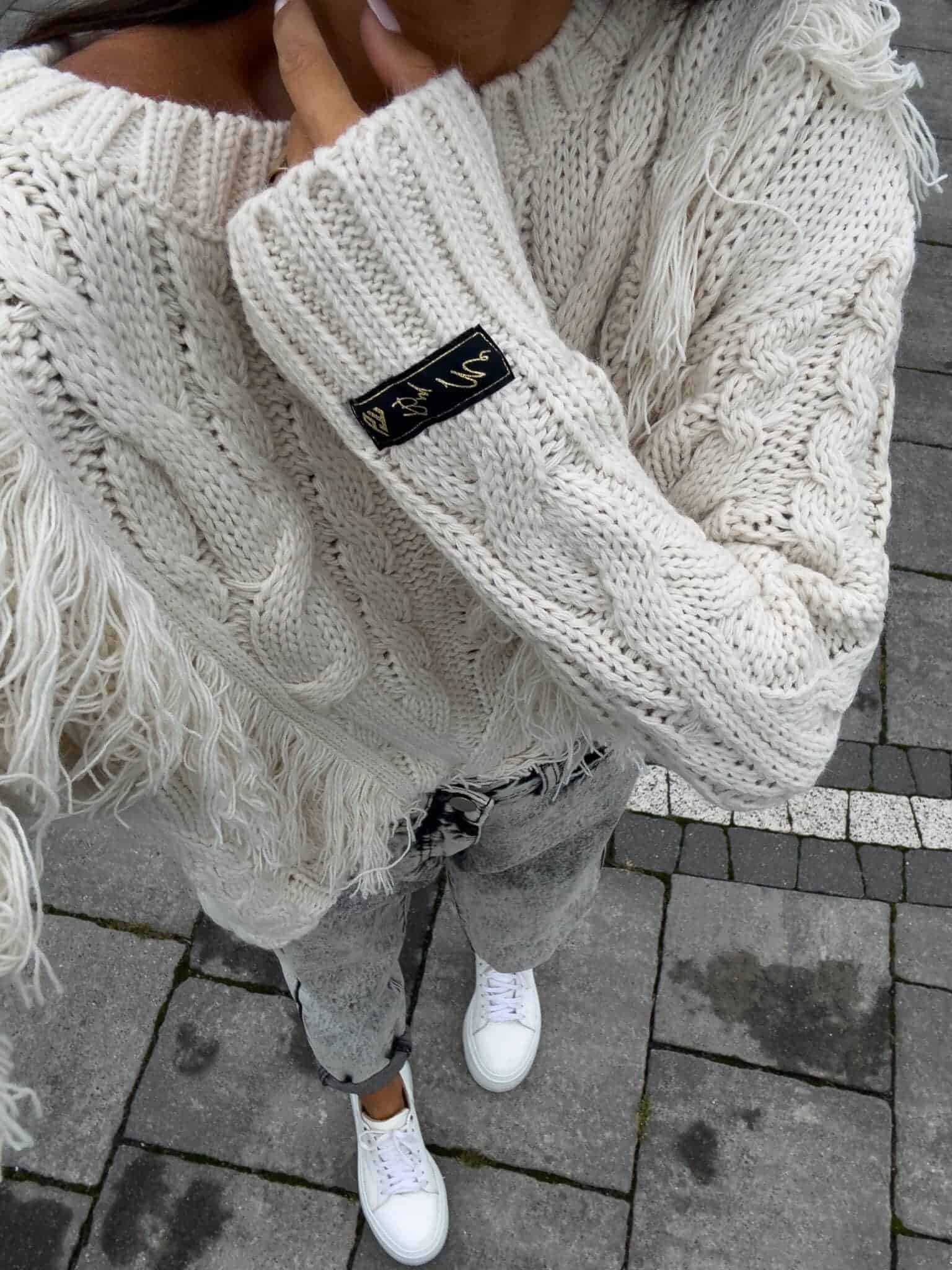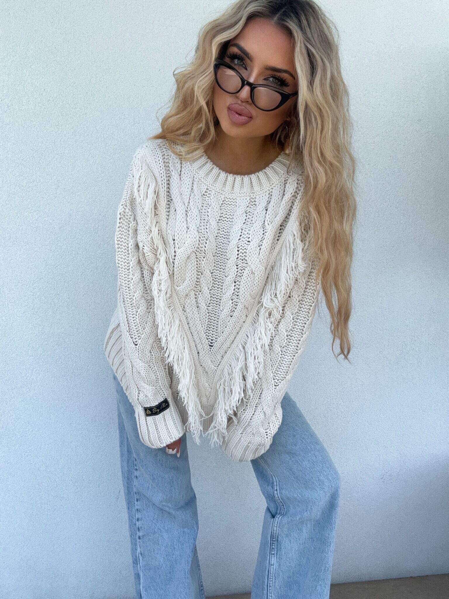 Stylowy sweter o luźnym, oversize’owym kroju, wykonany z miękkiego, plecionego materiału z wyraźnym wzorem warkoczy. Jego wyjątkowy design podkreślają ozdobne frędzle, które dodają całości oryginalnego charakteru i nawiązują do stylu boho. Długie rękawy zapewniają komfort noszenia i świetnie sprawdzają się w chłodniejsze dni.