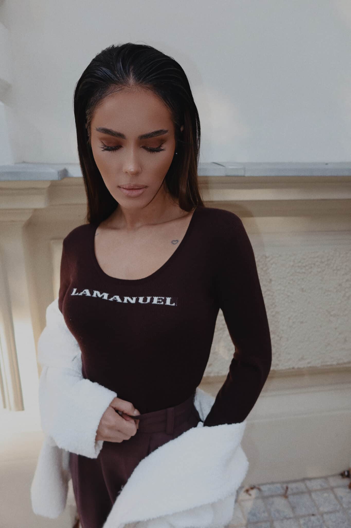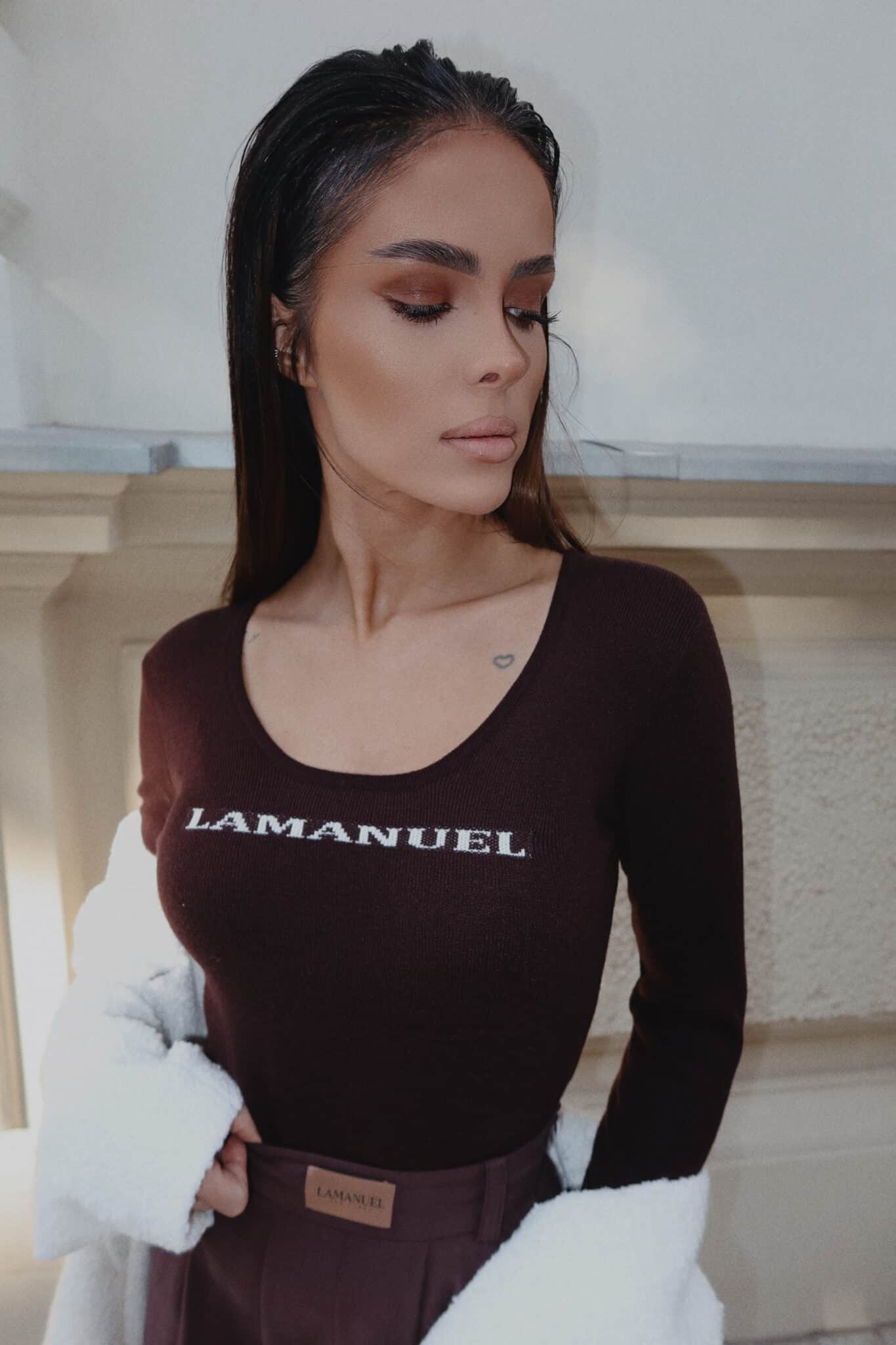Dopasowany sweterek z głębokim dekoltem, który subtelnie podkreśla sylwetkę i zostaje w pamięci dzięki wyrazistemu logotypowi z przodu. Minimalistyczna forma przełamana mocnym brandingiem tworzy stylowy balans między klasyką a nowoczesnością. Noś solo albo pod marynarkę – sprawdzi się w każdej wersji, od porannego spotkania po wieczorny drink.Skład: 50% akryl 50% bawełna