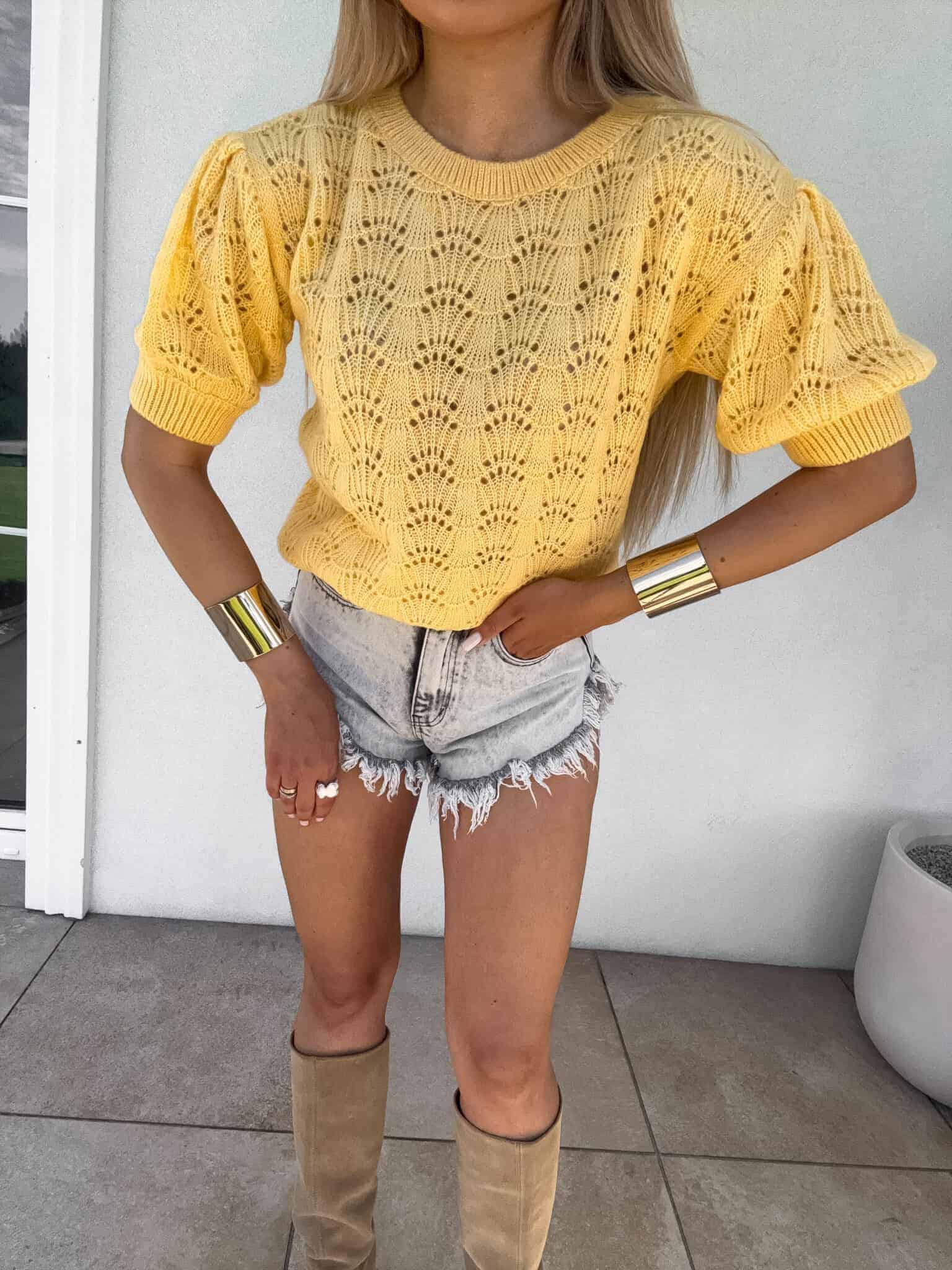 Sweter ażurowy o ciekawym splocie, wykonany z lekkiej, przewiewnej dzianiny, która nadaje mu subtelną fakturę. Charakteryzuje się krótkimi rękawami, które idealnie komponują się z luźnym krojem, sprawiając, że sweter jest wygodny i swobodny w noszeniu. Jego unikalny splot ażurowy tworzy delikatne wzory, które przyciągają wzrok. Dzięki elastycznym brzegom na rękawach i dole, sweter można lekko opuścić na jedno ramię, co nadaje mu casualowy, lekko zmysłowy charakter. Doskonały do letnich stylizacji, pasuje do spodenek, spódnic czy jeansów, dodając lekkości i swobody.
