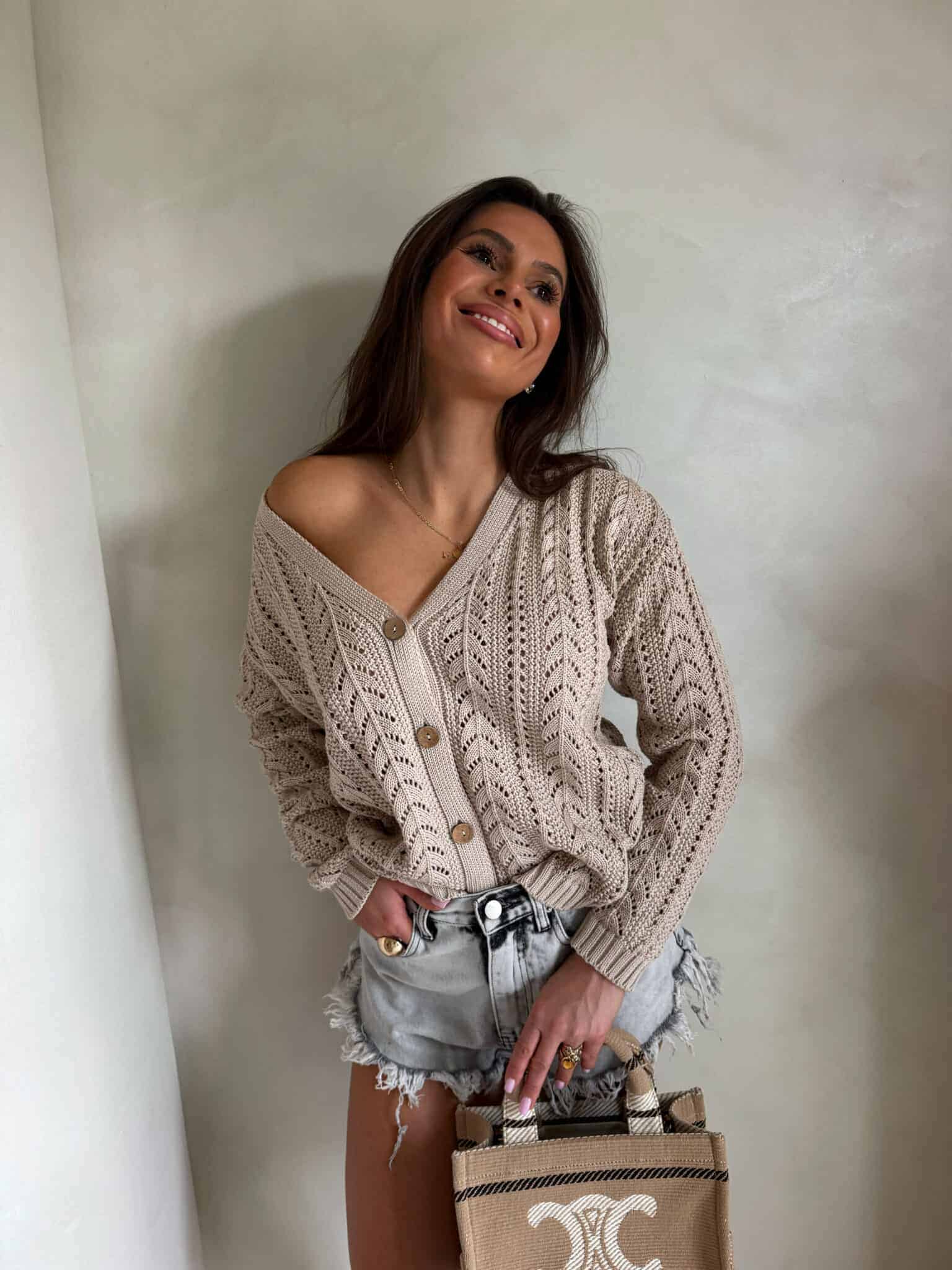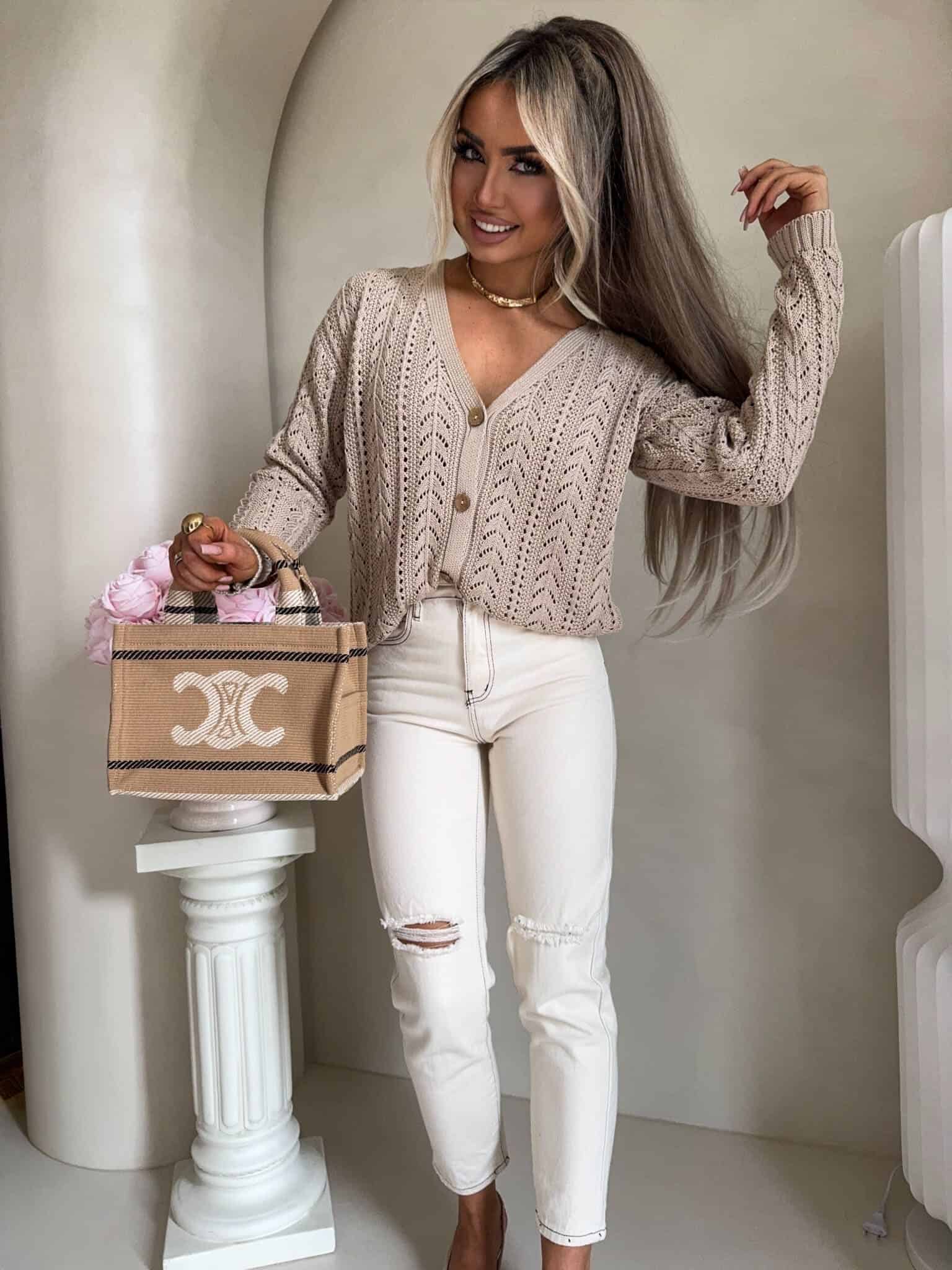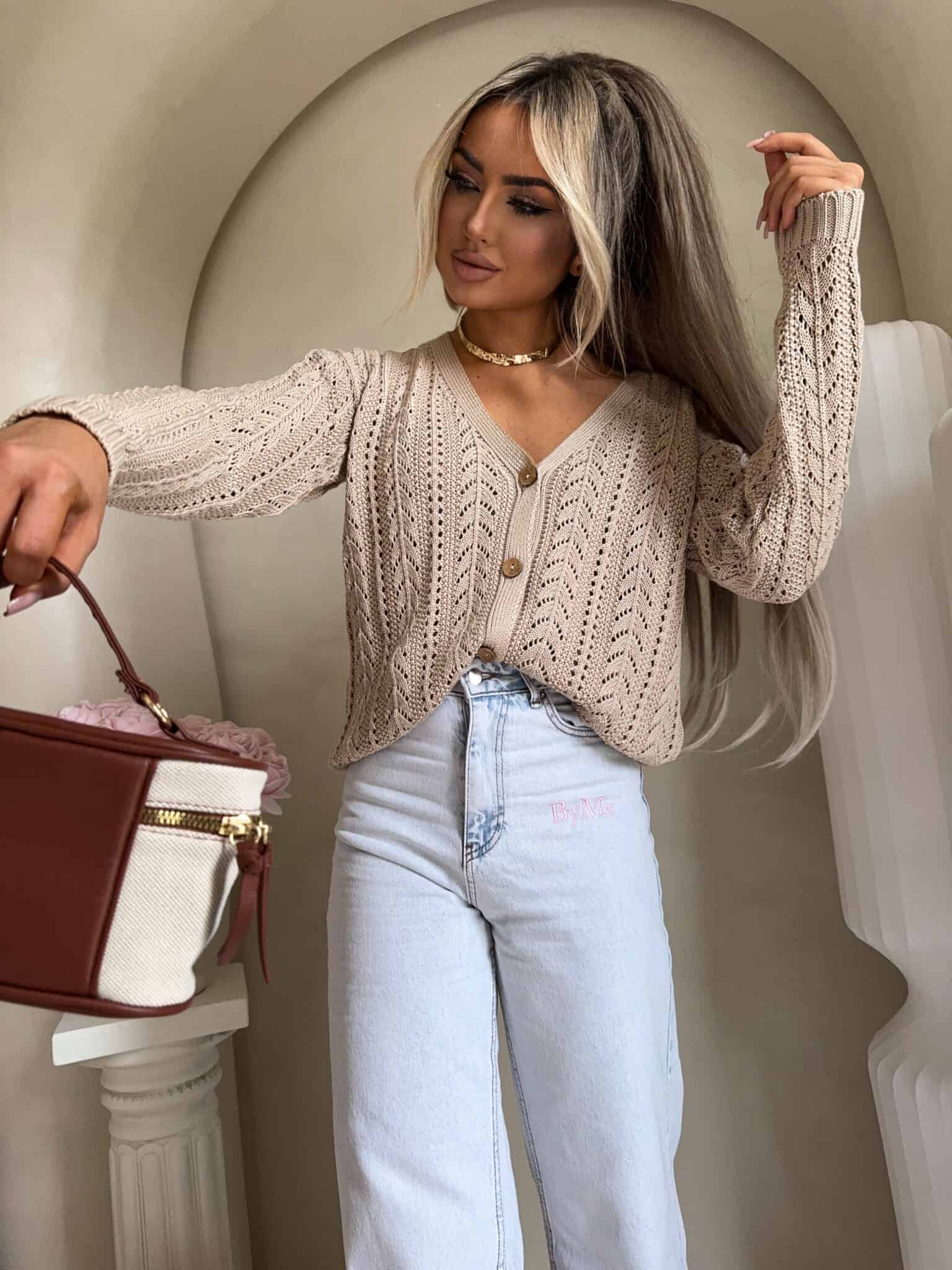Sweter z dzianiny o ażurowym, dekoracyjnym splocie, który nadaje całości lekkości i subtelnego charakteru. Model o krótkim fasonie z dekoltem w serek, zapinany z przodu na stylowe drewniane guziki. Długie rękawy zakończone są ściągaczami, podobnie jak dół swetra.