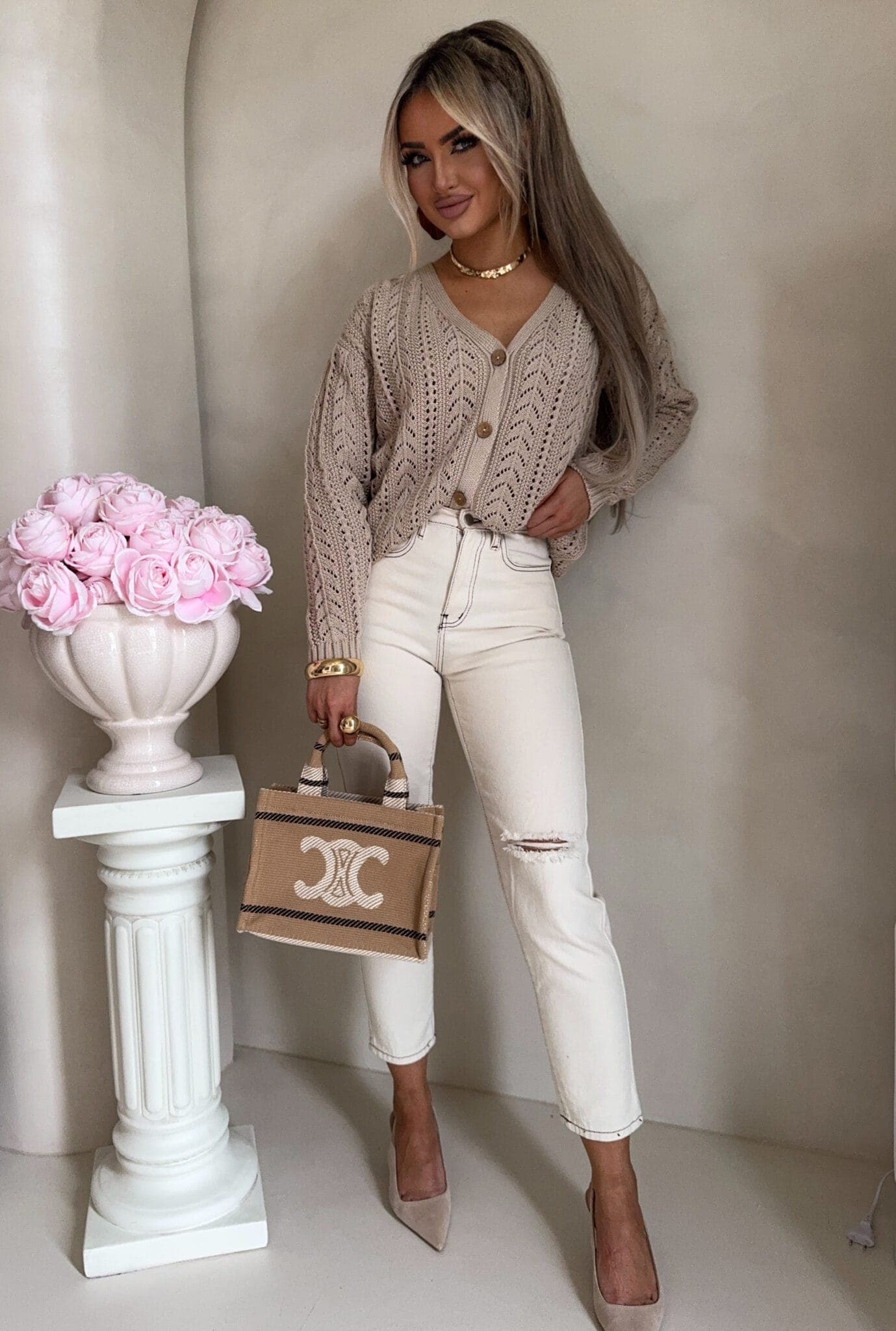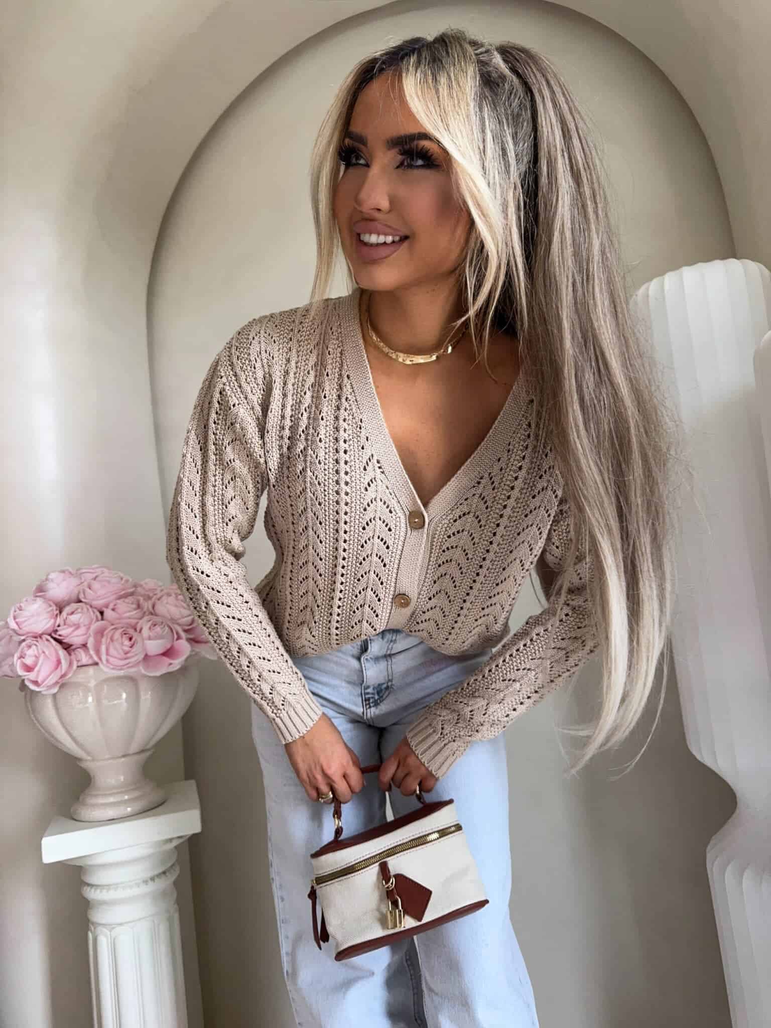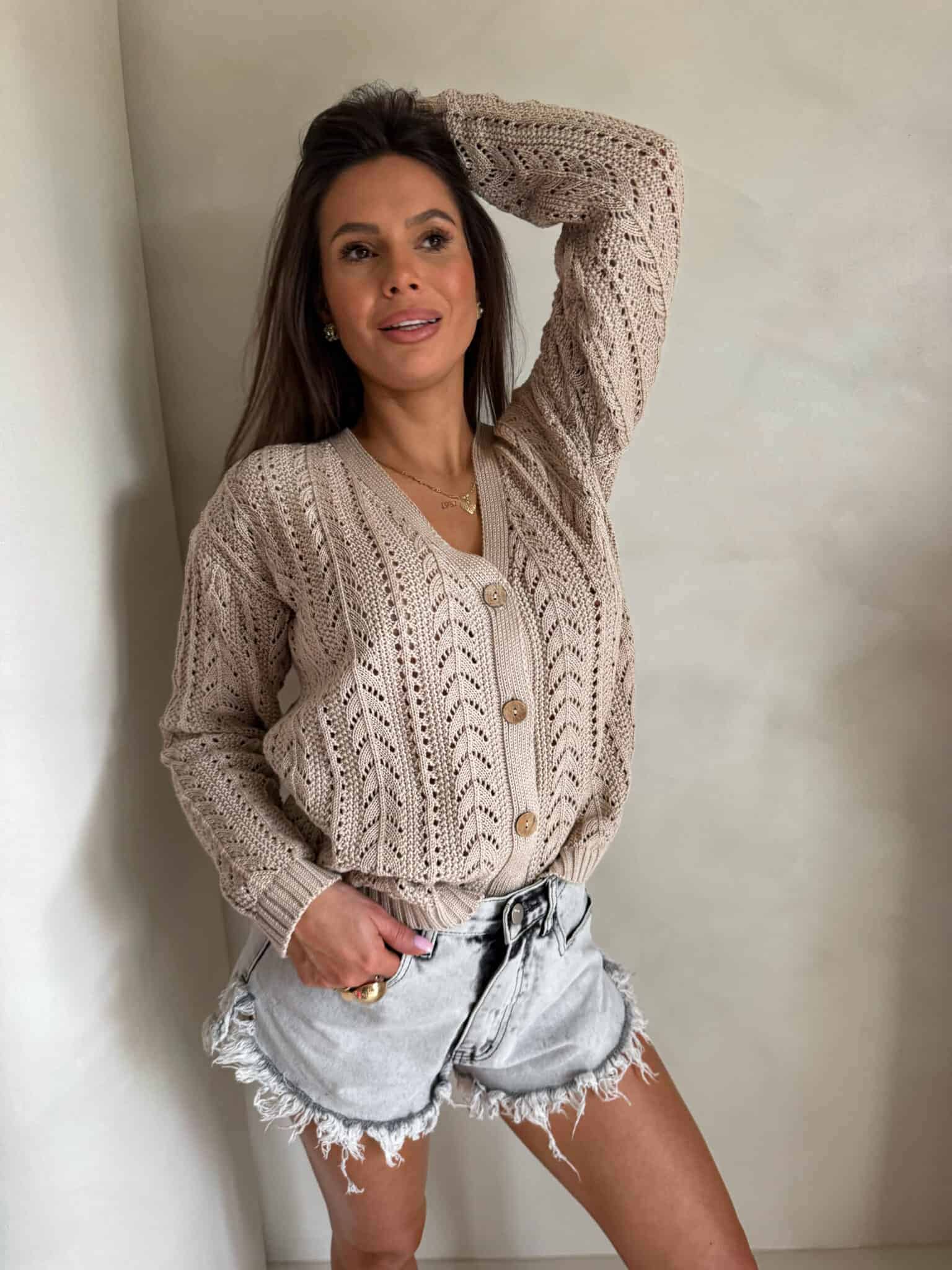 Sweter z dzianiny o ażurowym, dekoracyjnym splocie, który nadaje całości lekkości i subtelnego charakteru. Model o krótkim fasonie z dekoltem w serek, zapinany z przodu na stylowe drewniane guziki. Długie rękawy zakończone są ściągaczami, podobnie jak dół swetra.