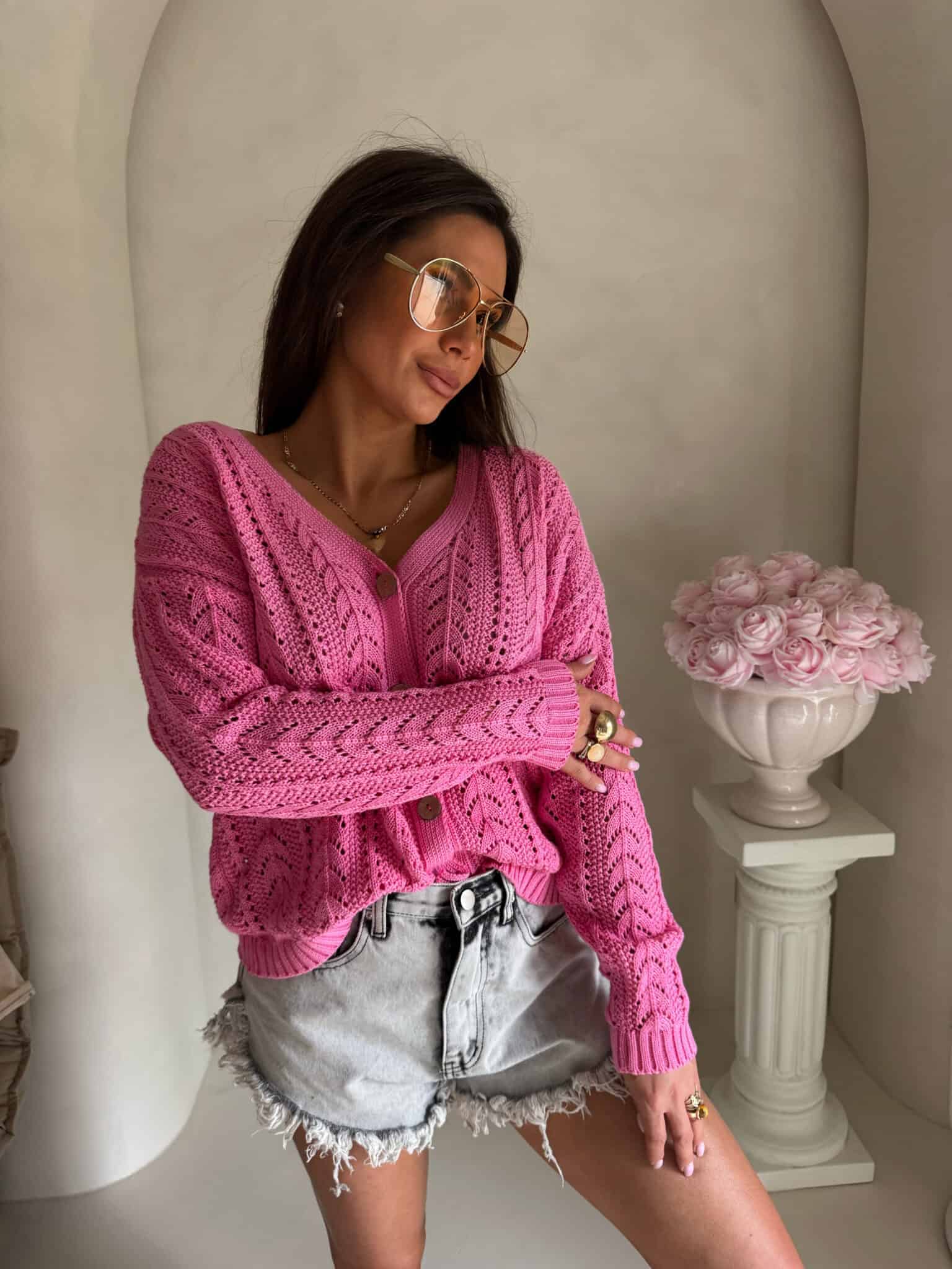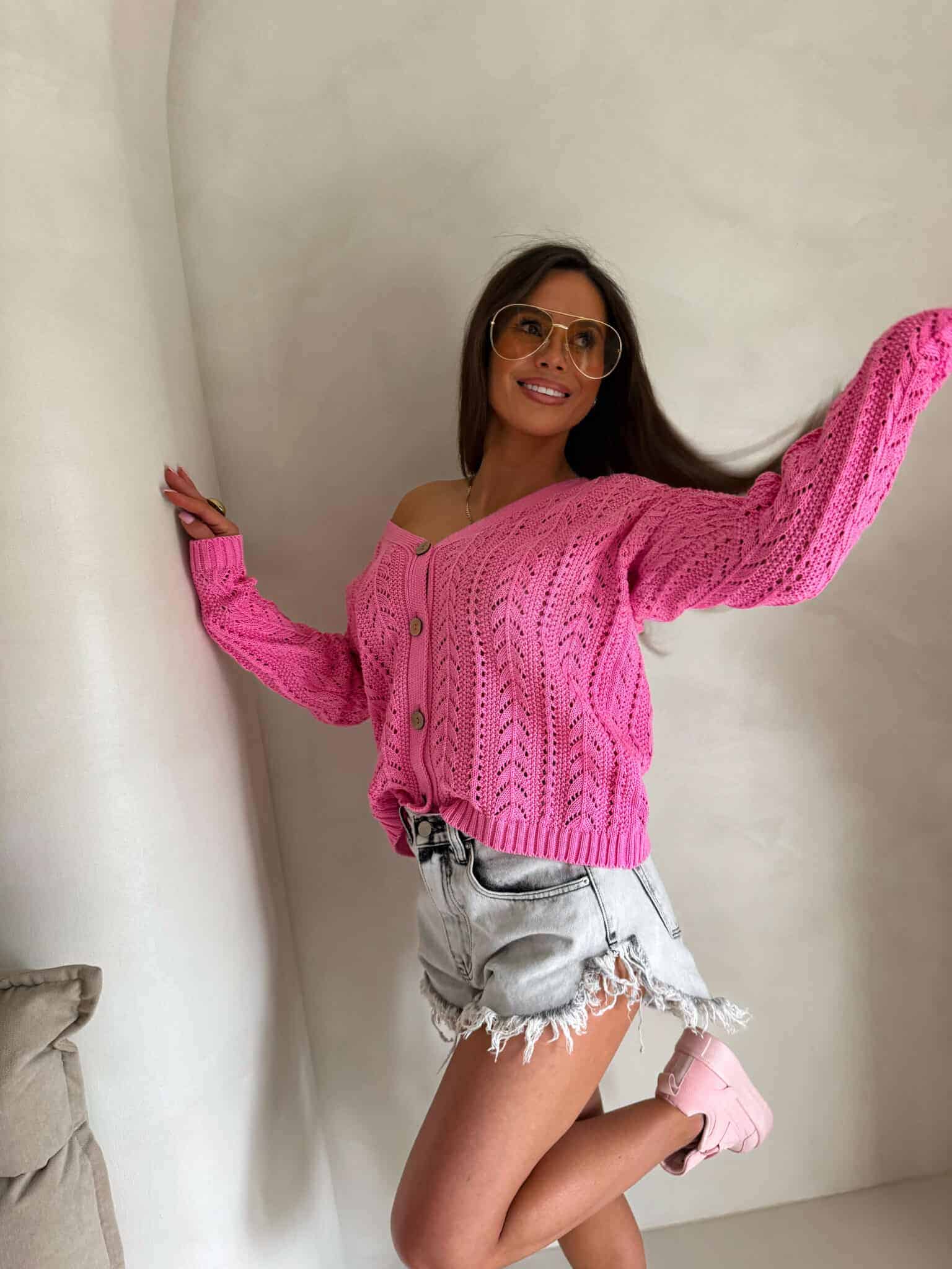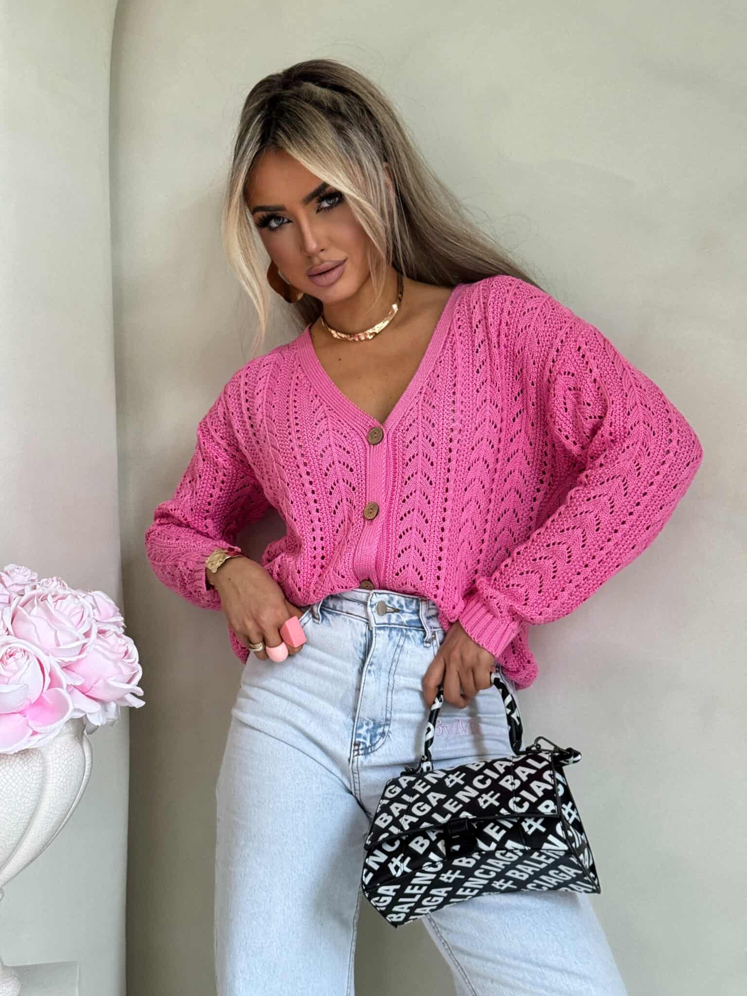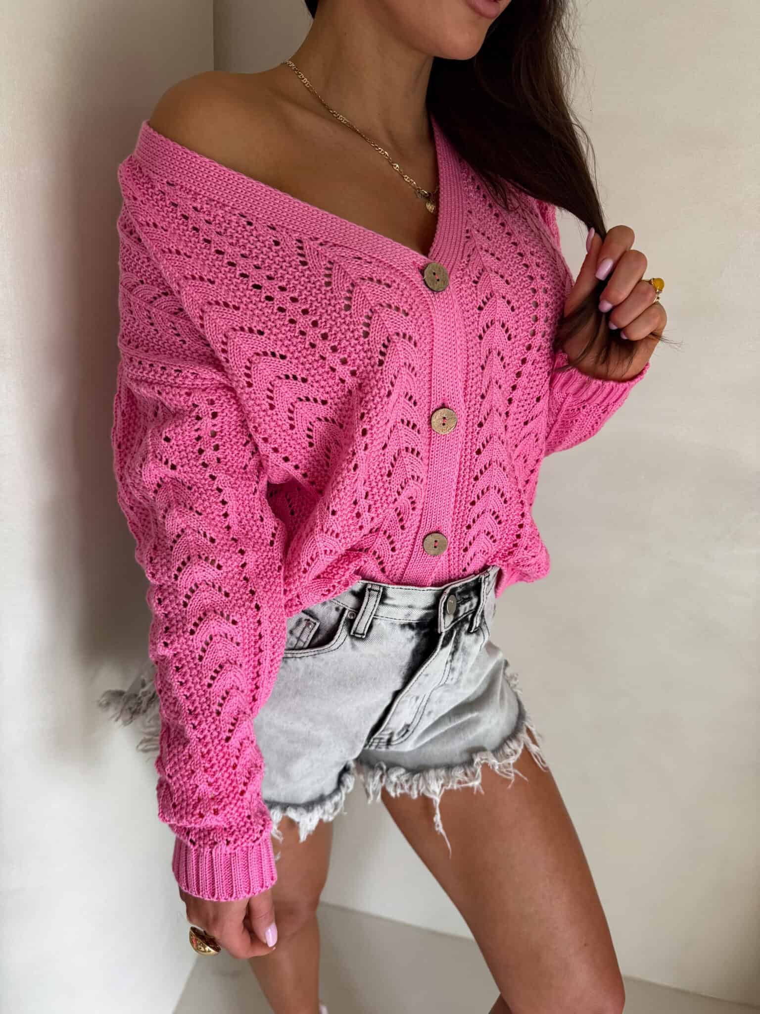 Sweter z dzianiny o ażurowym, dekoracyjnym splocie, który nadaje całości lekkości i subtelnego charakteru. Model o krótkim fasonie z dekoltem w serek, zapinany z przodu na stylowe drewniane guziki. Długie rękawy zakończone są ściągaczami, podobnie jak dół swetra.