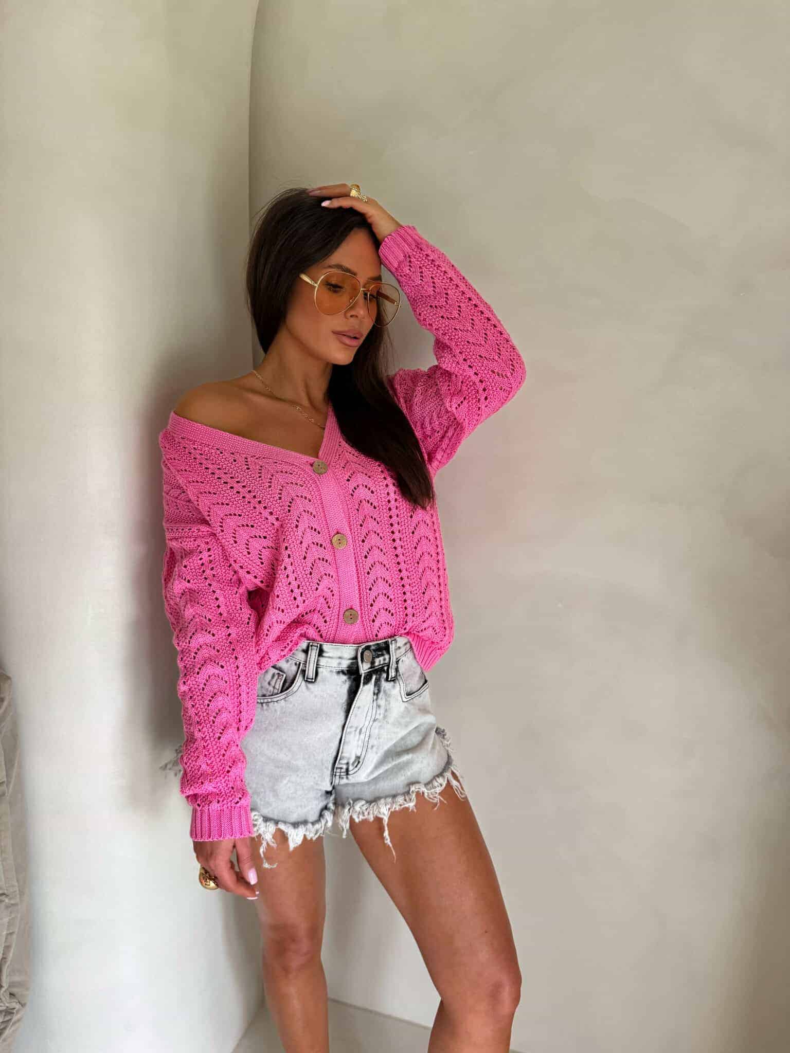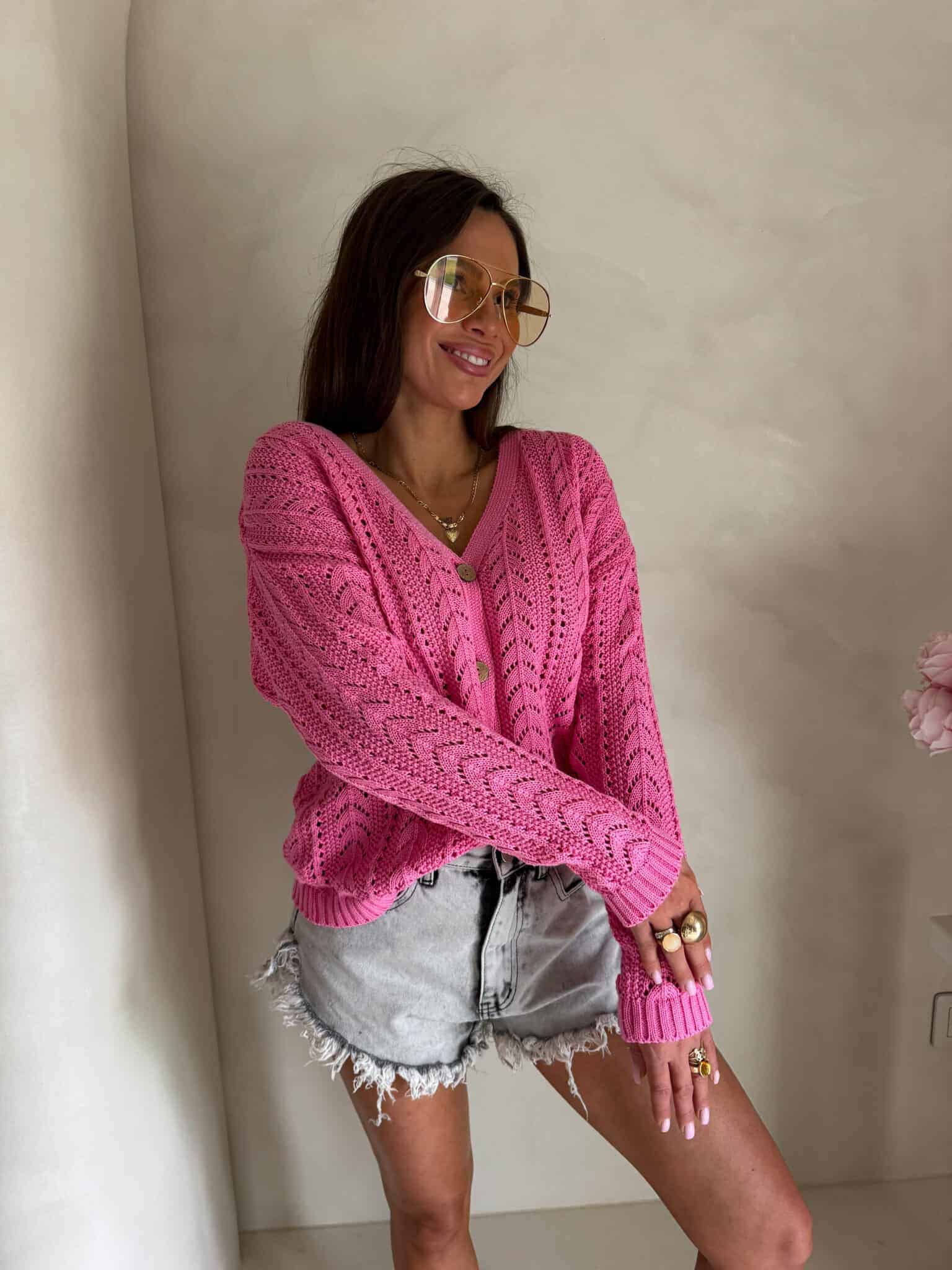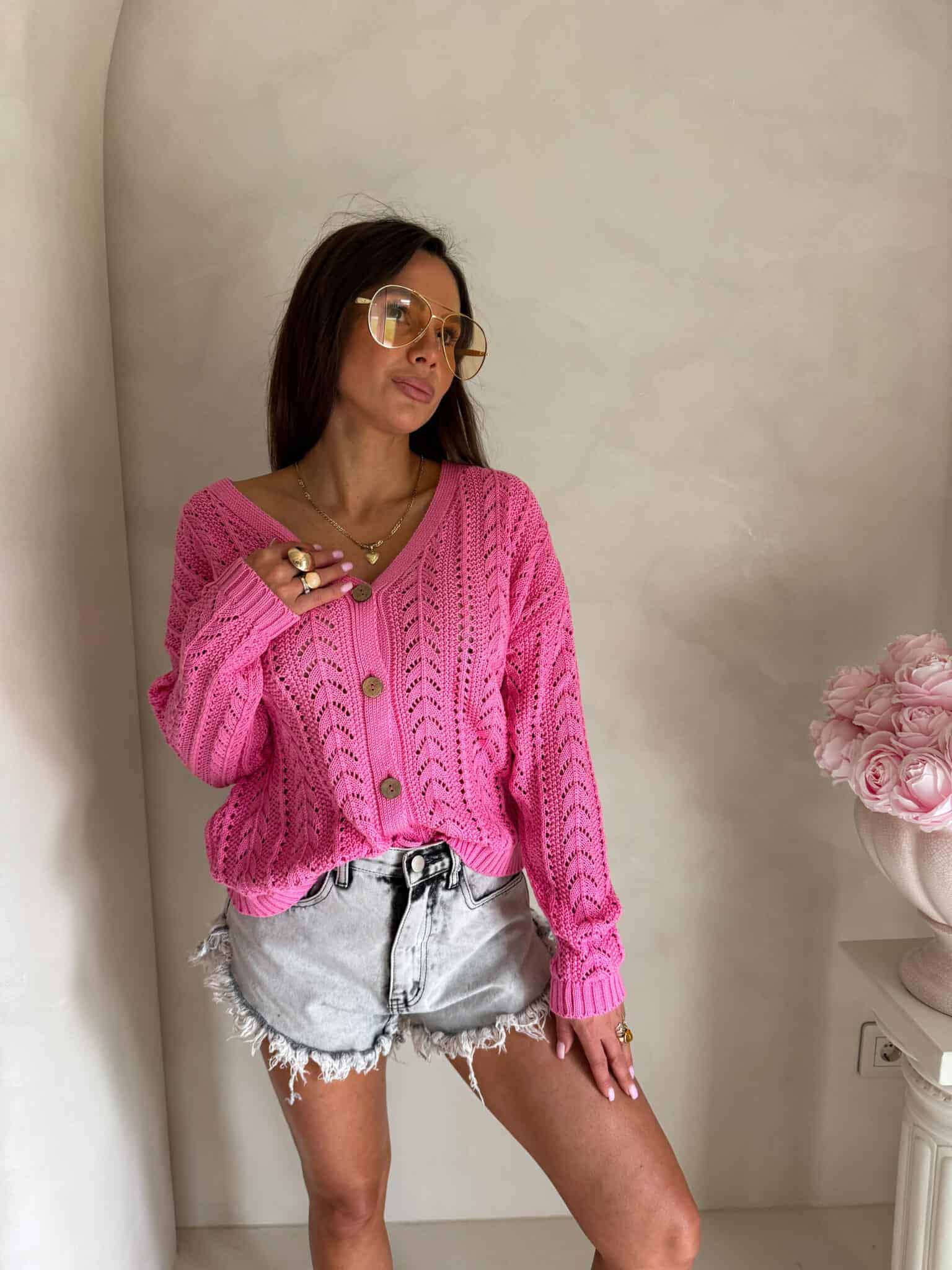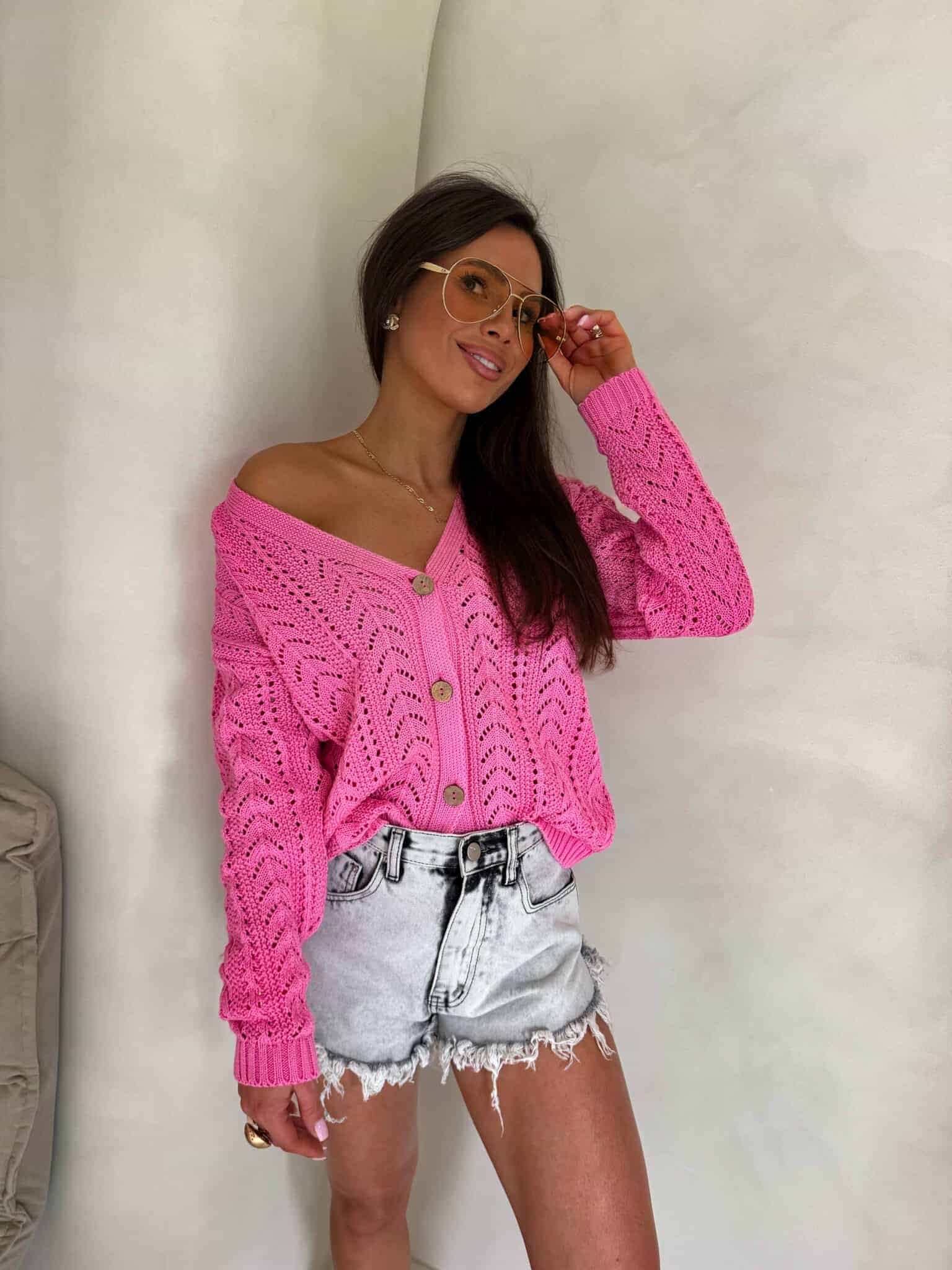 Sweter z dzianiny o ażurowym, dekoracyjnym splocie, który nadaje całości lekkości i subtelnego charakteru. Model o krótkim fasonie z dekoltem w serek, zapinany z przodu na stylowe drewniane guziki. Długie rękawy zakończone są ściągaczami, podobnie jak dół swetra.
