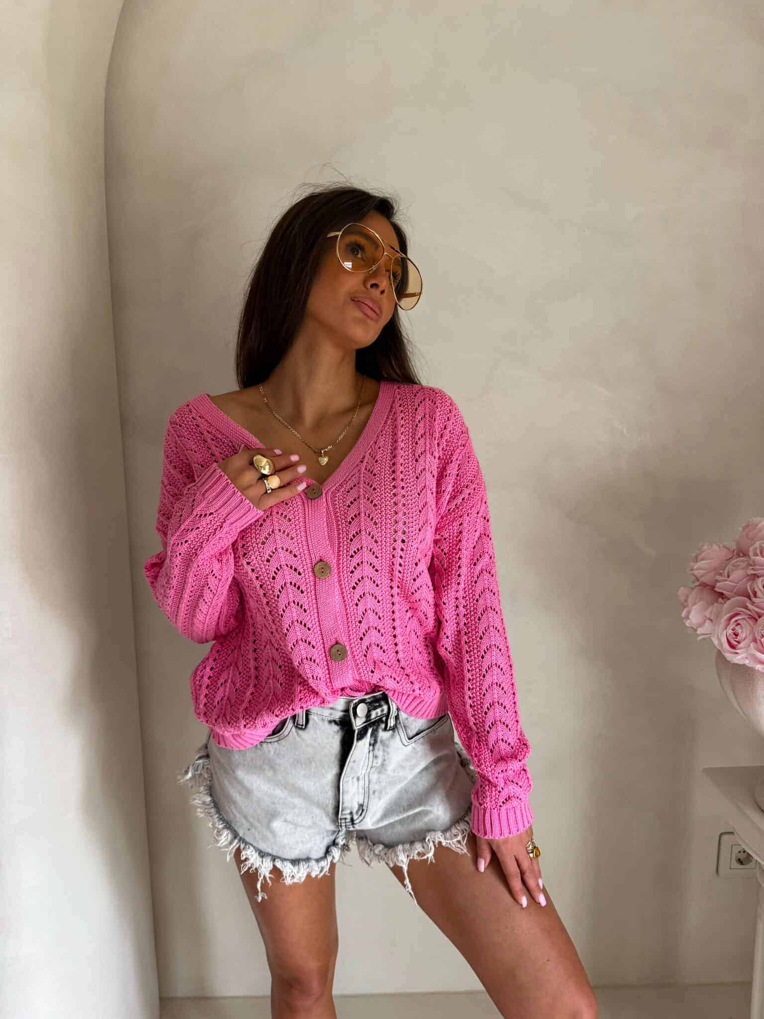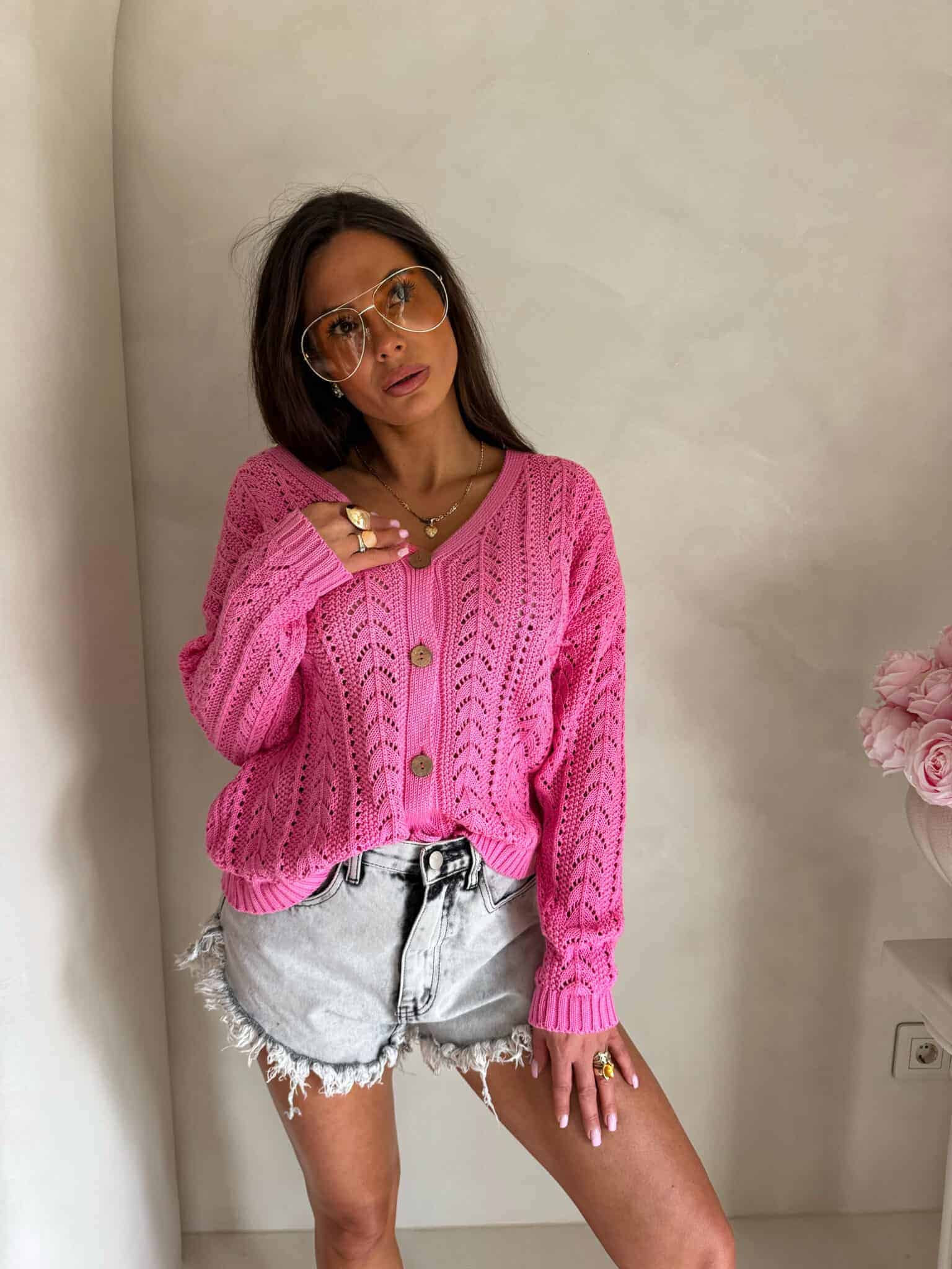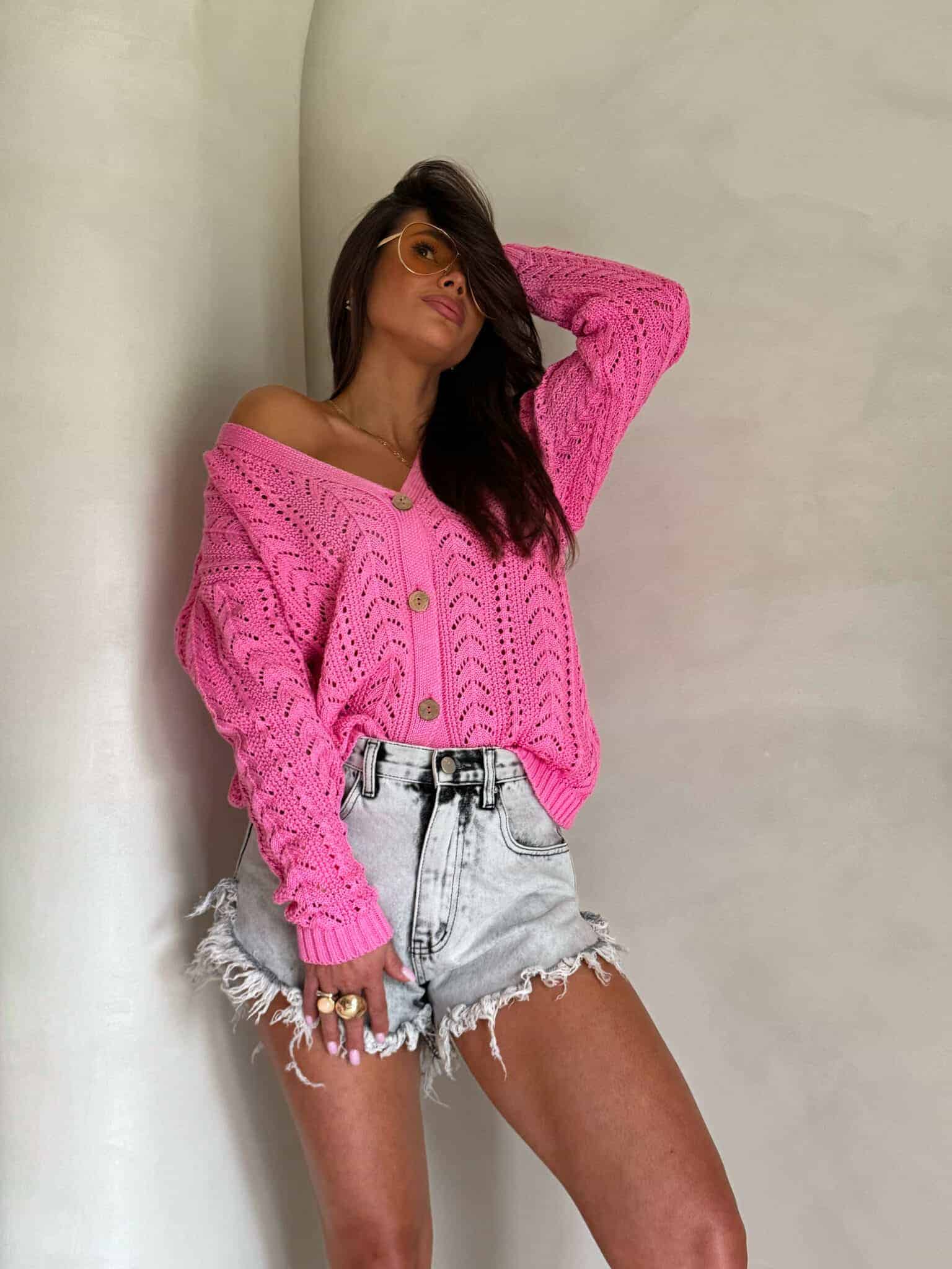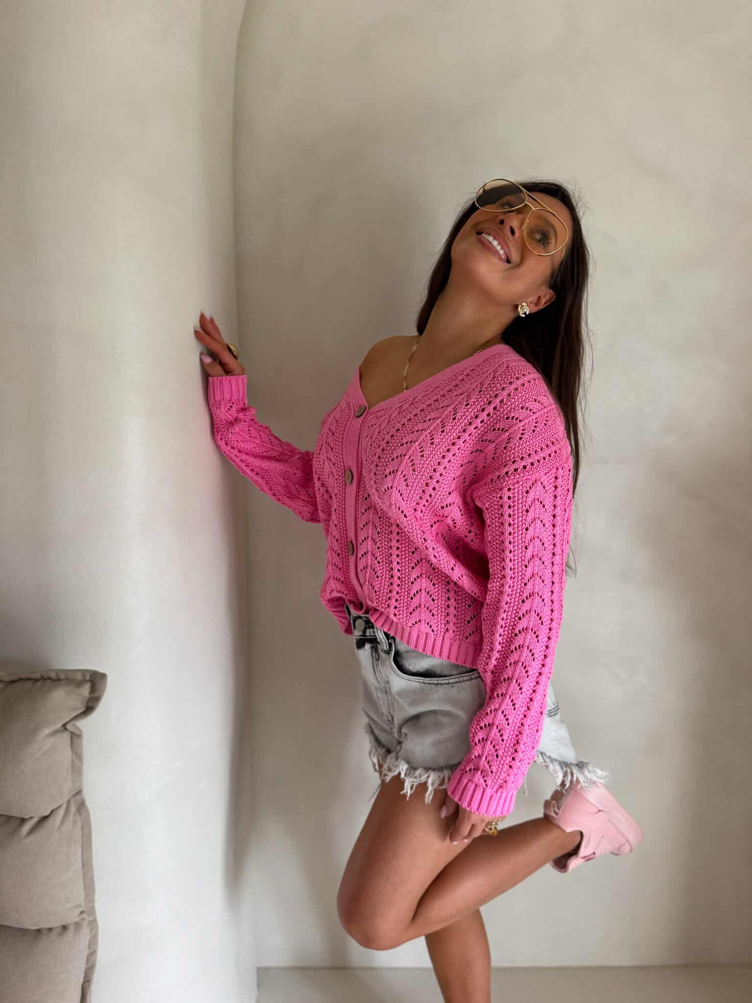 Sweter z dzianiny o ażurowym, dekoracyjnym splocie, który nadaje całości lekkości i subtelnego charakteru. Model o krótkim fasonie z dekoltem w serek, zapinany z przodu na stylowe drewniane guziki. Długie rękawy zakończone są ściągaczami, podobnie jak dół swetra.