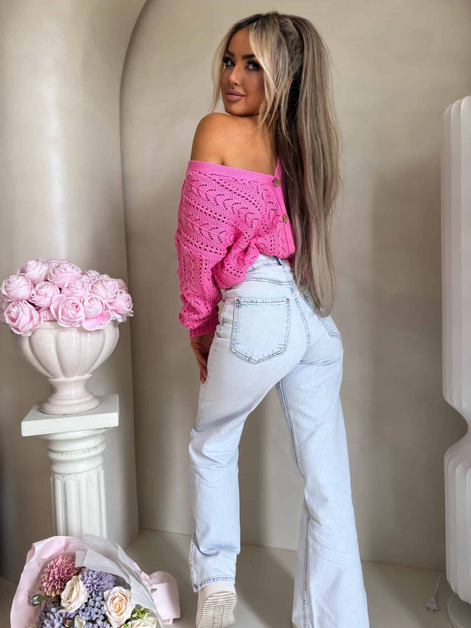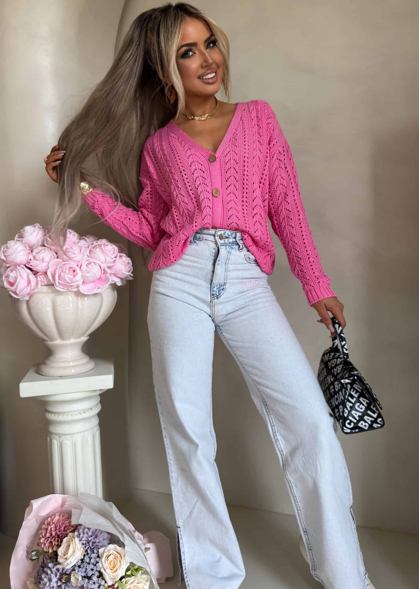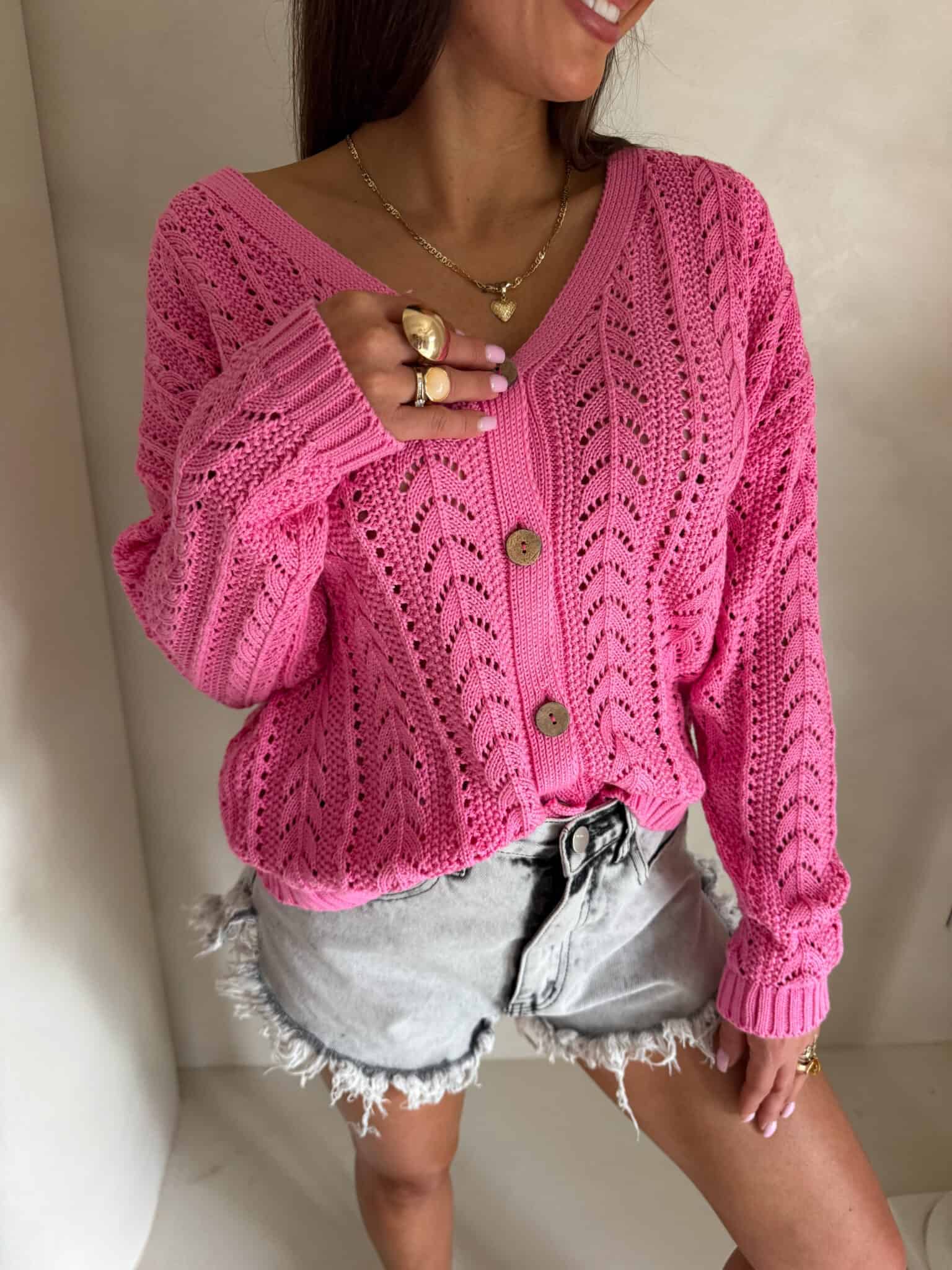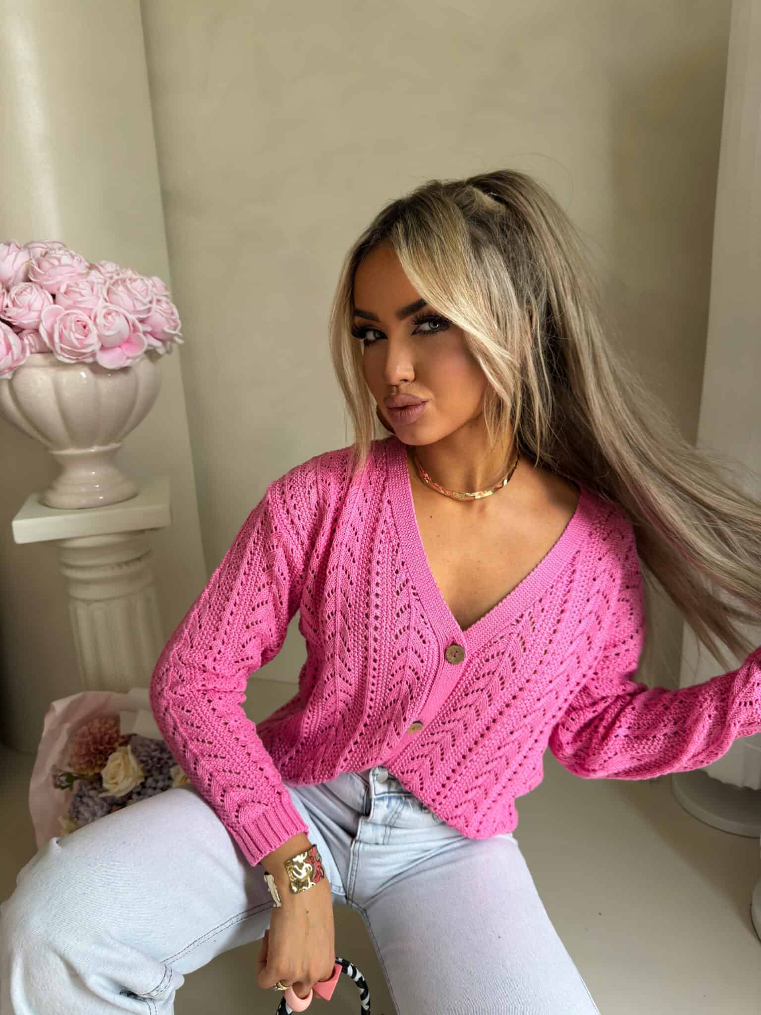Sweter z dzianiny o ażurowym, dekoracyjnym splocie, który nadaje całości lekkości i subtelnego charakteru. Model o krótkim fasonie z dekoltem w serek, zapinany z przodu na stylowe drewniane guziki. Długie rękawy zakończone są ściągaczami, podobnie jak dół swetra.