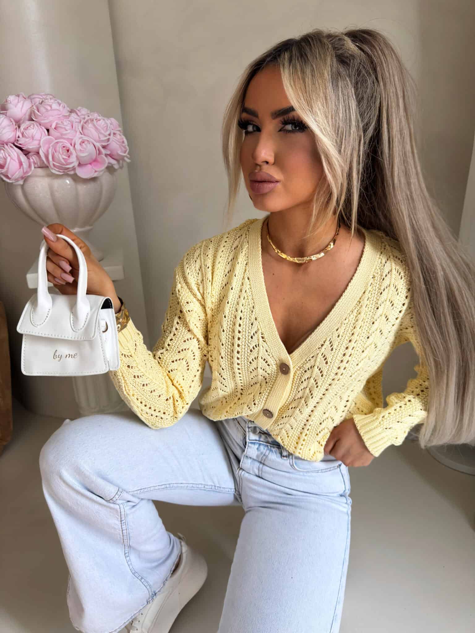 Sweter z dzianiny o ażurowym, dekoracyjnym splocie, który nadaje całości lekkości i subtelnego charakteru. Model o krótkim fasonie z dekoltem w serek, zapinany z przodu na stylowe drewniane guziki. Długie rękawy zakończone są ściągaczami, podobnie jak dół swetra.